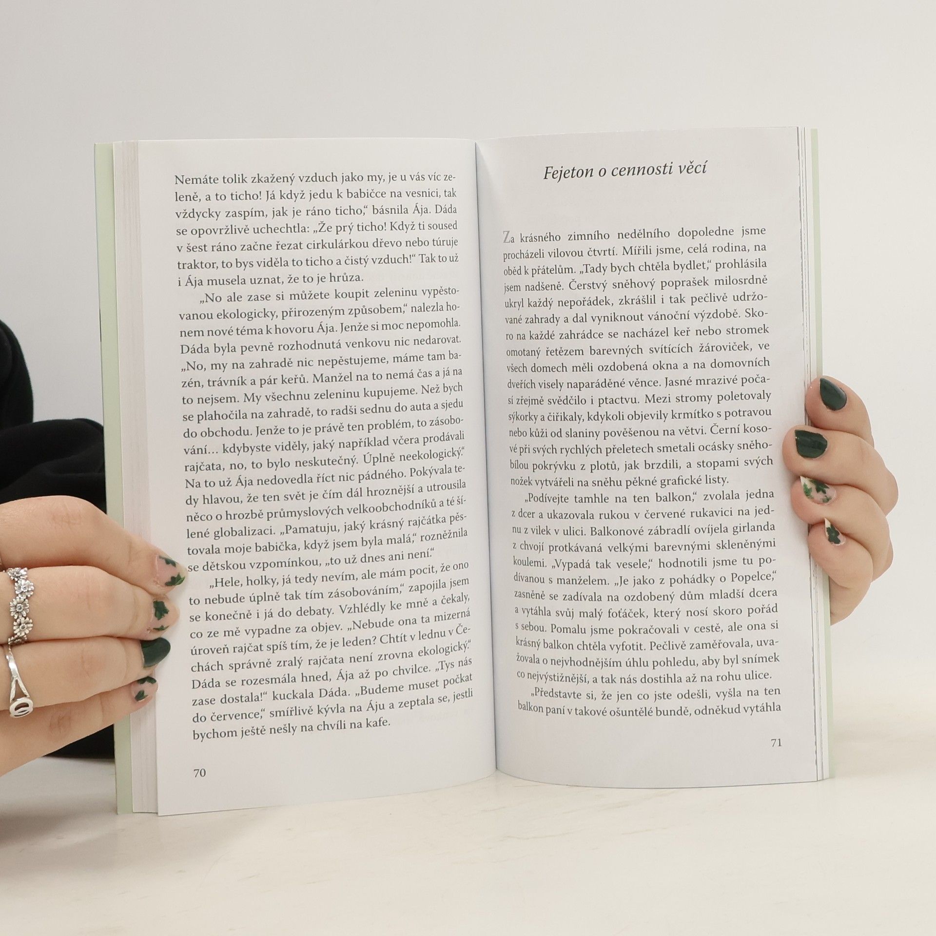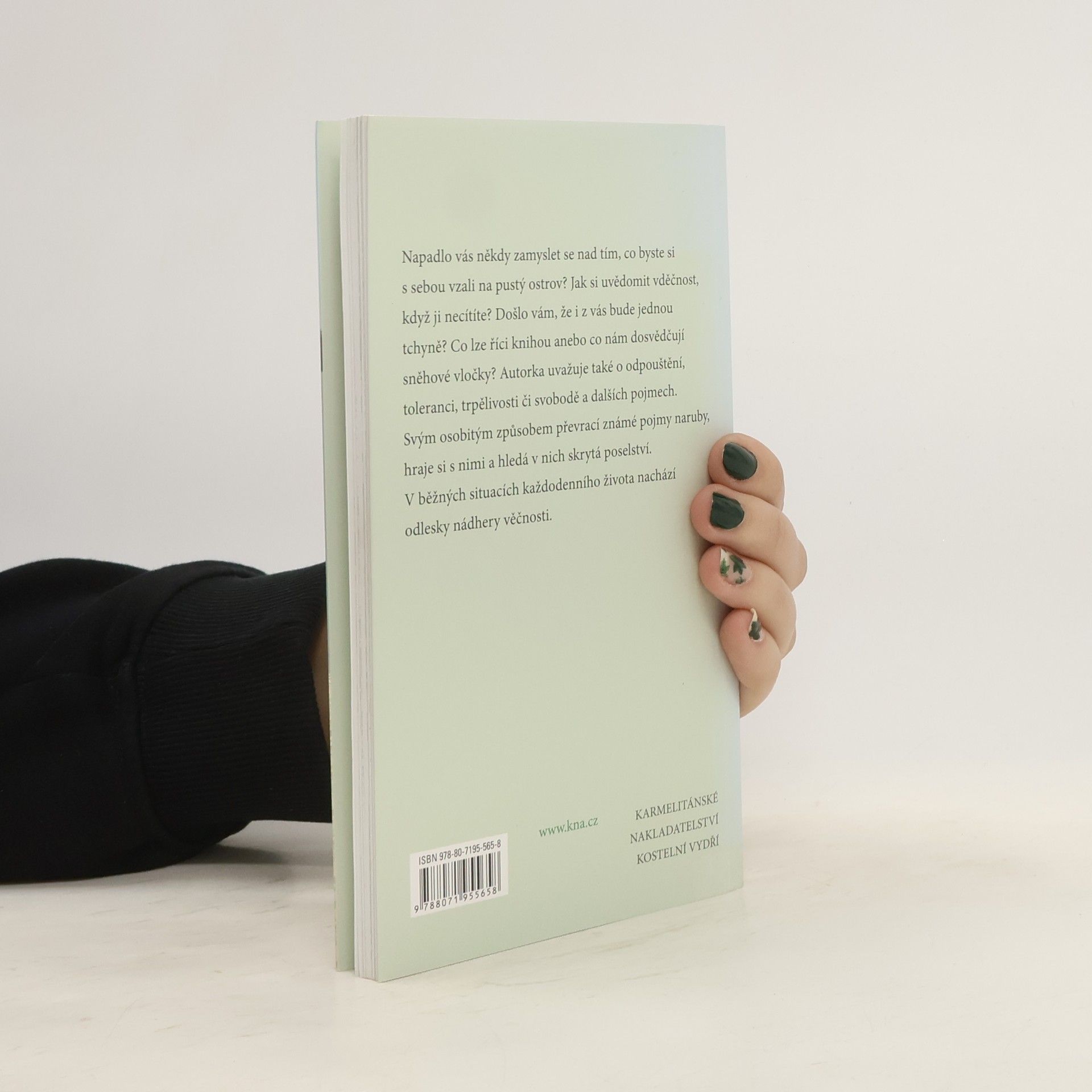 Napadlo vás někdy zamyslet se nad tím, co byste si s sebou vzali na pustý ostrov? Jak si uvědomit vděčnost, když ji necítíte? Došlo vám, že i z vás bude jednou tchyně? Co lze říci knihou anebo co nám dosvědčují sněhové vločky? Autorka uvažuje také o odpouštění, toleranci, trpělivosti či svobodě a dalších pojmech. Svým osobitým způsobem převrací známé pojmy naruby, hraje si s nimi a hledá v nich skrytá poselství. V běžných situacích každodenního života nachází odlesky nádhery věčnosti.