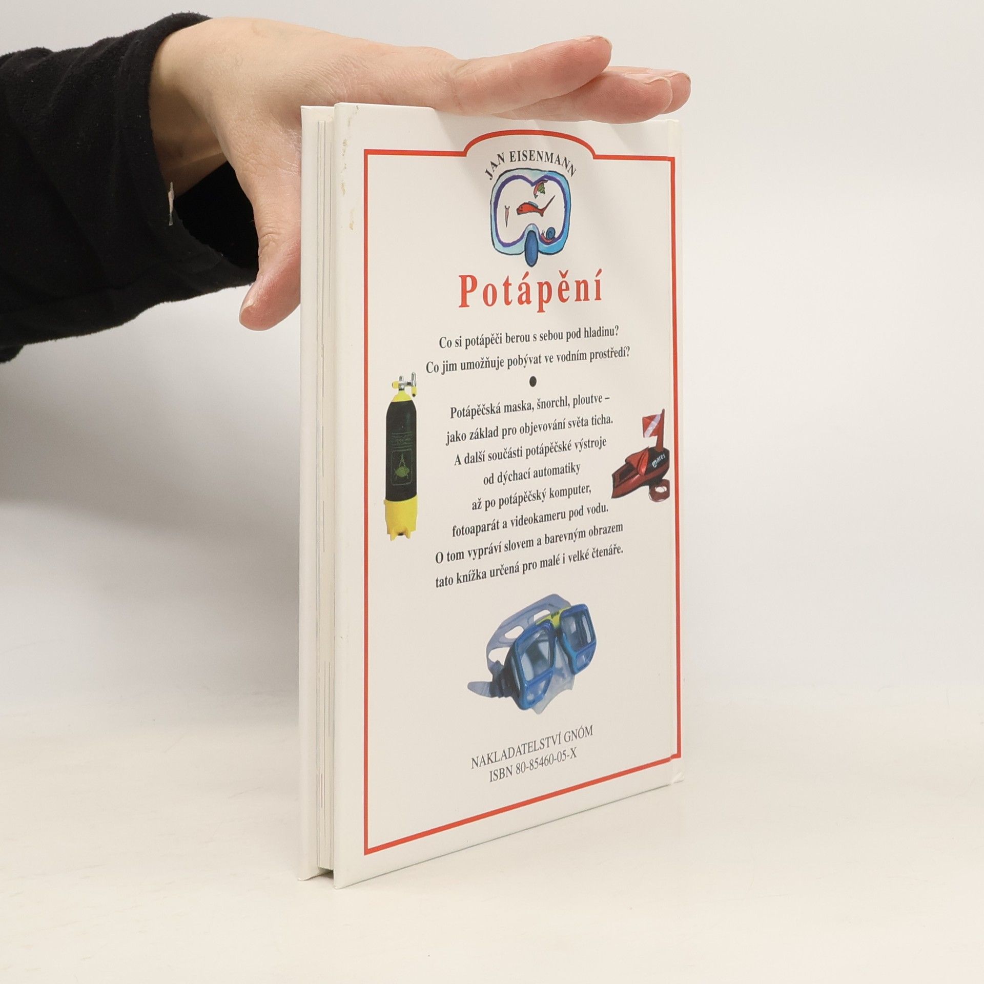 Populární kniha pro děti přibližuje a popisuje jednotlivé součásti vybavení pro potápěče. Stručně, s doprovodnými fotografiemi a obrázky, se seznámíme s vybavením od dýchací trubice, ploutví a ochranného obleku, přes např. svítilnu, nůž a hloubkoměr, až k fotoaparátům a kamerám určeným pro práci pod vodou. Kniha slouží k prvnímu seznámení s prostorem.