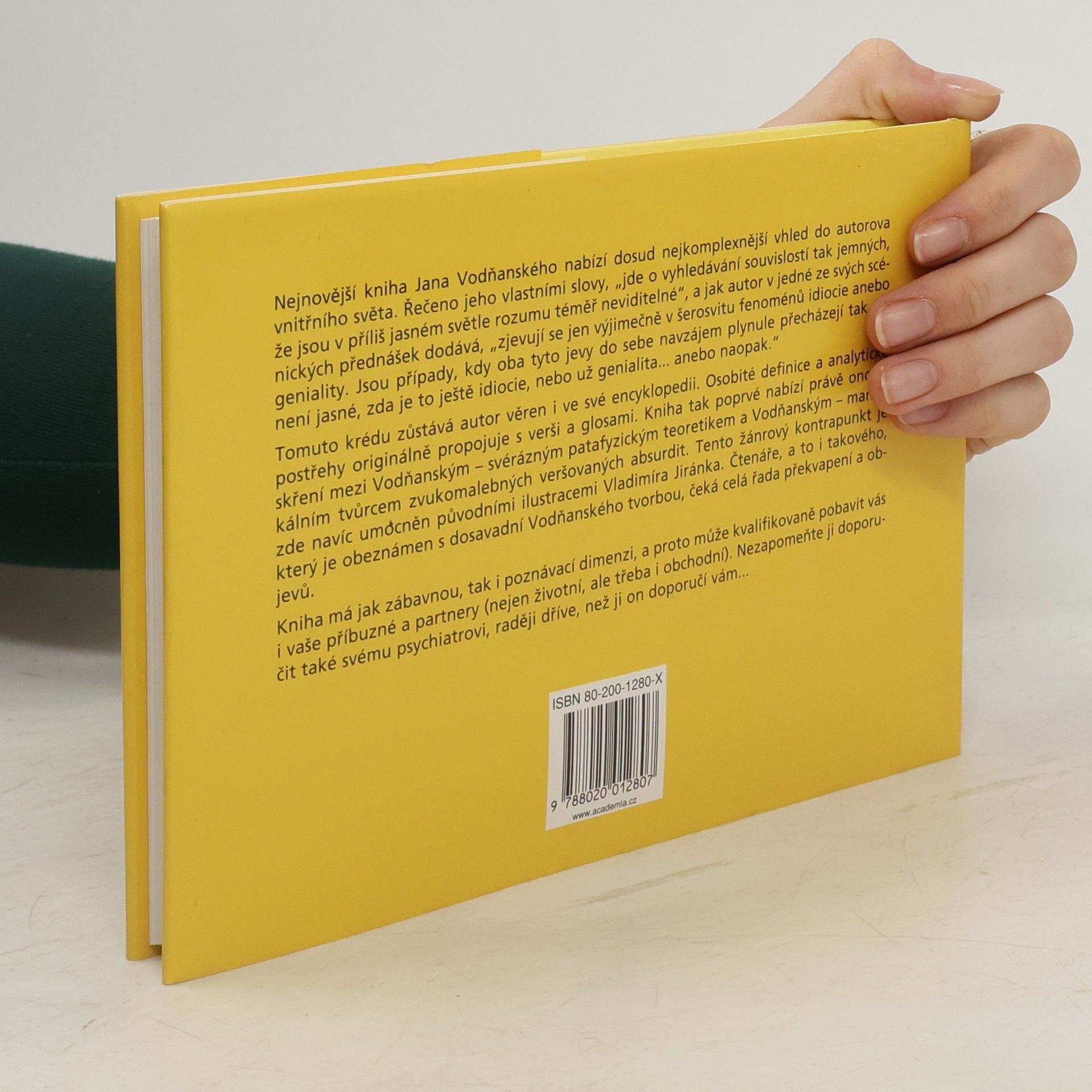 Nejnovější kniha Jana Vodňanského nabízí dosud nejkomplexnější vhled do autorova vnitřního světa. Řečeno jeho vlastními slovy, "jde o vyhledávání souvislostí tak jemných, že jsou v příliš jasném světle rozumu téměř neviditelné", a jak autor v jedné ze svých scénických přednášek dodává, "zjevují se jen výjimečně v šerosvitu fenoménů idiocie anebo geniality. Jsou případy, kdy oba tyto jevy do sebe navzájem plynule přecházejí tak, že není jasné, zda je to ještě idiocie, nebo už genialita... anebo naopak." Tomuto krédu zůstává autor věren i ve své encyklopedii. Osobité definice a analytické postřehy originálně propojuje s verši a glosami. Kniha tak poprvé nabízí právě ono jiskření mezi Vodňanským - svérázným patafyzickým teoretikem a Vodňanským - maniakálním tvůrcem zvukomalebných veršovaných absurdit. Tento žánrový kontrapunkt je zde navíc umocněn původními ilustracemi Vladimíra Jiránka. Čtenáře, a to i takového, který je obeznámen s dosavadní Vodňanského tvorbou, čeká celá řada překvapení a objevů. Kniha má jak zábavnou, tak i poznávací dimenzi, a proto může kvalifikovaně pobavit vás i vaše příbuzné a partnery (nejen životní, ale třeba i obchodní). Nezapomeňte ji doporučit také svému psychiatrovi, raději dříve, než ji on doporučí vám...
