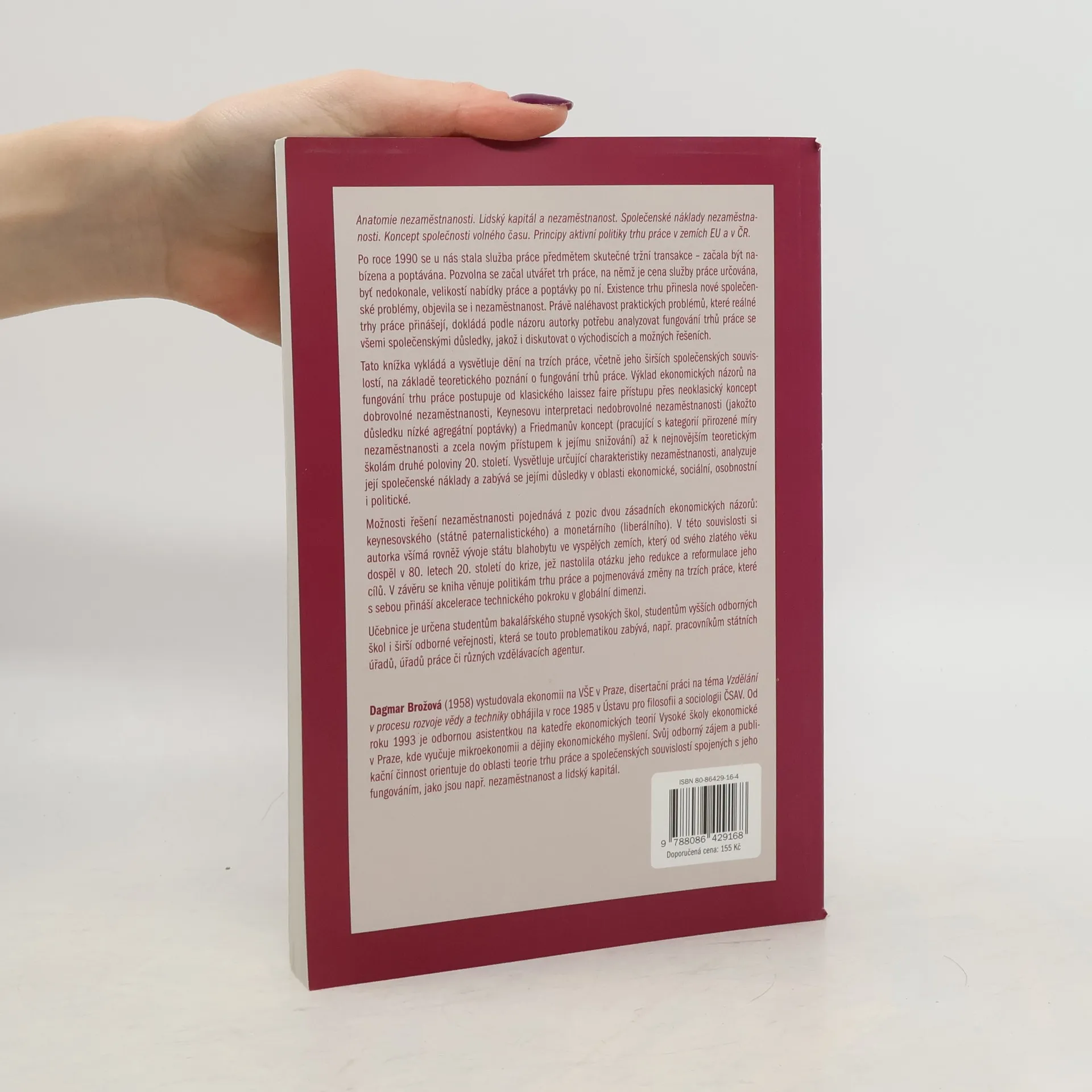 Tato knížka vykládá a vysvětluje dění na trzích práce, včetně jeho širších společenských souvislostí, na základě teoretického poznání o fungování trhů práce. Výklad ekonomických názorů na fungování trhu práce postupuje od klasického laissez faire přístupu přes neoklasický koncept dobrovolné nezaměstnanosti, Keynesovu interpretaci nedobrovolné nezaměstnanosti (coby důsledku nízké agregátní poptávky) a Friedmanův koncept (pracující s kategorií přirozené míry nezaměstnanosti a zcela novým přístupem k jejímu snižování) až k nejnovějším teoretickým školám druhé poloviny 20. století. Vysvětluje určující charakteristiky nezaměstnanosti, analyzuje její společenské náklady a zabývá se jejími důsledky v oblasti sociální, osobnostní i politické. Možnosti řešení nezaměstnanosti pojednává z pozic dvou zásadních ekonomických názorů: keynesovského (státně paternalistického) a monetárního (liberálního).