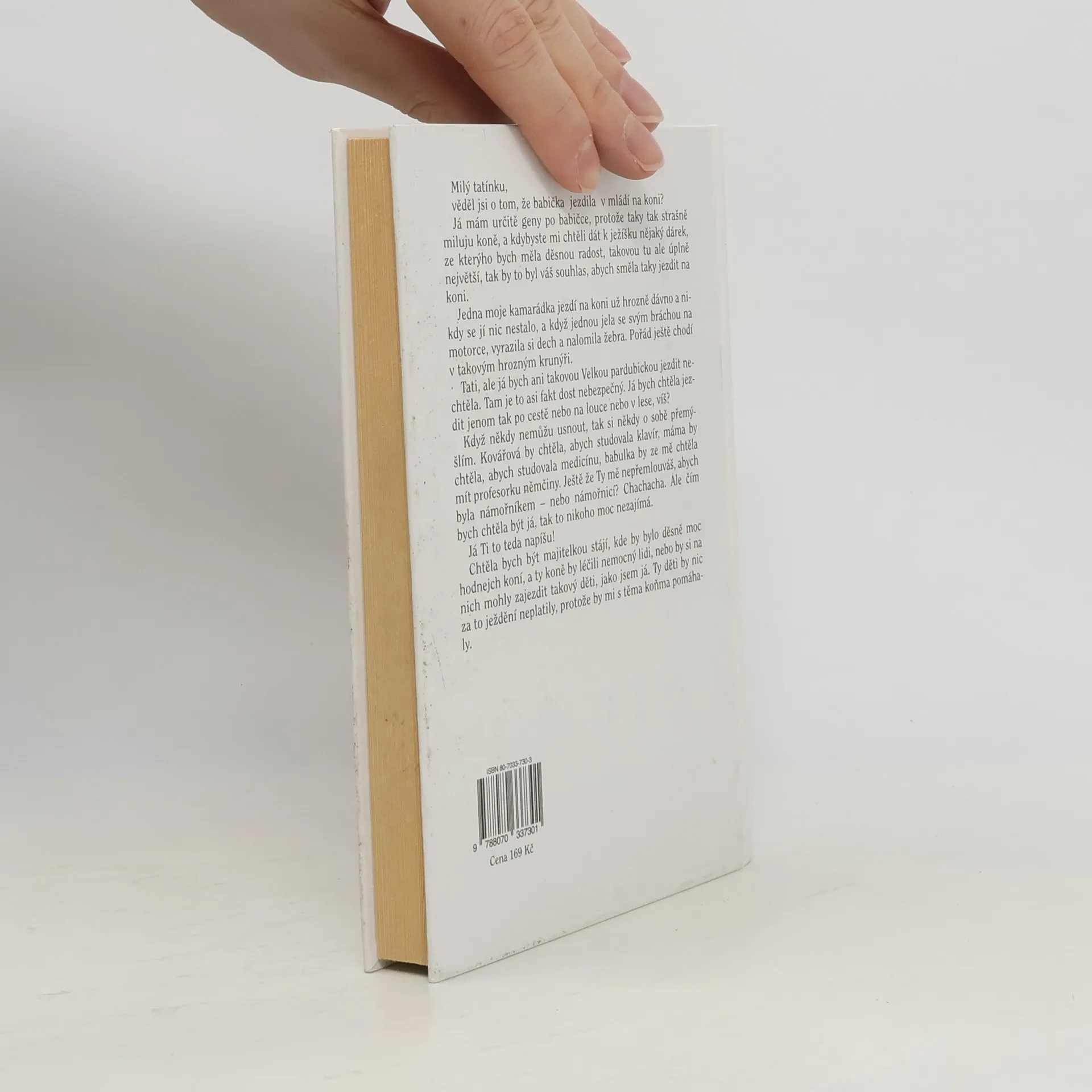 Milý tatínku, věděl jsi, že babička jezdila v mládí na koni? Já mám určité geny po babičce, protože taky tak strašně miluju koně a kdybyste mi chtěli dát k ježíšku nějaký dárek ze kterýho bych měla děsnou radost, takovou tu ale úplně největší, tak by to byl váš souhlas abych taky směla jezdit na koni. Jedna moje kamarádka jezdí na koni už hrozně dávno a nikdy se jí nic nestalo, a když jela jednou se svým bráchou na motorce, vyrazila si dech a nalomila žebra. Pořád ještě chodí v takovým hrozným krunýři. Tati, ale já bych takovou Velkou pardubickou jezdit nechtěla. Tam je to asi fakt dost nebezpečný. Já bych chtěla jezdit jenom tak po cestě nebo po louce nebo v lese víš? Když někdy nemůžu usnout, tak si tak o sobě přemýšlím. Kovářová by chtěla abych studovala klavír, máma by chtěla abych studovala medicínu a babulka by ze mě chtěla mít profesorku němčiny. Ještě, že ty mě nepřemlouváš, abych byla námořníkem nebo námořnicí? Chachacha. Ale čím bych chtěla být já, tak to nikoho moc nezajímá. Já ti to teda napíšu! Chtěla bych být majitelkou stájí, kde by bylo děsně moc hodnejch koní, a ty koně by léčili nemocný lidi, nebo by si na nich mohly zajezdit takový děti jako jsem já. Ty děti by za to ježdění nic neplatily, protože by mi s těma koňma pomáhaly. Zdroj kniha.