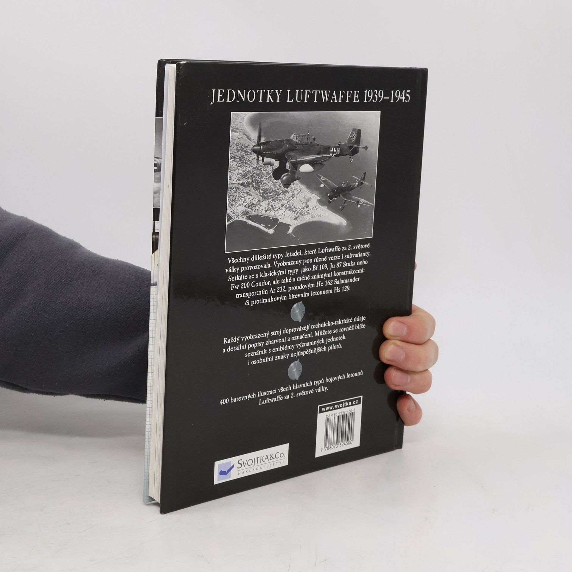 Všechny důležité typy letadel, které Luftwaffe za 2.světové války provozovala. Vyobrazeny jsou různé verze i subvariaty. Setkáte se s klasickými typy Bf 109, Ju 87 Stuka nebo Fw 200 Condor, ale také s méně známými konstrukcemi: transportním Ar 232, proudovým He 162 Salamander či protitankovým bitevním letounem Hs 129. Každý vyobrazený stroj doprovázejí technicko-taktické údaje a detailní popisy zbarvení a označení. Můžete se rovněž blíže seznámit s emblémy významných jednotek i osobními znaky nejúspěšnějších pilotů. 400 barevných ilustrací všech hlavních typů bojových letounů Luftwaffe za 2. světové války.