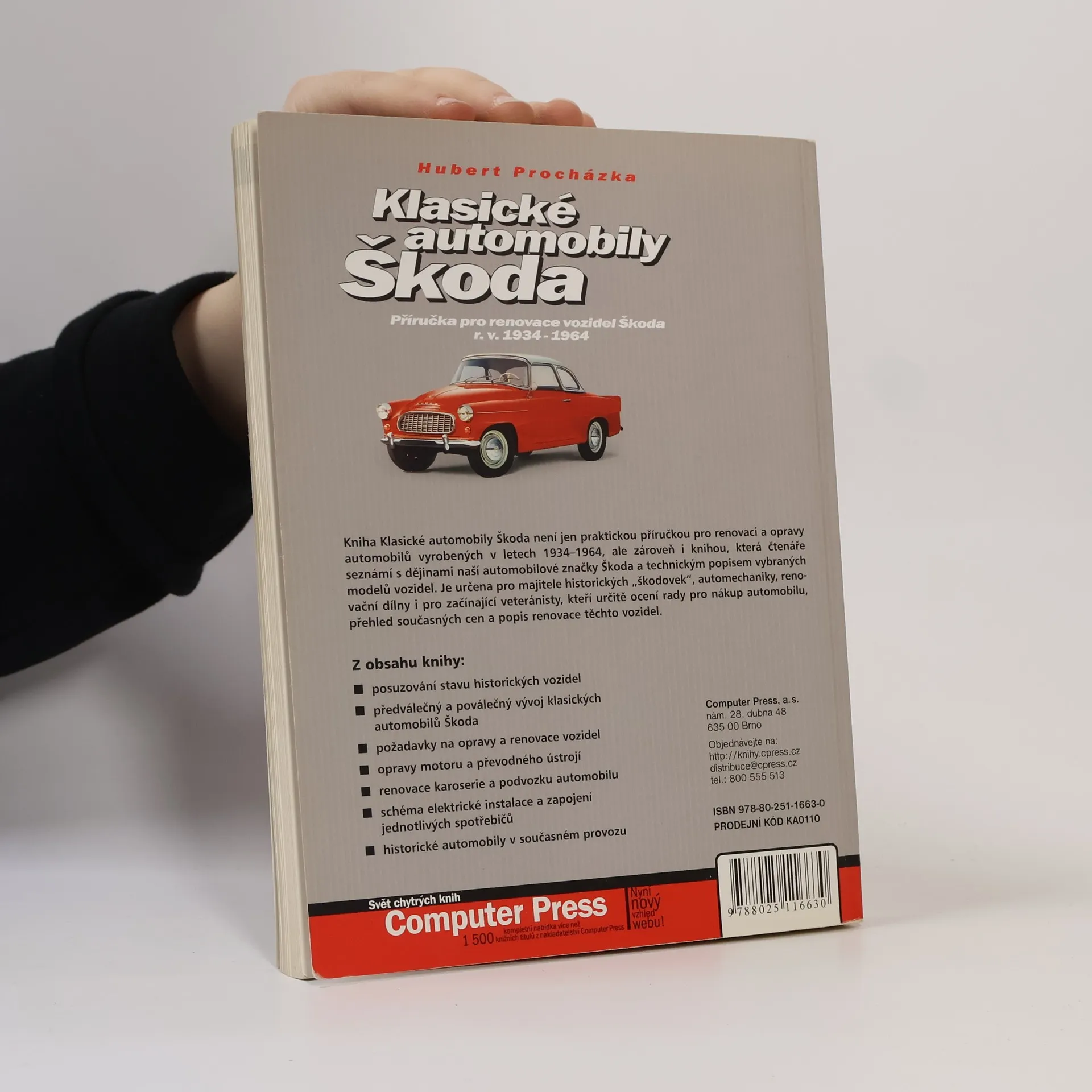 Jedinečná kniha na našem trhu, pojednávající o renovaci a restaurování automobilů Škoda. Není však jen dílenskou příručkou, ale zároveň i encyklopedií, která seznámí čtenáře s dějinami české automobilové značky Škoda. Je určena nejen pro začátečníky, kteří ocení zejména rady pro nákup veterána, přehled prodejních cen a popis renovace, ale i pro profesionální renovační dílny a automechaniky.