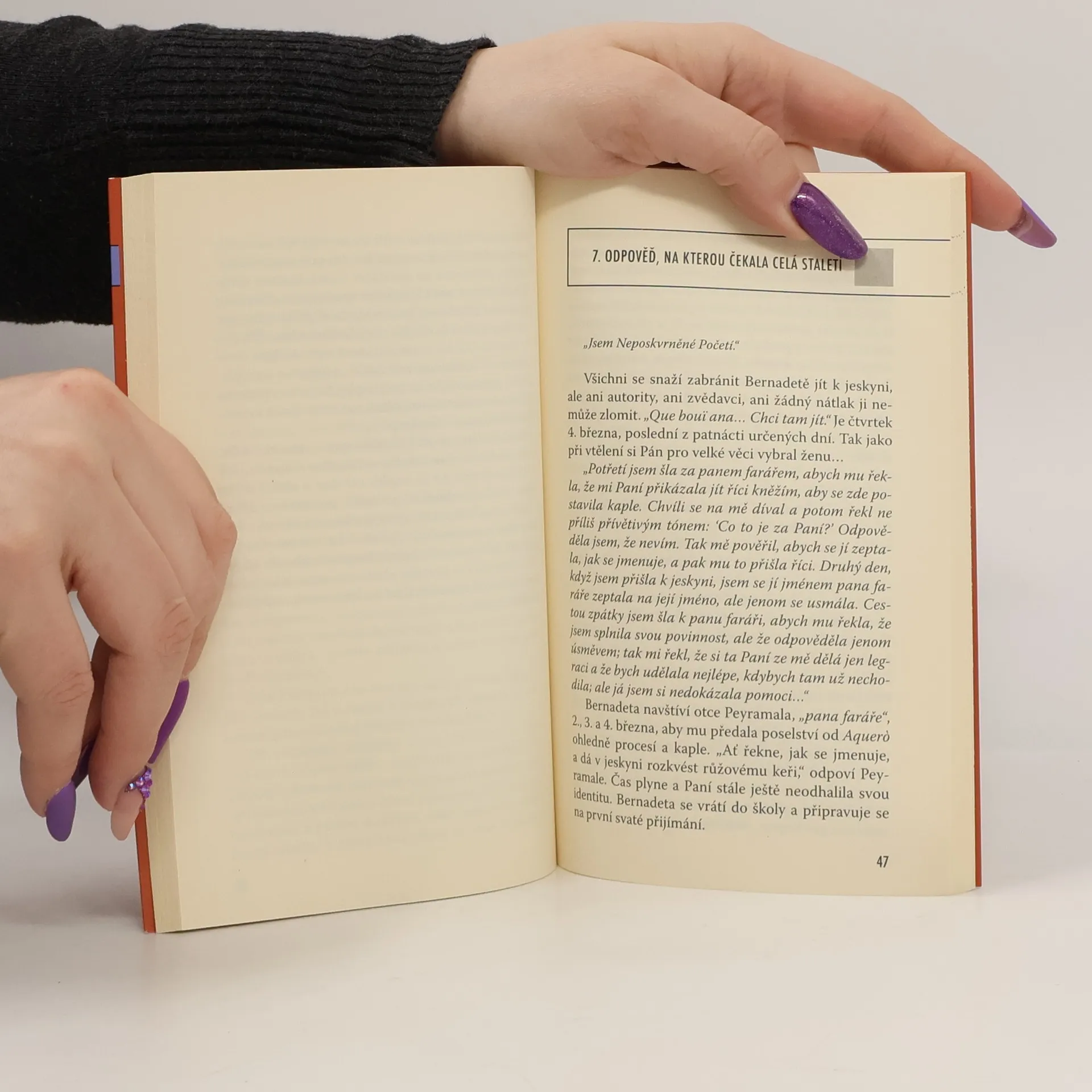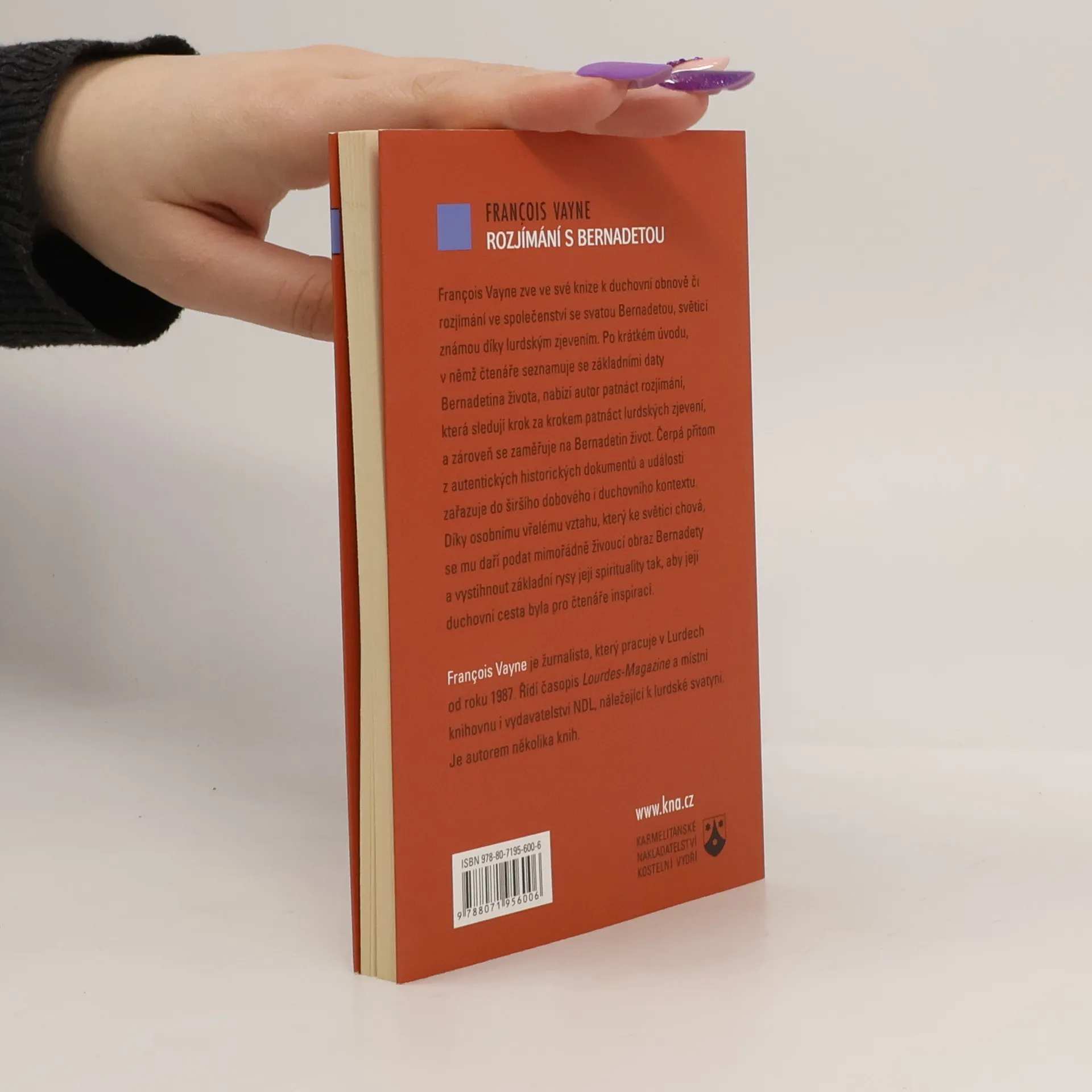 Francios Vayne zve ve své knize k duchovní obnově či rozjímání se svatou Bernadetou, světicí známou díky lurdským zjevením. Po krátkém úvodu, v němž čtenáře seznamuje se základními daty Bernadetina života, nabízí autor patnáct rozjímání, která sledují krok za krokem patnáct lurdských zjevení, a zároveň se zaměřuje na Bernadetin život. Čerpá přitom z autentických historických dokumentů a událostí zařazuje do širšího dobového i duchovního kontextu. Díky osobnímu vřelému vztahu, který ke světici chová, se mu daří podat mimořádně živoucí obraz Bernadety a vystihnout základní rysy její spirituality tak, aby její duchovní cesta byla pro čtenáře inspirací.