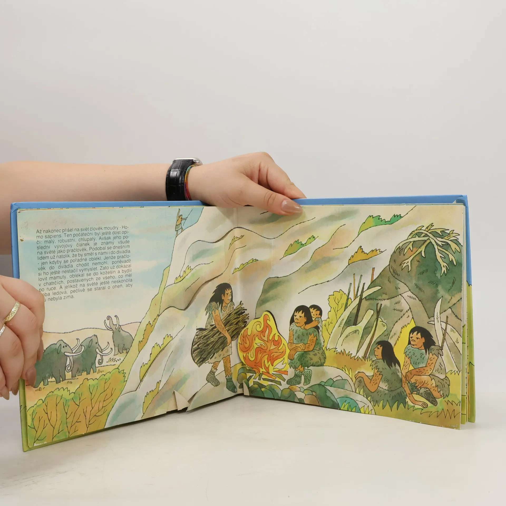 Prostorové leporelo s krátkými texty na každé stránce vyprávějí o vývoji člověka od opic po dobu železnou.