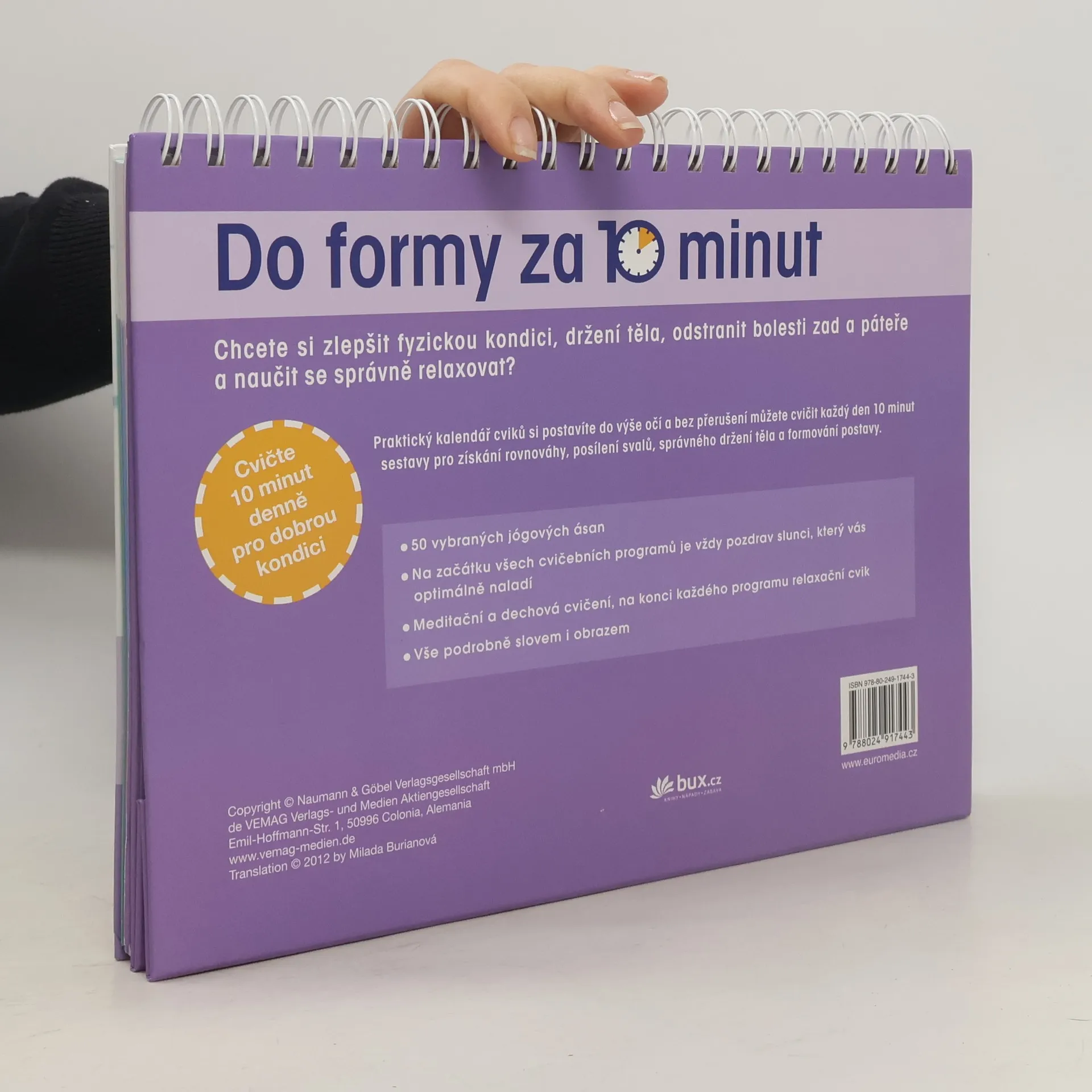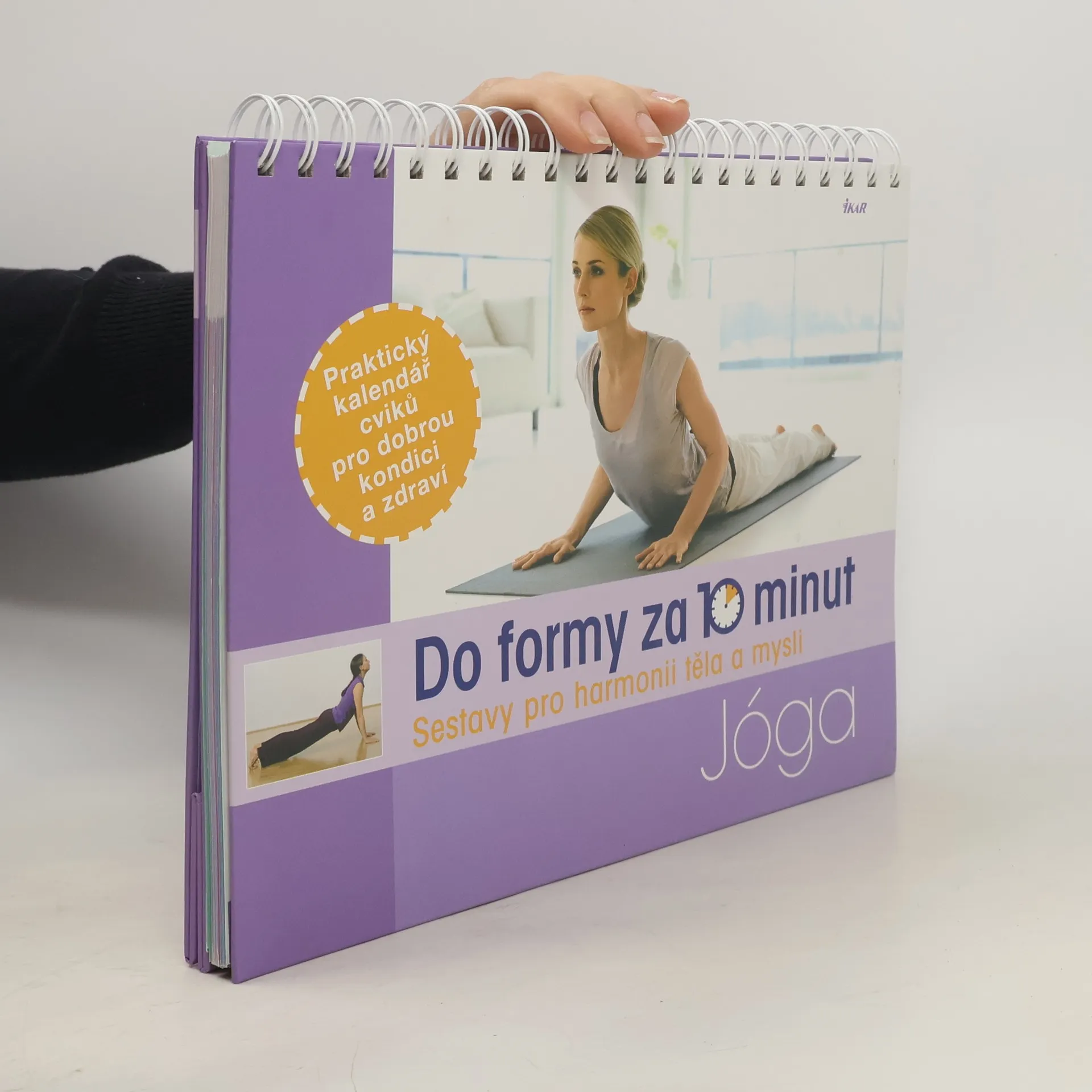 Praktický kalendář cviků pro dobrou kondici a zdraví. Chcete si zlepšit fyzickou kondici, držení těla, odstranit bolesti zad a páteře a naučit se správně relaxovat? Cvičte 10 minut denně pro dobrou kondici. Kalendář cviků si postavíte do výše očí a bez přerušení můžete cvičit každý den 10 minut 50 vybraných jógových ásan. Na začátku všech cvičebních programů je vždy pozdrav slunci, který vás optimálně naladí, meditační, dechová cvičení a relaxace doplní sestavy.