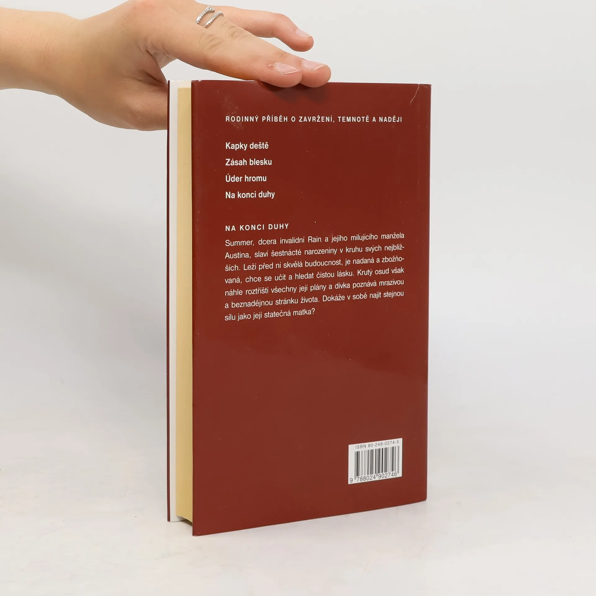 Tetralogie: Kapky deště, Zásah blesku, Úder hromu, Na konci duhy Třetí část románové ságy představuje hrdinku jako dědičku značného majetku, který jí ale nepřinese štěstí a naopak prohloubí roztržku s ostatní rodinou. O své dědictví bojuje vysilující zápas jedině kvůli přání své babičky a hodlá se zcela znechucená majetku vzdát, když dojde k neštěstí, které změní celý její život. Po pádu z koně a následném ochrnutí se rozplynou všechny její sny a plány a dívka propadá zoufalství. Pozná však člověka, kterého nezaslepil její majetek, ale který ji chce vrátit svou upřímnou a obětavou láskou zpátky do života.