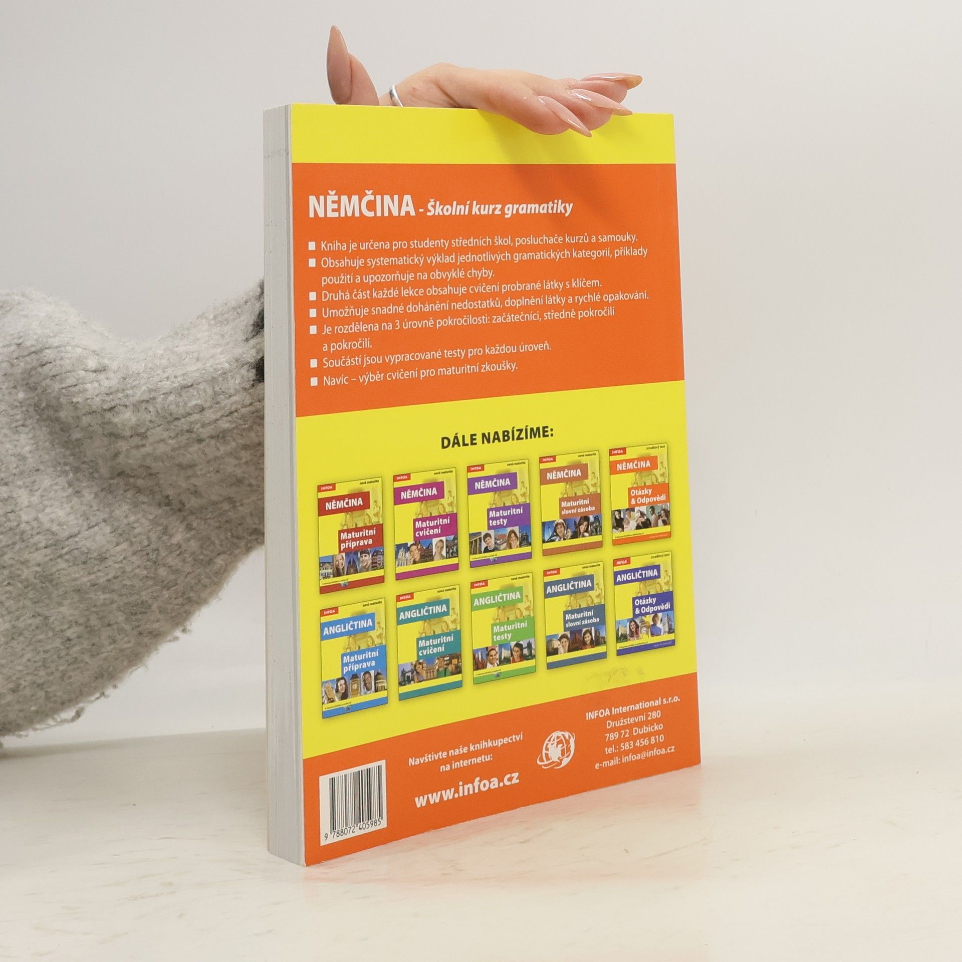 Kniha je určena pro studenty středních škol, posluchače kurzů a samouky. Obsahuje systematický výklad jednotlivých gramatických kategorií a příklady použití. Druhá část každé lekce obsahuje cvičení probrané látky s klíčem. Kniha je rozdělena na tři úrovně pokročilosti - začátečníci, středně pokročilí a pokročilí. Součástí knihy jsou vypracované testy pro každou úroveň. Navíc - výběr cvičení pro maturitní zkoušky.