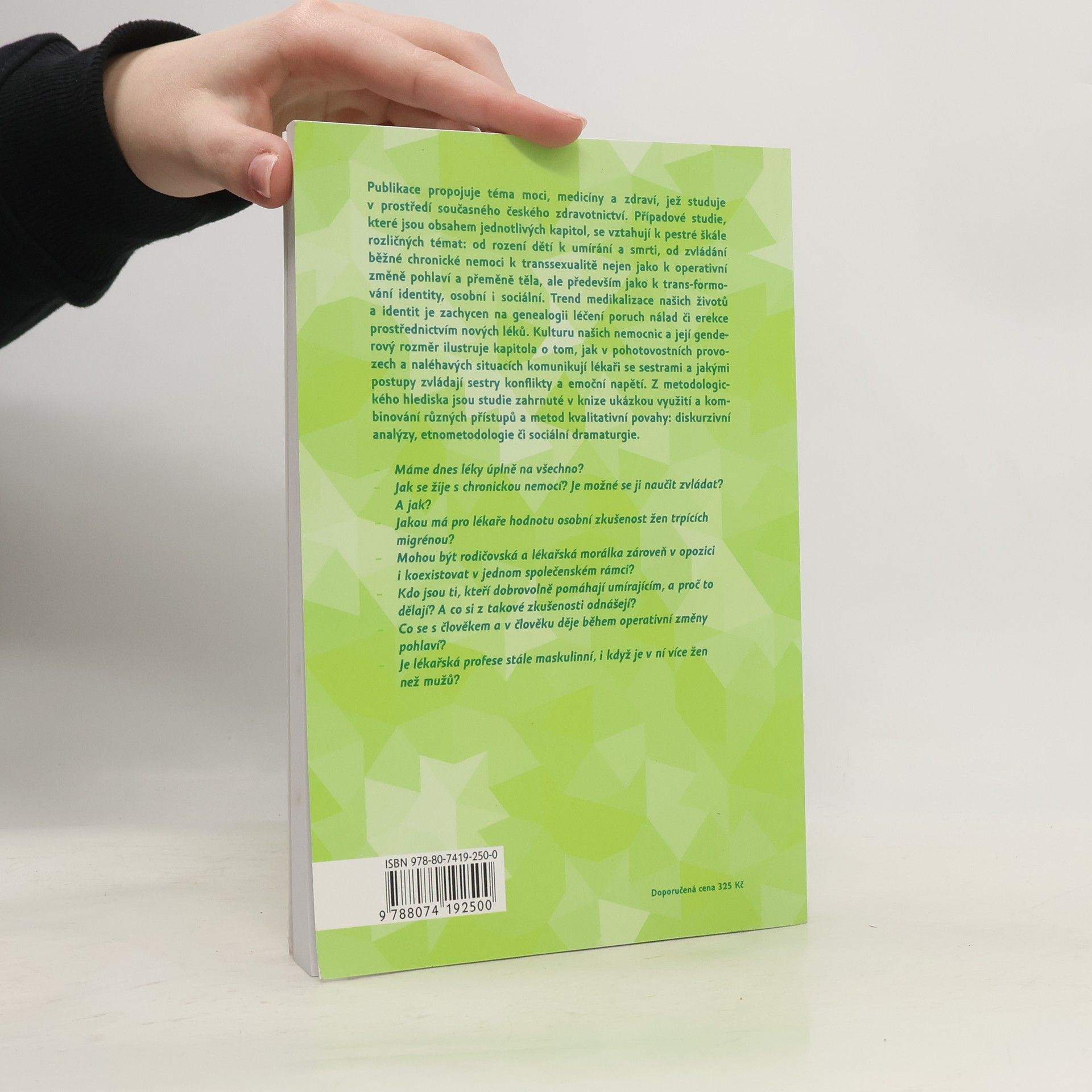 Publikace propojuje téma moci, medicíny a zdraví, jež studuje v prostředí současného českého zdravotnictví. Případové studie, které jsou obsahem jednotlivých kapitol, se vztahují k pestré škále rozličných témat: od rození dětí k umírání a smrti, od zvládání běžné chronické nemoci k transsexualitě nejen jako k operativní změně pohlaví a přeměně těla, ale především jako k trans-formování identity, osobní i sociální. Trend medikalizace našich životů a identit je zachycen na genealogii léčení poruch nálad či erekce prostřednictvím nových léků. Kulturu našich nemocnic a její genderový rozměr ilustruje kapitola o tom, jak v pohotovostních provozech a naléhavých situacích komunikují lékaři se sestrami a jakými postupy zvládají sestry konflikty a emoční napětí. Z metodologického hlediska jsou studie zahrnuté v knize ukázkou využití a kombinování různých přístupů a metod kvalitativní povahy: diskursivní analýzy, etnometodologie či sociální dramaturgie.