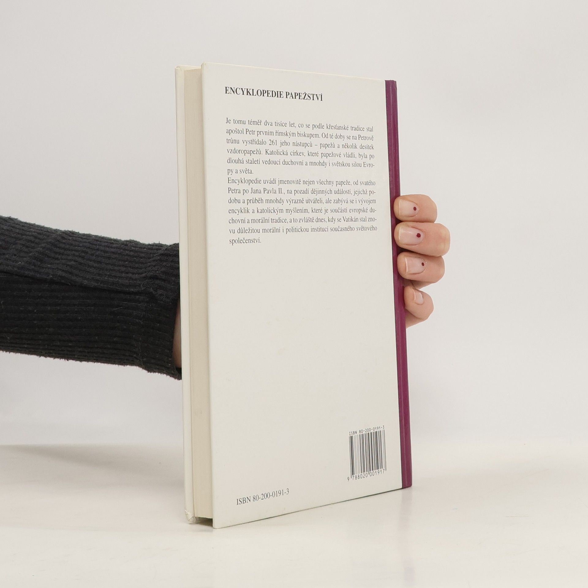 Je tomu téměř dva tisíce let, co se podle křesťanské tradice stal apoštol Petr prvním římským biskupem. Od té doby se na jeho trůnu vystřídalo 261 jeho nástupců – papežů a několik desítek vzdoropapežů. Katolická církev, které papežové vládli, byla po dlouhá staletí vedoucí duchovní a mnohdy i světskou silou Evropy a světa. Encyklopedie uvádí jmenovitě nejen všechny papeže od svatého Petra po Jana Pavla II., na pozadí dějinných událostí, jejichž podobu a průběh mnohdy výrazně utvářeli, ale zabývá se i vývojem encyklik a katolickým myšlením, které je součástí evropské duchovní a morální tradice, a to zvláště dnes, kdy se Vatikán stal znovu důležitou morální i politickou institucí současného světového společenství. (cbdb, uživatel Shaman)