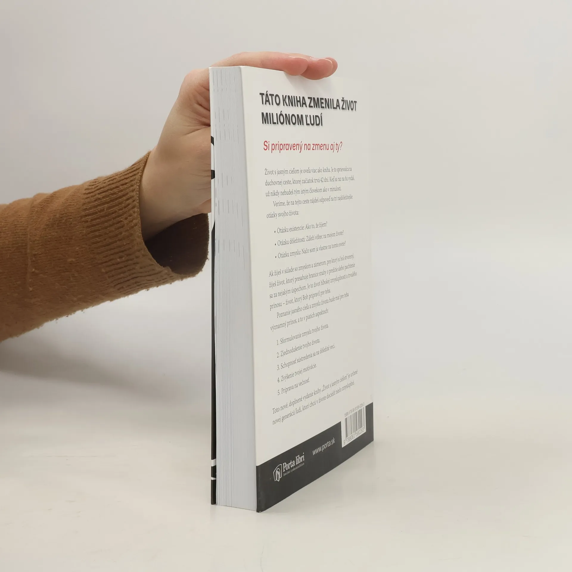 Táto kniha zmenila život miliónom ľudí. Si pripravený na zmenu aj ty? Život s jasným cieľom je oveľa viac ako kniha. Je to sprievodca na duchovnej ceste, ktorej začiatok trvá 42 dní. Keď sa raz na ňu vydáš, už nikdy nebudeš tým istým človekom ako v minulosti. VERÍME, ŽE NA TEJTO CESTE NÁJDEŠ ODPOVEĎ NA TRI NAJDÔLEŽITEJŠIE OTÁZKY SVOJHO ŽIVOTA: Otázku existencie: Ako to, že žijem? Otázku dôležitosti: Záleží vôbec na mojom živote Otázku zmyslu: Načo som ja vlastne na tomto svete? Ak žiješ v súlade so zmyslom a zámerom, pre ktorý si bol stvorený, žiješ život, ktorý presahuje hranice snahy o prežitie alebo pachtenie sa za nejakým úspechom. Je to život hlbokej zmysluplnosti a trvalého prínosu – život, ktorý Boh pripravil pre teba. POZNANIE JASNÉHO CIEĽA A ZMYSLU ŽIVOTA BUDE MAŤ PRE TEBA VÝZNAMNÝ PRÍNOS, A TO V PIATICH ASPEKTOCH: Sformulovanie zmyslu tvojho života. Zjednodušenie tvojho života. Schopnosť sústredenia sa na dôležité veci. Zvýšenie tvojej motivácie. Príprava na večnosť. Toto nové, doplnené vydanie knihy Život s jasným cieľom je určené novej generácii ľudí, ktorí chcú v živote docieliť niečo zmysluplné.