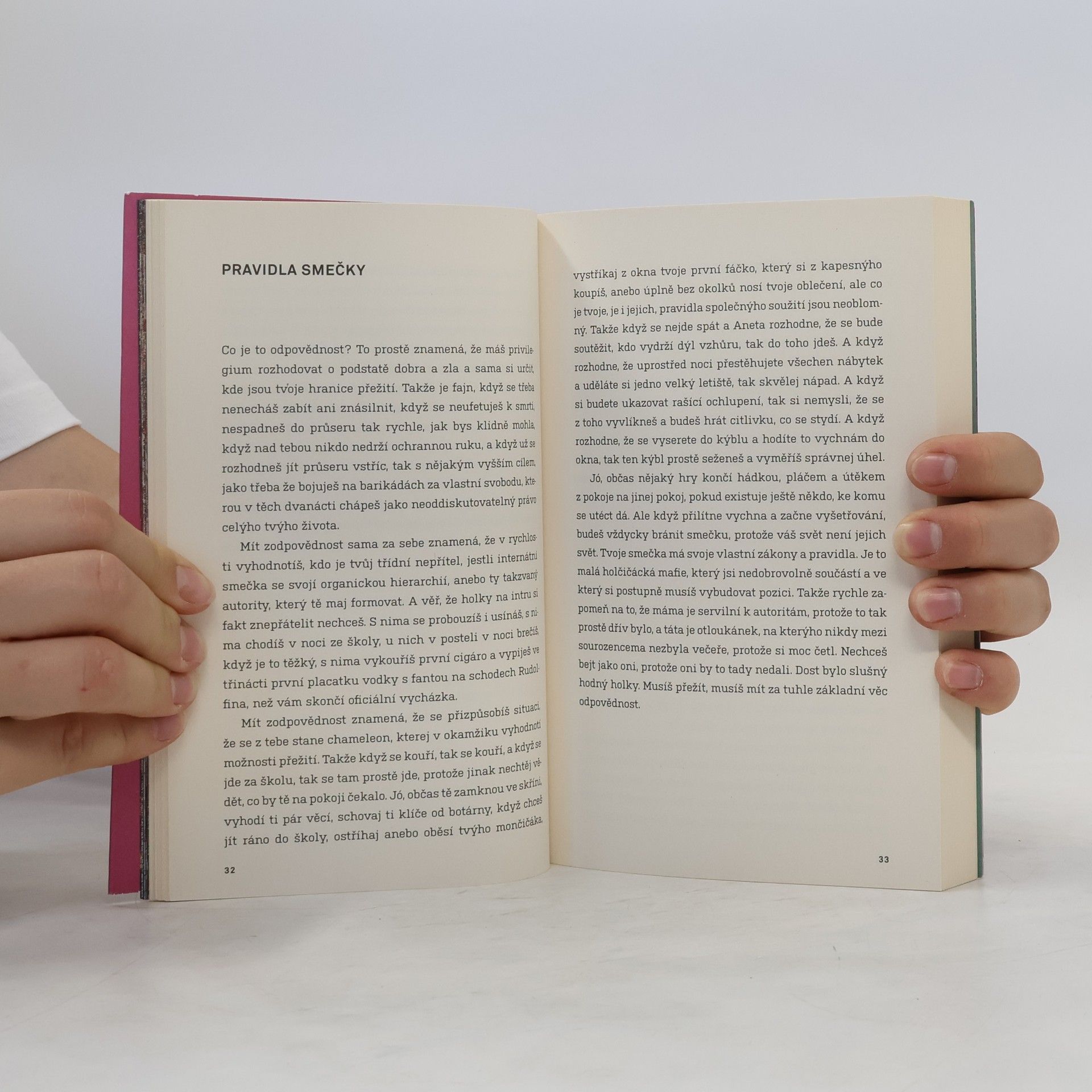 Baletky mají dvě tváře. Tu přední, usměvavou a dokonalou, kterou vidí publikum. A pak tu odvrácenou, když zmizí za oponou, předpisový úsměv jim spadne a tvář se zkřiví do ztrhaného šklebu, protože se dusí. Při tanci totiž nemůžou dýchat pusou. Třeští oči a lapají po dechu. Kdyby baletky někdo takhle nafilmoval, byla by to přehlídka utrpení. K tomu jsou ale trénované. Tak jako hlavní hrdinka tohohle příběhu. Každý den zažívá baletní dril jako v armádě. Ještě jí nebylo čtrnáct, a už je odbornicí na používání projímadel a zvracení, aby si udržela váhu, na ošetřování krvavých palců a stahování prsou. A do toho poznává klubový život v Praze. Jsou devadesátá léta, frčí perník a extáze a ona objevuje sex a zjišťuje, že má nevlastního bratra, který je úplně jiný, než by chtěla. A že její sen stát se baletkou a tančit ve Zlaté kapličce se mění v noční můru. Režisérka a tanečnice Miřenka Čechová vychází z vlastních zkušeností a deníkových zápisků. Její próza je sebeironickým, syrovým a nelítostným obrazem studií na Taneční konzervatoři a pražského života v divokých 90. letech.