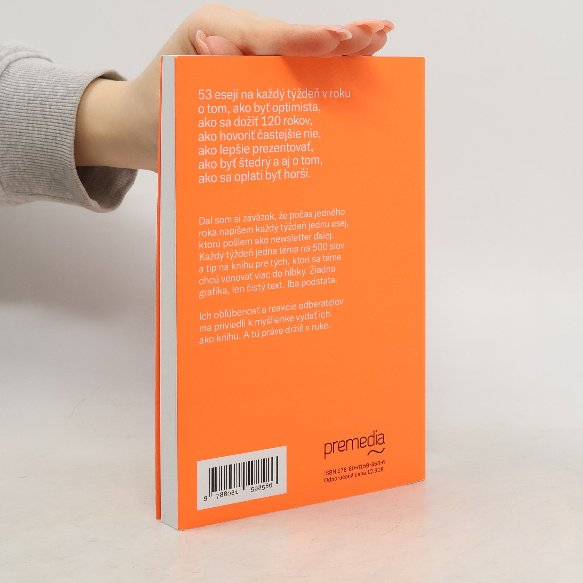 53 krátkych esejí o tom, ako byť optimista, ako sa dožiť 120 rokov, ako hovoriť nie, ako prezentovať, ako byť štedrý a aj o tom, ako byť niekedy horší. Dal som si záväzok, že počas jedného roka napíšem každý týždeň jednu esej, ktorú pošlem ako newsletter ďalej. Každý týždeň jedna téma na 500 slov a tip na knihu pre tých, ktorí sa téme chcú venovať viac do hĺbky. Žiadna grafika, len čistý text. Iba podstata. Ich obľúbenosť a reakcie odberateľov ma priviedli k myšlienke vydať ich ako knihu. 53 esejí na každý týždeň v roku. Všetko, čo už viete, ale potrebujete počuť znova.