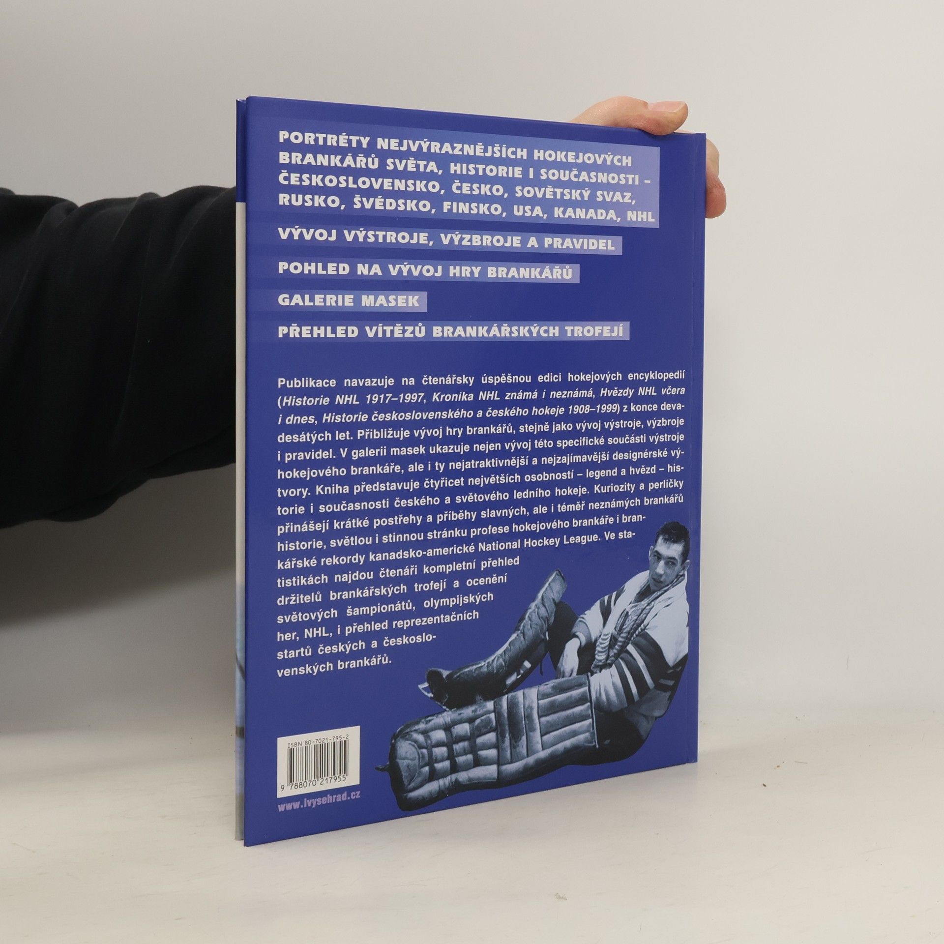 Bohatě ilustrovaná kniha přibližuje specifickou profesi hokejového brankáře a její nejvýraznější postavy historie i současnosti. Představuje profily čtyřicítky brankářských hvězd jak českého hokeje, tak i výrazné postavy světových šampionátů a superhvězdy-legendy NHL. Nabízí pohled na vývoj výstroje a výzbroje, včetně brankářských masek. Ucelenou podobu všech brankářských trofejí a jejích držitelů, perličky, zajímavosti i klípky jistě ocení všichni fanoušci ledního hokeje.