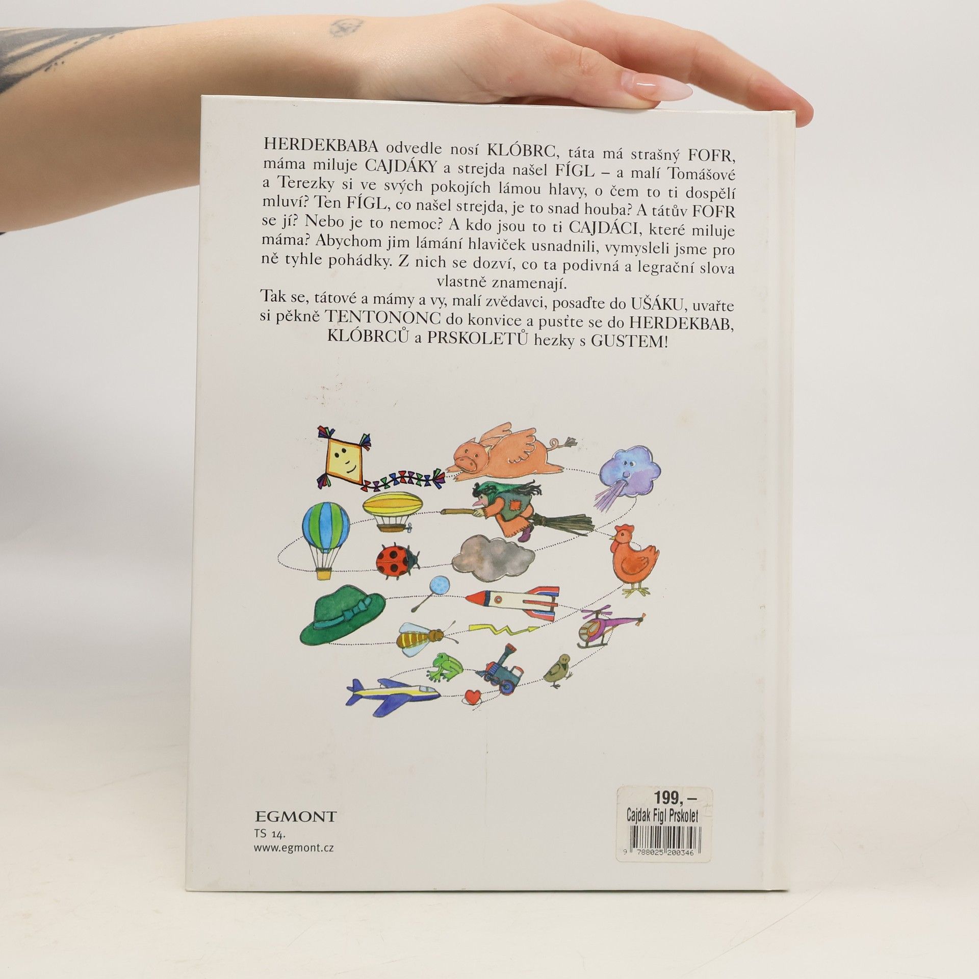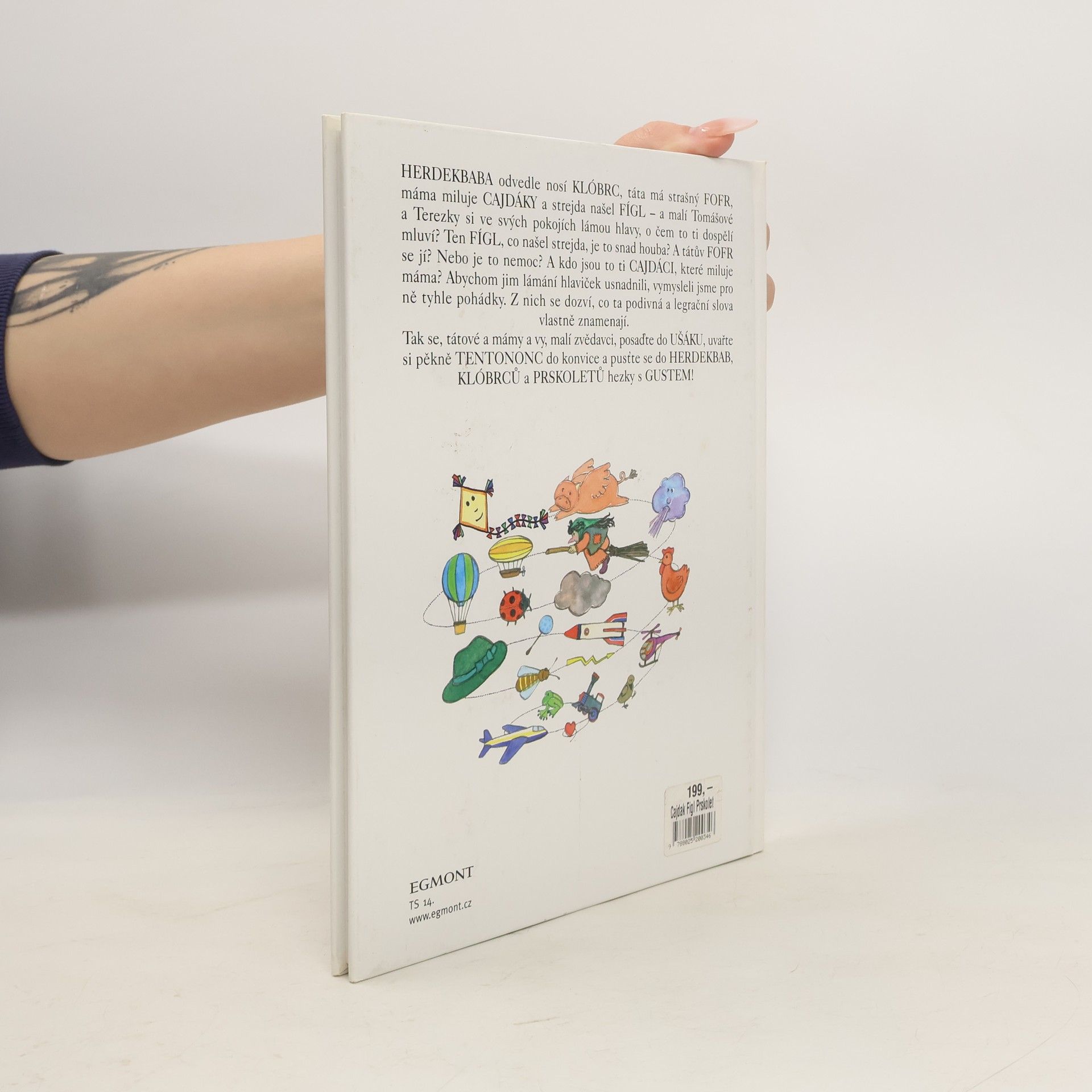 HERDEKBABA odvedle nosí KLÓBRC, táta má strašný FOFR, máma miluje CAJDÁKY a strejda našel FÍGL - a malí Tomášové a Terezky si ve svých pokojích lámou hlavy, o čem to ti dospělí mluví? Ten FÍGL, co našel strejda, je to snad houba? A tátův FOFR se jí? Nebo je to nemoc? A kdo jsou ti CAJDÁCI, které miluje máma? Abychom jim lámání hlaviček usnadnili, vymysleli jsme pro ně tyhle pohádky. Z nich se dozví, co ta podivná a legrační slova vlastně znamenají. Tak se, tátové a mámy a vy, malí zvědavci, posaďte do UŠÁKU, uvařte si pěkně TENTONONC do konvice a pusťte se do HERDEKBAB, KLÓBRCŮ a PRSKOLETŮ hezky s GUSTEM!... celý text
