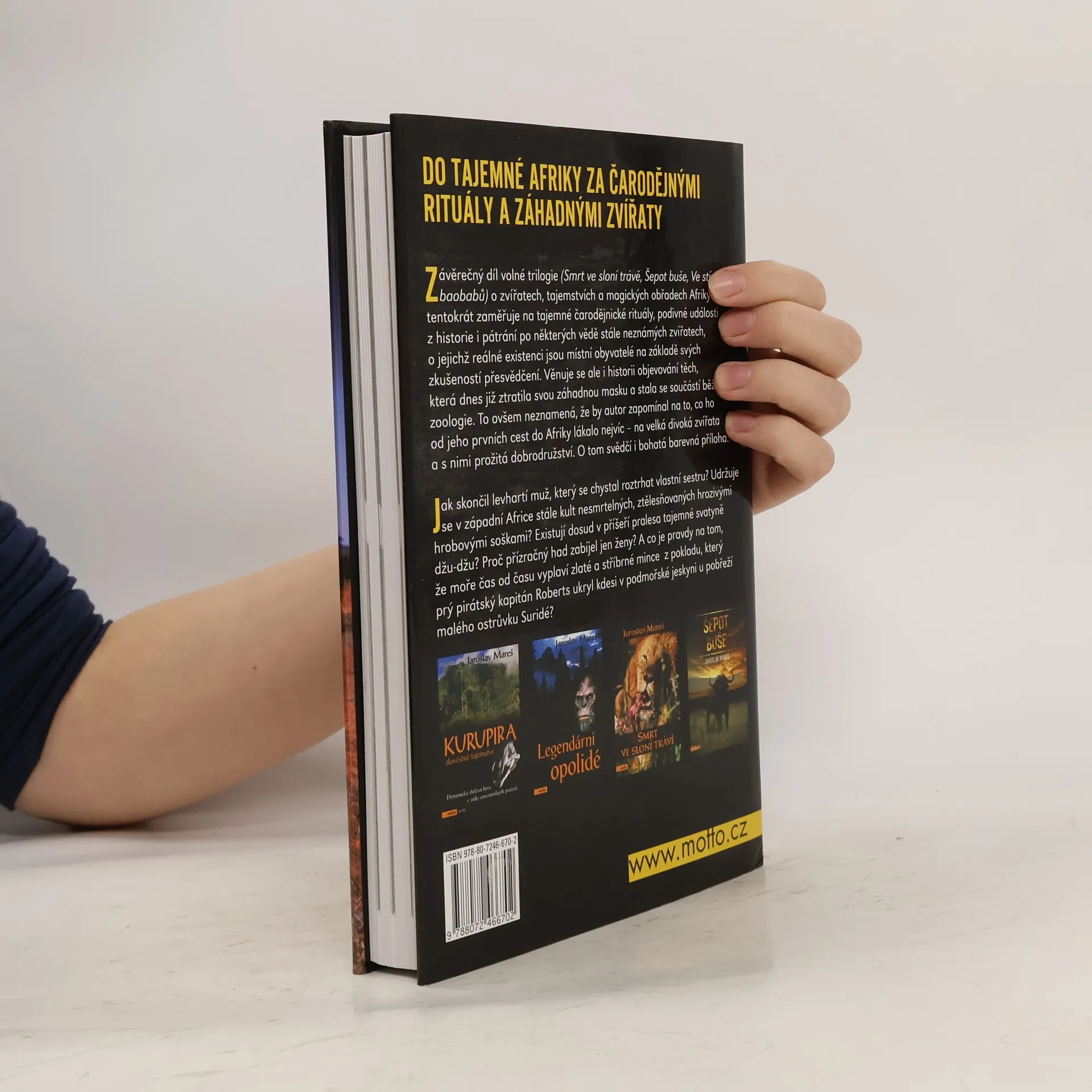 Závěrečný díl volné trilogie (Smrt ve sloní trávě, Šepot buše, Ve stínu baobabů) o zvířatech, tajemstvích a magických obřadech Afriky se tentokrát zaměřuje na tajemné čarodějnické rituály, podivné události z historie i pátrání po některých vědě stále neznámých zvířatech, o jejichž reálné existenci jsou místní obyvatelé na základě svých zkušeností přesvědčení. Věnuje se ale i historii objevování těch, která dnes již ztratila svou záhadnou masku a stala se součástí běžné zoologie. To ovšem neznamená, že by autor zapomínal na to, co ho od jeho prvních cest do Afriky lákalo nejvíc - na velká divoká zvířata a s nimi prožitá dobrodružství. O tom svědčí i bohatá barevná příloha. Jak skončil levhartí muž, který se chystal roztrhat vlastní sestru? Udržuje se v západní Africe stále kult nesmrtelných, ztělesňovaných hrozivými hrobovými soškami? Existují dosud v příšeří pralesa tajemné svatyně džu-džu? Proč příznačný had zabíjel jen ženy? A co je pravdy na tom, že moře čas od času vyplaví zlaté a stříbrné mince z pokladu, který prý pirátský kapitán Roberts ukryl kdesi v podmořské jeskyni u pobřeží malého ostrůvku Suridé?