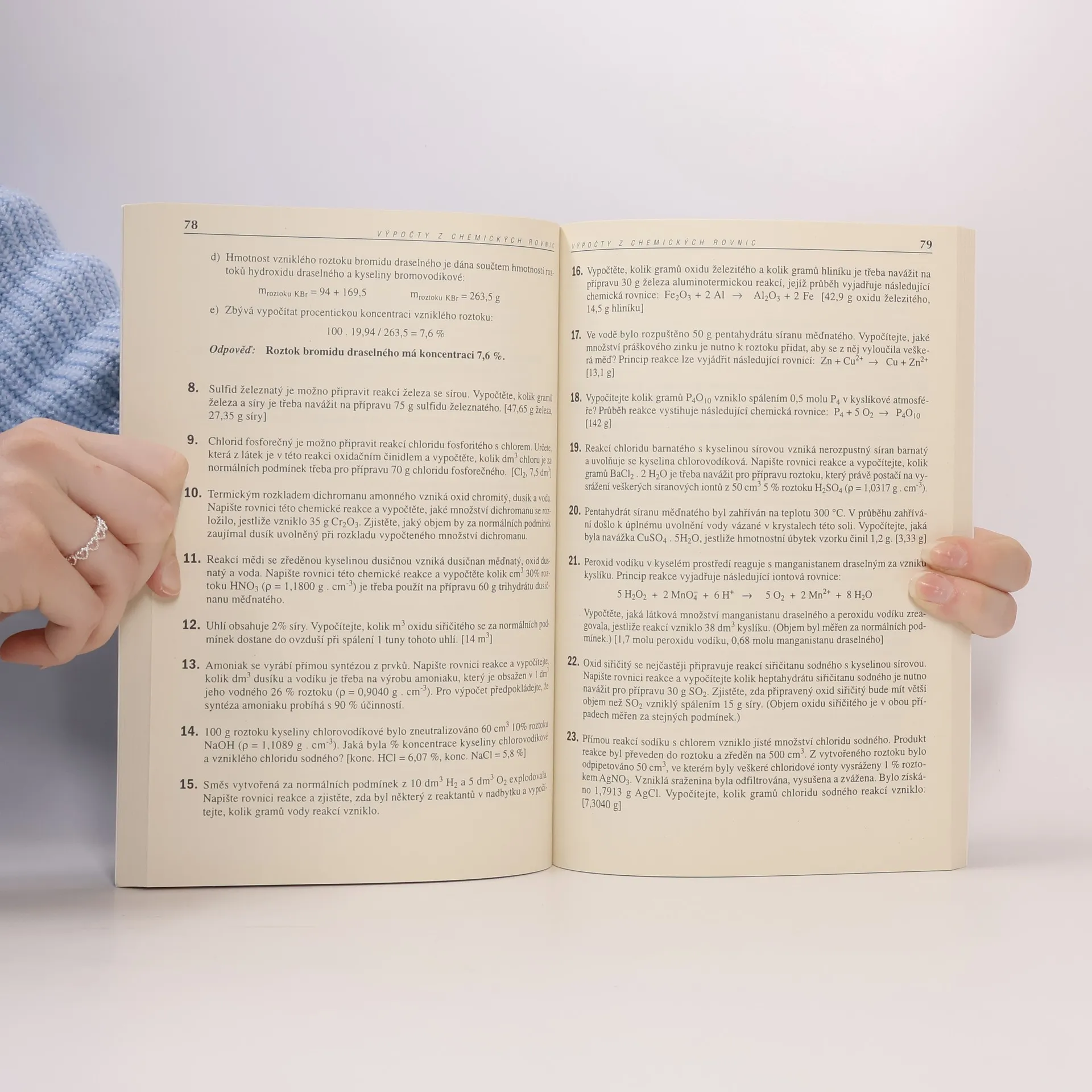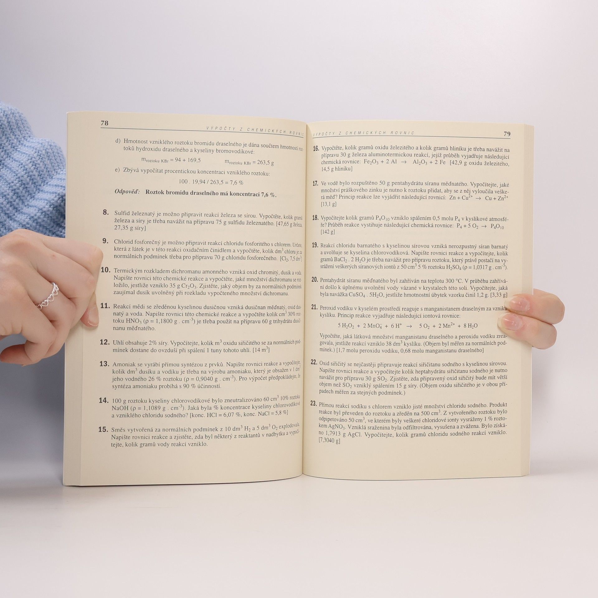 Sbírka řešených a neřešených příkladů z chemie - sbírku tvoří 17 kapitol nazvaných stavba atomu, chemická vazba, úpravy chemických rovnic, hmotnostní zlomek, objemové procento, látkové množství, molární koncentrace, výpočty z chemického vzorce, ředění roztoků, výpočty z chemických rovnic, výpočty pH, součin rozpustnosti, termochemie, elektrochemie…