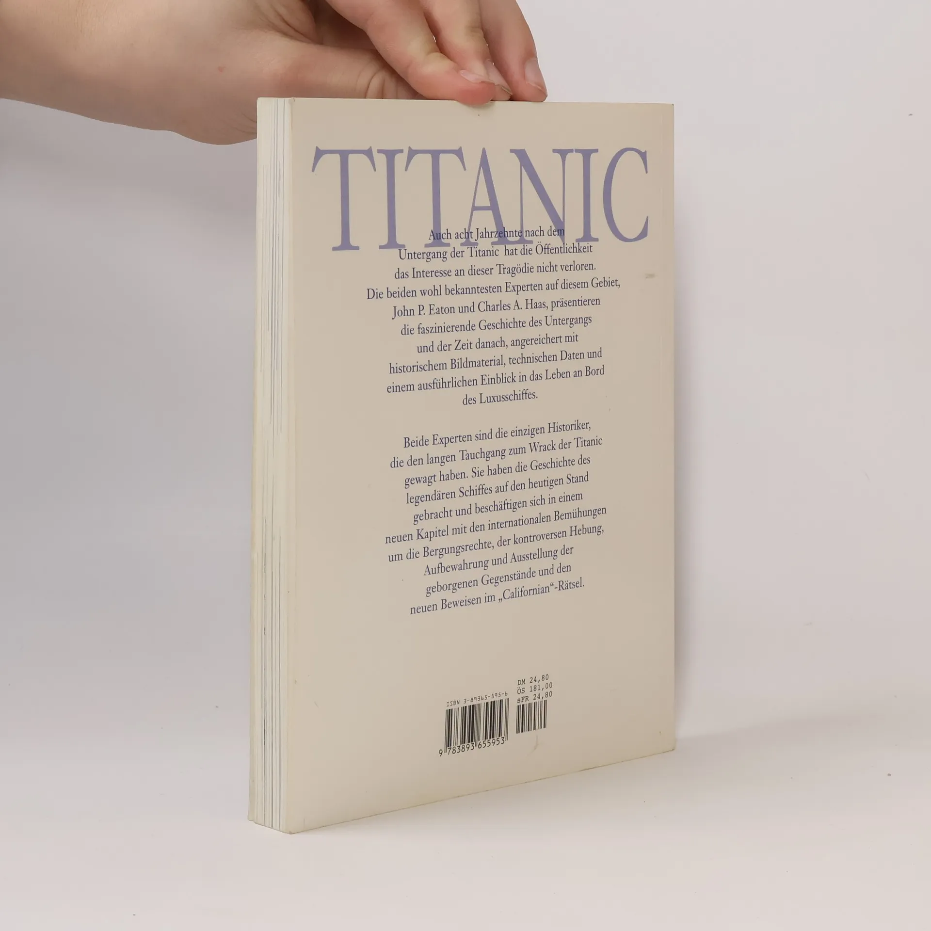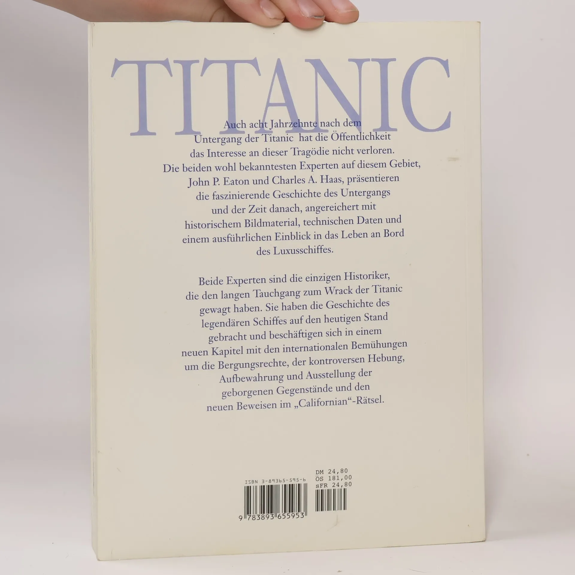 Faszinierende Einblicke in das Leben an Bord des Luxusschiffesaktualisierte NeuausgabeEnthält original historisches Bildmaterialneue technische Daten zu Konstruktion und Ausstattung Auch ein Jahrhundert nach dem Untergang der Titanic fasziniert diese Tragödie noch immer. Erfahren Sie alles über das Leben an Bord des Luxusschiffes, den Untergang und die Zeit danach. Die beiden bekanntesten Experten auf diesem Gebiet, Hohn P. Eaton und Charles A. Haas, sind die einzigen Historiker, die den langen Tauchgang zum Wrack der Titanic gewagt haben. Zahlreiche Expeditionen mit stetig verbesserter wissenschaftlicher Ausrüstung entdeckten aufregende neue Fundstücke, die Millionen Menschen bei weltweiten Ausstellungen begeistern. In dieser aktualisierten Neuausgabe haben die beiden Autoren die Geschichte des legendären Schiffes auf den heutigen Stand gebracht und präsentieren ausführliches historisches Bildmaterial, neue technische Daten zu Konstruktion und Ausstattung und geben faszinierende Einblicke in das Leben an Bord des Luxusschiffes.