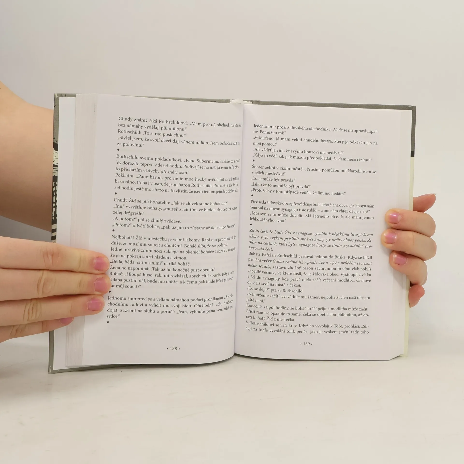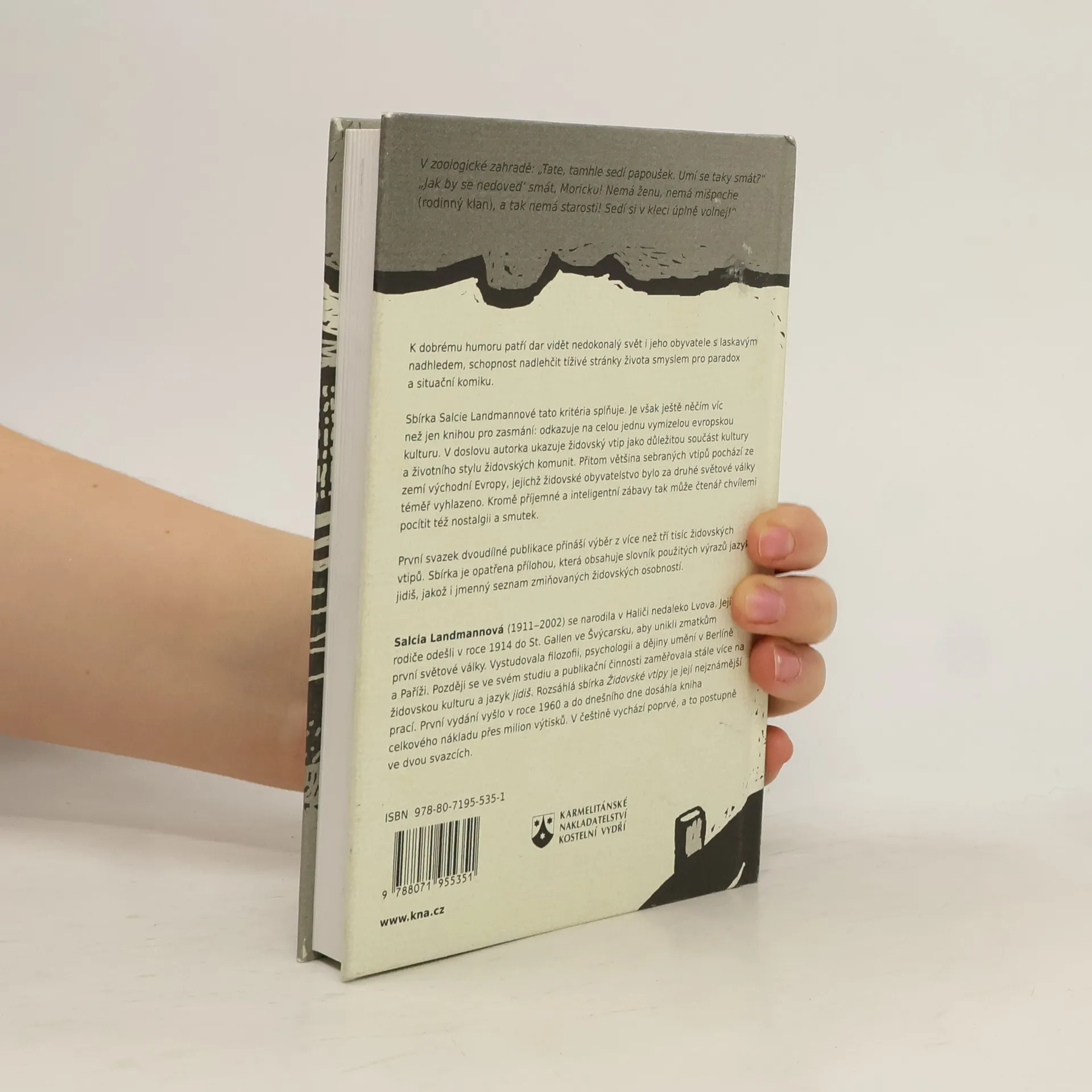 Židovské vtipy 1. V zoologické zahradě: „Tate, tamhle sedí papoušek. Dovede se taky smát?“„Jak by se nedoved’ smát, Moricku! Nemá ženu, nemá mišpoche (rodinný klan), a tak nemá starosti! Sedí si v kleci úplně volnej!“ K dobrému humoru patří dar vidět nedokonalý svět i jeho obyvatele s laskavým nadhledem, schopnost nadlehčit tíživé stránky života smyslem pro paradox a situační komiku. Sbírka Salcie Landmannové tato kritéria splňuje. Je však ještě něčím víc než jen knihou pro zasmání: odkazuje na celou jednu vymizelou evropskou kulturu. V doslovu autorka ukazuje židovský vtip jako důležitou součást kultury a životního stylu židovských komunit. Přitom většina sebraných vtipů pochází ze zemí východní Evropy, jejichž židovské obyvatelstvo bylo za druhé světové války téměř vyhlazeno. Kromě příjemné a inteligentní zábavy tak může čtenář chvílemi pocítit též nostalgii a smutek. První svazek dvoudílné publikace přináší výběr z více než tří tisíc židovských vtipů. Sbírka je opatřena přílohou, která obsahuje slovník použitých výrazů jazyka jidiš, jakož i jmenný seznam zmiňovaných židovských osobností.