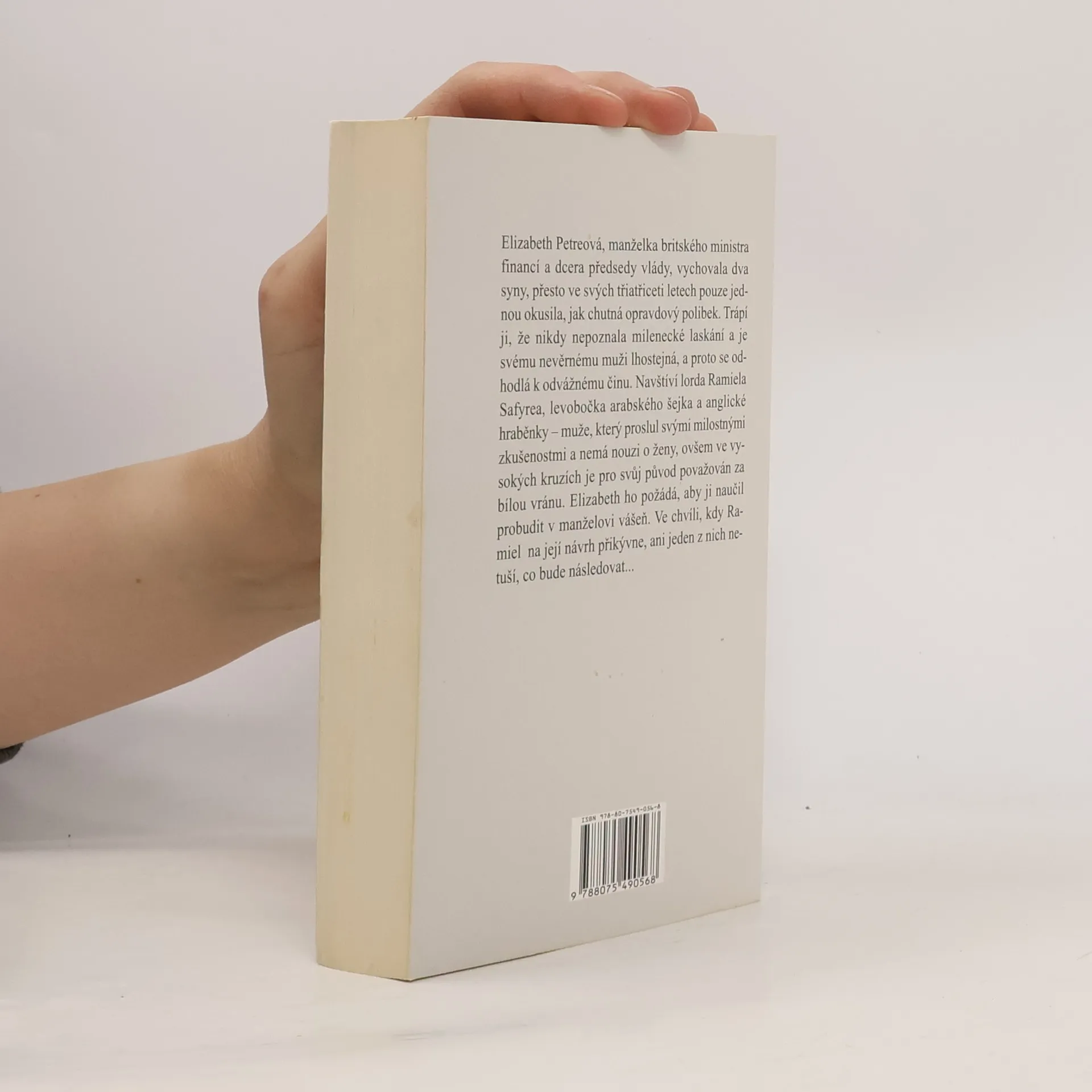 Elizabeth Petreová, manželka britského ministra financí a dcera předsedy vlády, vychovala dva syny, přesto ve svých třiatřiceti letech pouze jednou okusila, jak chutná opravdový polibek. Trápí ji, že nikdy nepoznala milenecké laskání a je svému nevěrnému muži lhostejná, a proto se odhodlá k odvážnému činu. Navštíví lorda Ramiela Safyrea, levobočka arabského šejka a anglické hraběnky ? Muže, jenž proslul svými milostnými zkušenostmi a nemá nouzi o ženy, ovšem ve vysokých kruzích je pro svůj původ považován za bílou vránu. Elizabeth ho požádá, aby ji naučil probudit v manželovi vášeň. Ve chvíli, kdy Ramiel na její návrh přikývne, ani jeden z nich netuší, co bude následovat...