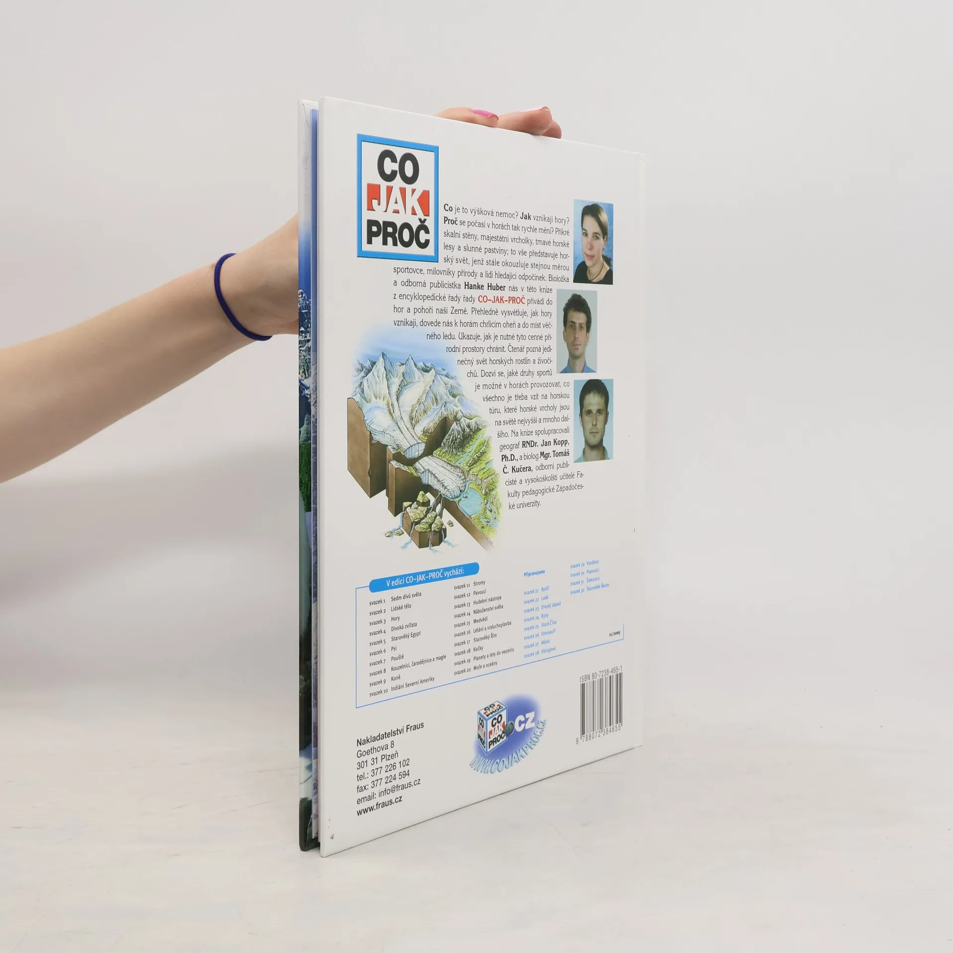 Co je to výšková nemoc? Jak vznikají hory? Proč se počasí v horách tak rychle mění? Příkré skalní stěny, majestátné vrcholky, tmavé horské lesy a slunné pastviny – horský svět fascinuje stejnou měrou sportovce, milovníky přírody a lidi hledající odpočinek. Bioložka a odborná publicistka Hanke Huberová nás v této knize z encyklopedické řady řady CO-JAK-PROČ přivádí do hor naší Země. Přehledně vysvětluje, jak hory vznikají, dovede nás k horám chrlícím oheň a do věčného ledu ledovců a jasně dává najevo, jak nutně tyto cenné přírodní prostory potřebují ochranu. Čtenář pozná unikátní rostlinný a živočišný svět hor. Dozví se, jaké druhy sportů je možné v horách provozovat , co všechno potřebujeme na horskou túru, které horské vrcholy jsou nejvyšší na světě a mnohé další. Na knize spolupracovali odborní publicisté a vysokoškolští učitelé Pedagogické fakulty Západočeské univerzity, geograf RNDr. Jan Kopp , PhD. a biolog Mgr. Tomáš Č. Kučera.