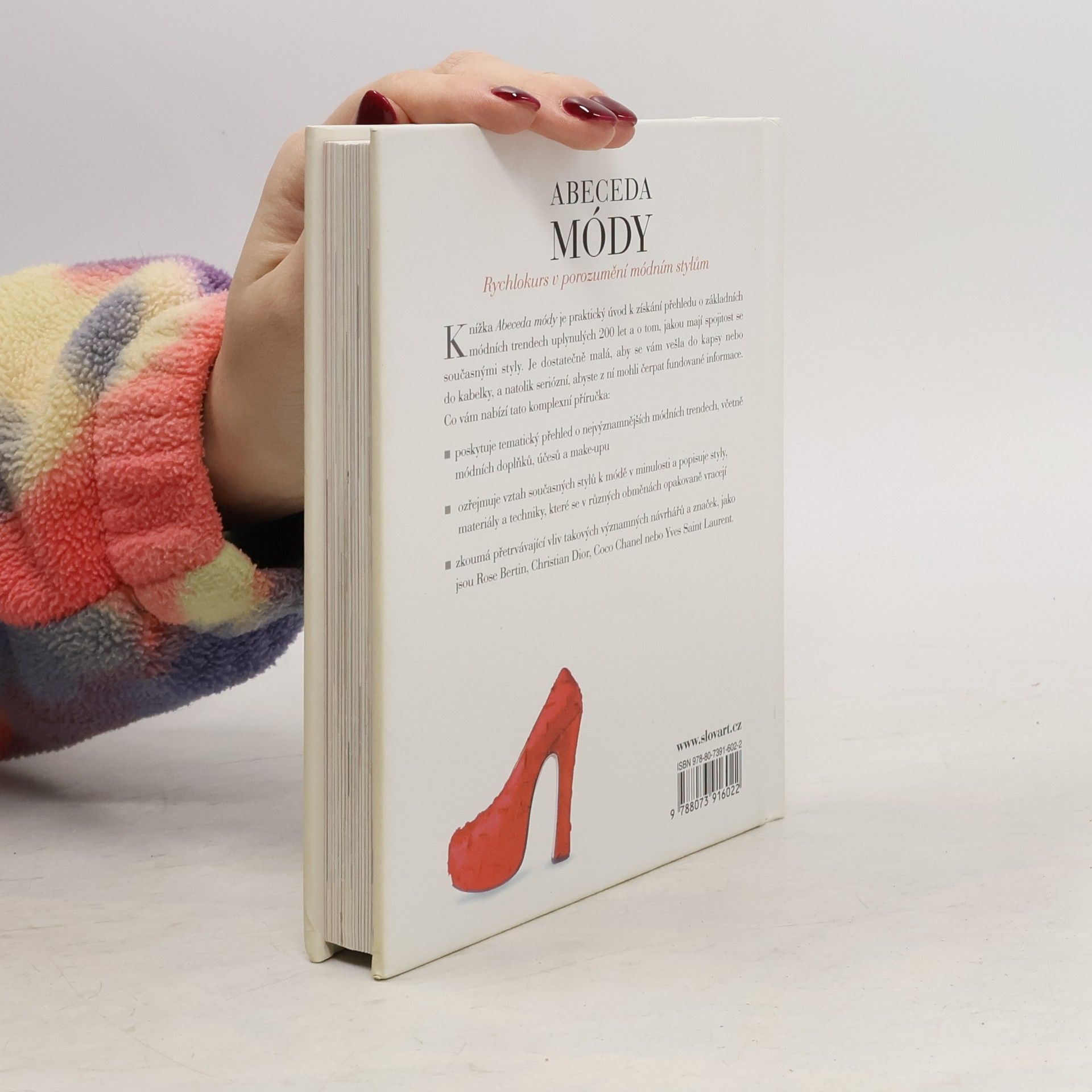 Móda je všude kolem nás a jen málokdo jí zůstává neovlivněn. A přesto: kolik lidí zná původ malých černých šatů, buřinky nebo dámského kalhotového kostýmu? Kolik lidí dokáže přesně určit slavnou značku kožené bundy, kterou měl na sobě Marlon Brando v Divochovi nebo proč se kabelce Chanel říká 2.55? Abeceda módy představuje hlavní módní styly uplynulých 200 let a dává je do souvislosti se současnými módními trendy. Vysvětluje charakteristické rysy jednotlivých looků – od neoklasicistního po gotiku, od empíru po punk nebo military styl – a rukopisy jednotlivých návrhářských značek. Kapitoly o technikách a materiálech navíc přibližují technické zázemí módní tvorby.