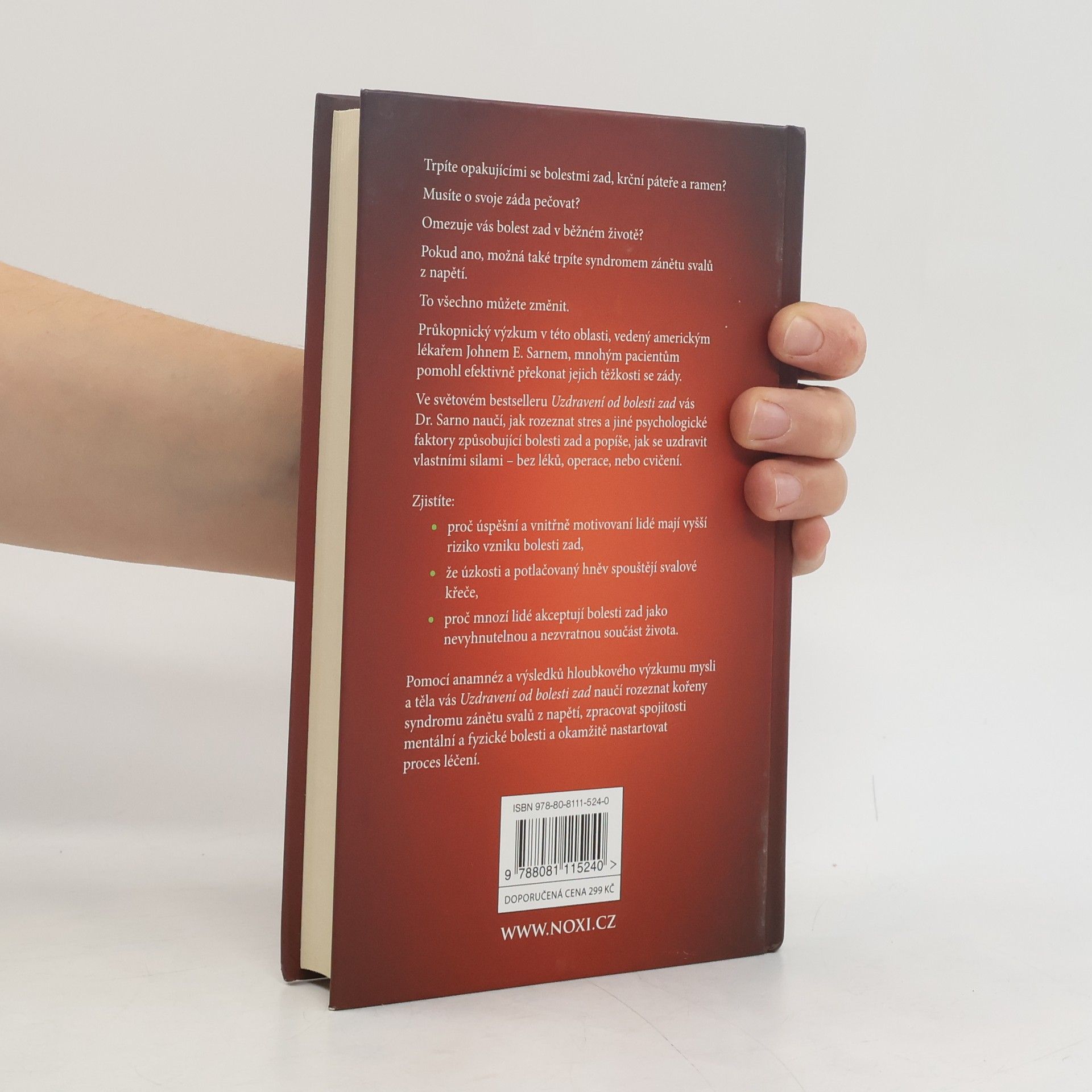 Trpíte opakujícími se bolestmi zad, krční páteře a ramen? Musíte o svoje záda pečovat? Omezuje vás bolest zad v běžném životě? Pokud ano, možná také trpíte syndromem zánětu svalů z napětí. To všechno můžete změnit. Průkopnický výzkum v této oblasti, vedený americkým lékařem Johnem E. Sarnem, mnohým pacientům pomohl efektivně překonat jejich těžkosti se zády. Ve světovém bestselleru Uzdravení od bolesti zad vás Dr. Sarno naučí, jak rozeznat stres a jiné psychologické faktory způsobující bolesti zad a popíše, jak se uzdravit vlastními silami – bez léků, operace, nebo cvičení. Zjistíte: - proč úspěšní a vnitřně motivovaní lidé mají vyšší riziko vzniku bolesti zad, - že úzkosti a potlačovaný hněv spouštějí svalové křeče, - proč mnozí lidé akceptují bolesti zad jako nevyhnutelnou a nezvratnou součást života. Pomocí anamnéz a výsledků hloubkového výzkumu mysli a těla vás Uzdravení od bolesti zad naučí rozeznat kořeny syndromu zánětu svalů z napětí, zpracovat spojitosti mentální a fyzické bolesti a okamžitě nastartovat proces léčení.