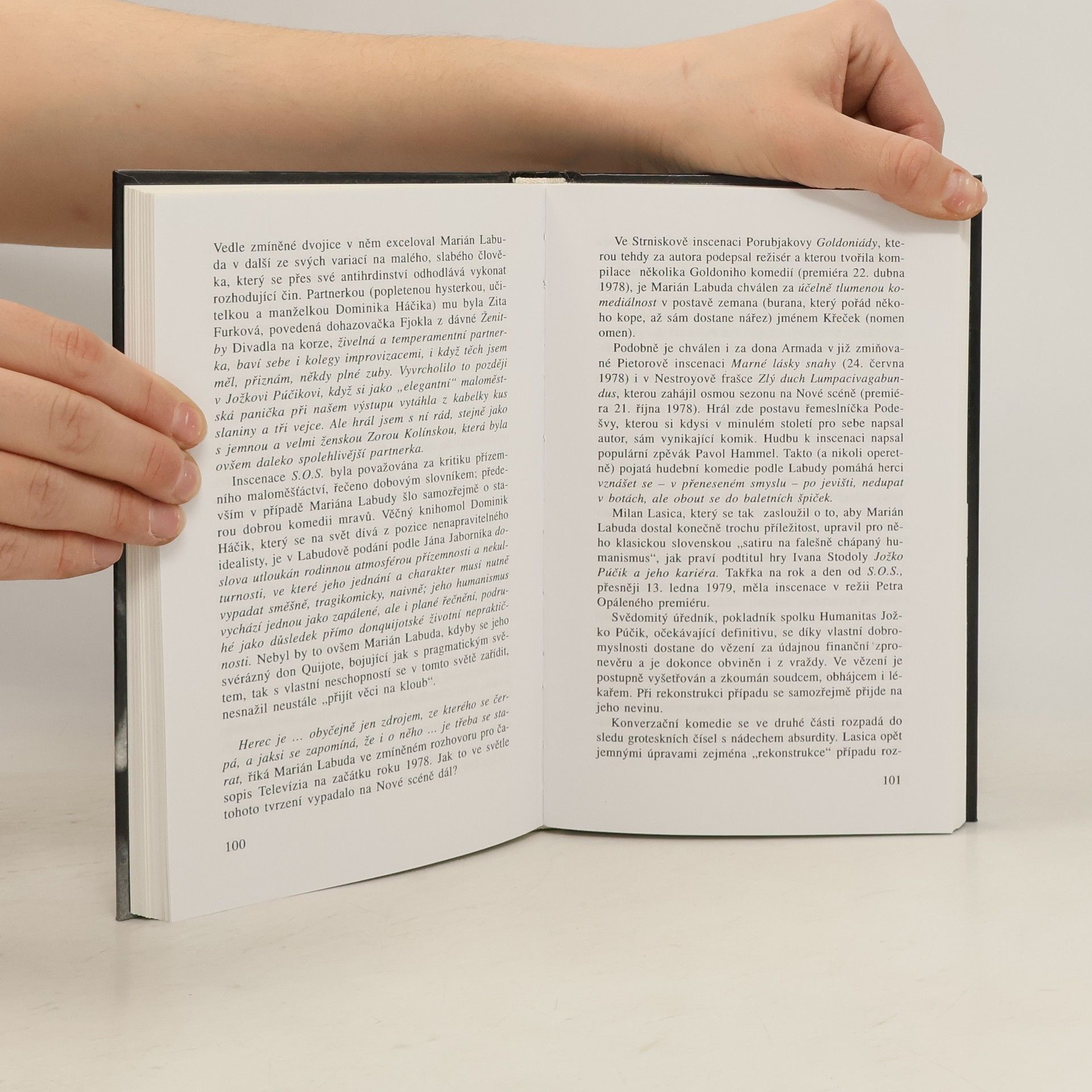Monografie věnovaná slovenskému herci Mariánu Labudovi krok za krokem sleduje jeho putování po významných divadlech, jakými jsou Slovenské národné divadlo, Divadlo na korze a Nová scéna. Českému čtenáři mapuje slovenské divadelní dění, v němž Labuda sehrál významnou roli jako herec i člověk. V živých vstupech vzpomíná Labuda na své dětství, prožité na venkově, i na situaci po uzavření Divadla na korze, kdy se jako herec ocitl na černé listině.
