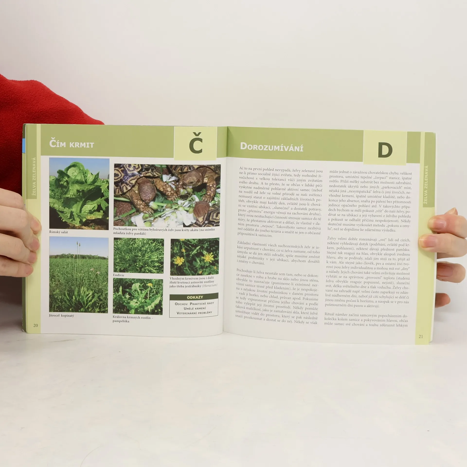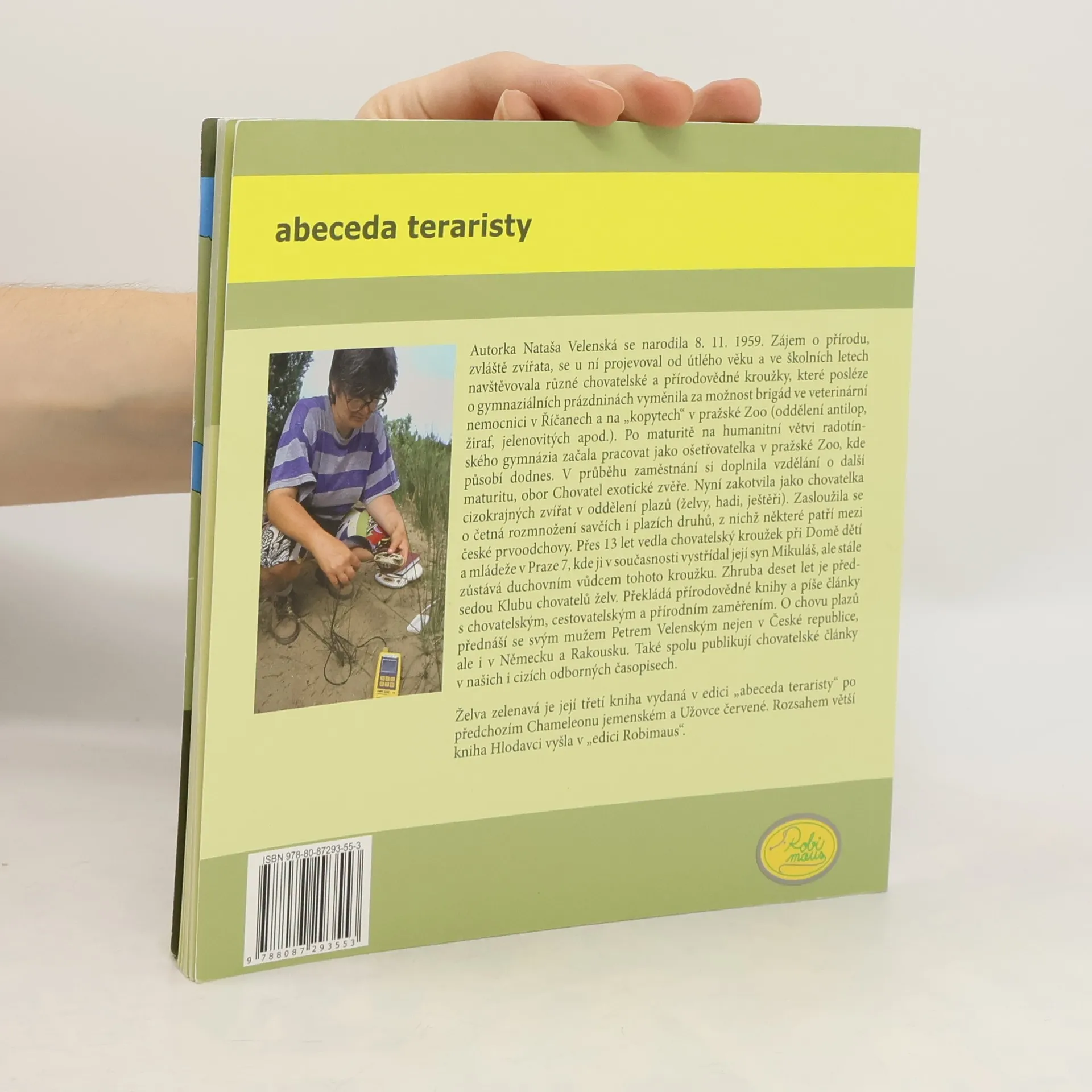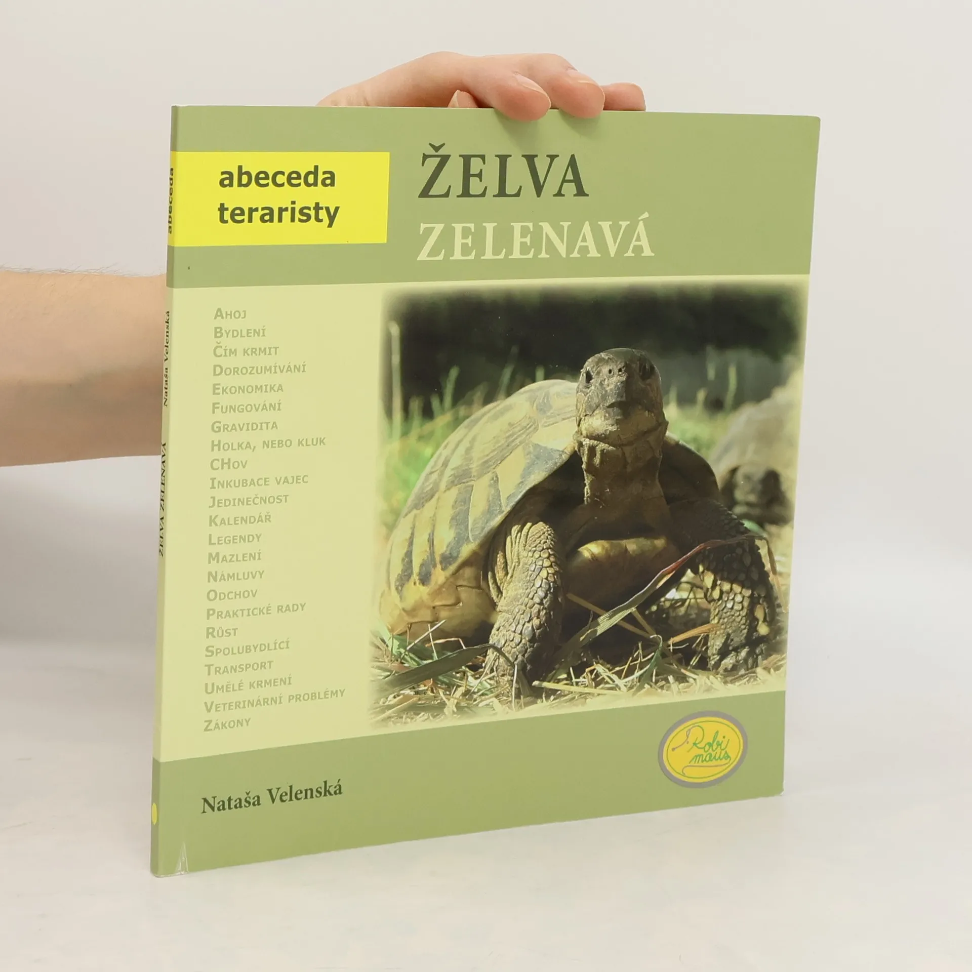 Autorka, paní Nataša Velenská, naše přední odbornice na chov želv, již řadu let působí v pražské ZOO. V knize obsáhle popisuje vše, co se týká chovu a odchovu Testudo hermanni - želvy zelenavé. Pro začínající teraristy je kniha absolutním základem, ale mnoho zajímavých a poučných poznatků zde naleznou i zkušení chovatelé. Nová kniha edice Abeceda teraristy přibližuje nejčastěji chovanou suchozemskou Želvu zelenavou (Testudo hermanni). Autorka Nataša Velenská v knize popisuje základní a potřebné informace pro chov těchto želv, od krmení, bydlení, růstu, až po rozmnožování či veterinární problémy. Kapitoly jsou řazeny podle abecedních hesel, doplněné množstvím fotografií a popisů. V každém výtisku je vložen arch, podle kterého můžete svou želvu jednoduše a přesně měřit a tím sledovat její růst. Údaje si můžete zaznamenat do příslušných kolonek na druhé straně archu.