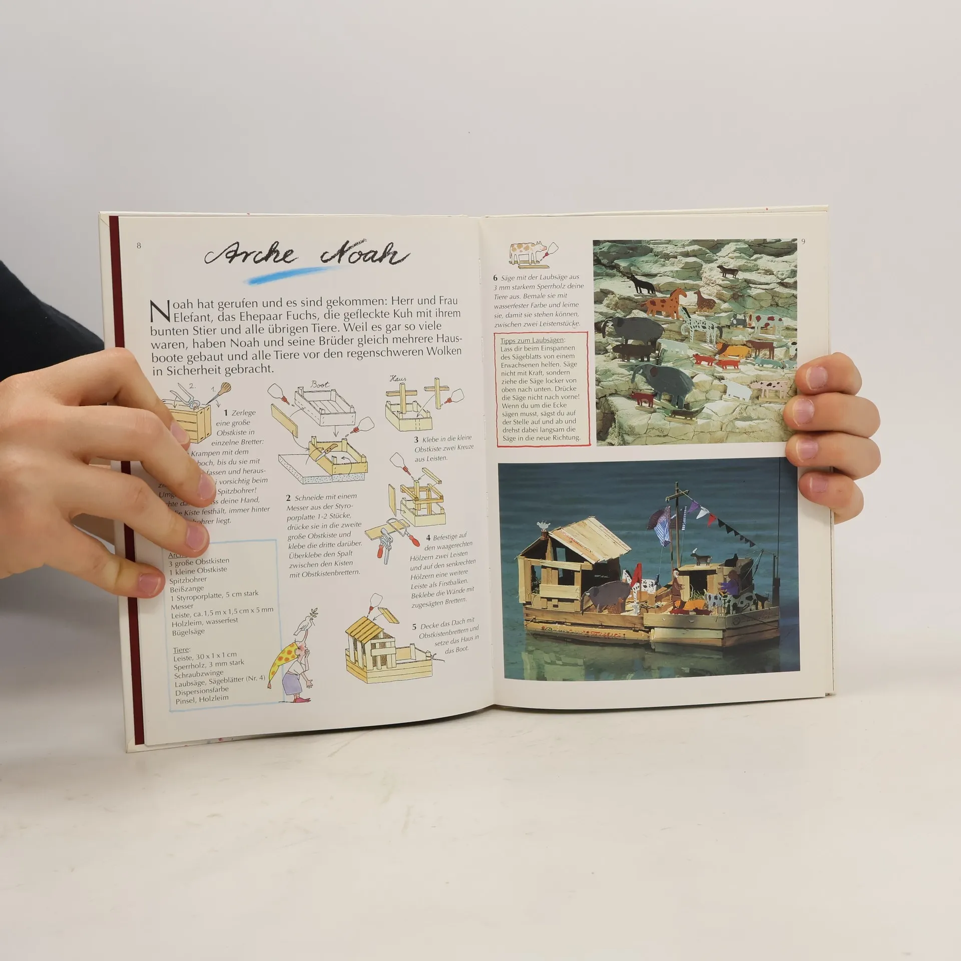 Bilder und Schritt-für-Schritt-Anleitungen zum Basteln von Holztieren, Gliederfiguren, Obstkisten-Boot u.v.a.m.