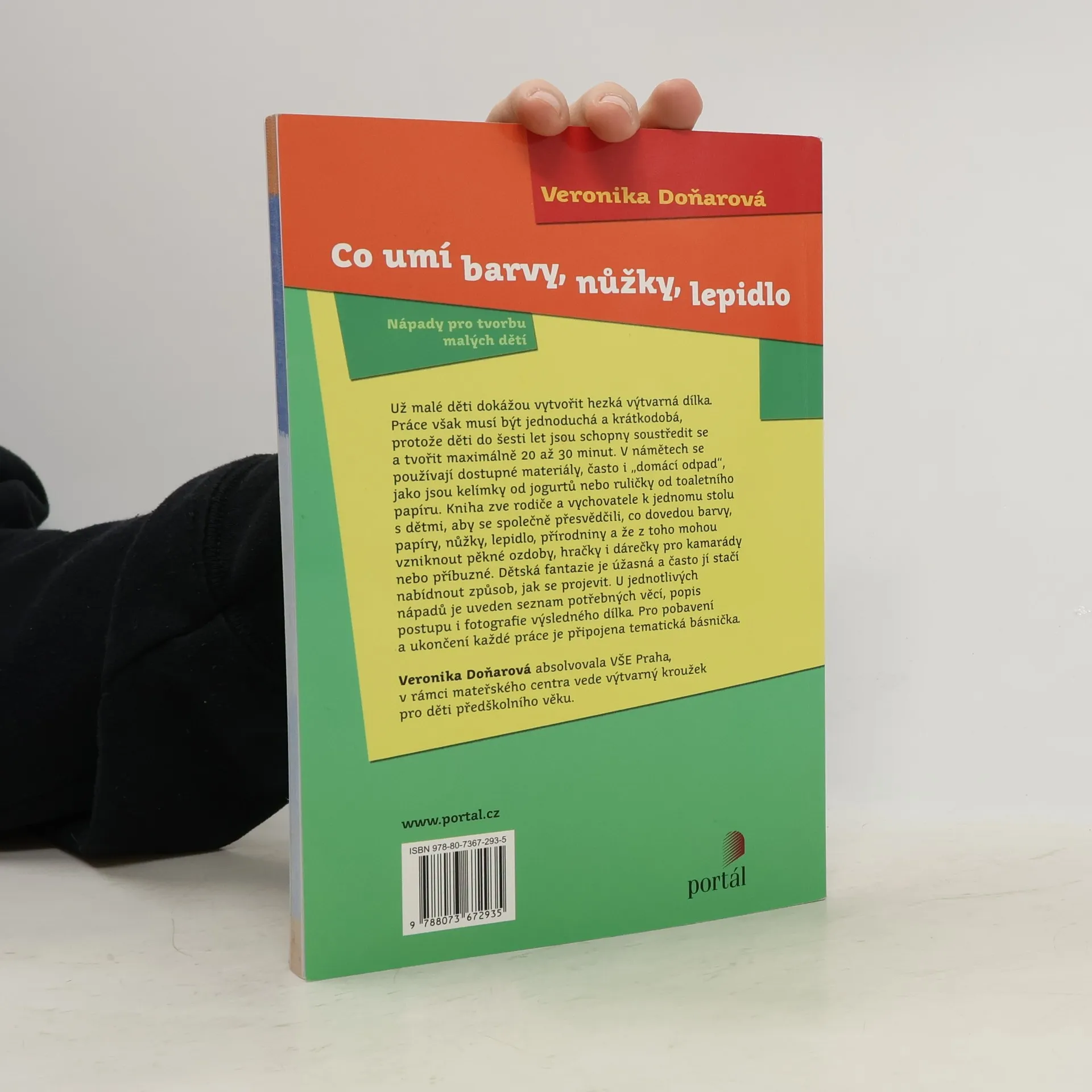 Už malé děti dokážou vytvořit hezká výtvarná dílka. Práce však musí být jednoduchá a krátkodobá, protože děti ve věku 2-6 let jsou schopny se soustředit a tvořit maximálně 20 až 30 minut. V námětech se užívá dostupných materiálů, často i "domácího odpadu", jako jsou kelímky od jogurtů nebo ruličky od toaletního papíru. Kniha zve rodiče a vychovatele k jednomu stolu s dětmi, aby se společně přesvědčili, co dovedou barvy, papíry, nůžky, lepidlo, přírodniny a že z toho mohou vzniknout pěkné ozdoby, hračky i dárečky pro kamarády nebo příbuzné. Dětská fantazie je úžasná a často jí stačí nabídnout způsob, jak se projevit. U jednotlivých nápadů je uveden seznam potřebných věcí, popis postupu i fotografie výsledného dílka. Pro pobavení a ukončení každé práce je připojena tematická básnička. Veronika Doňarová absolvovala VŠE Praha, v rámci mateřského centra vede výtvarný kroužek pro děti předškolního věku.