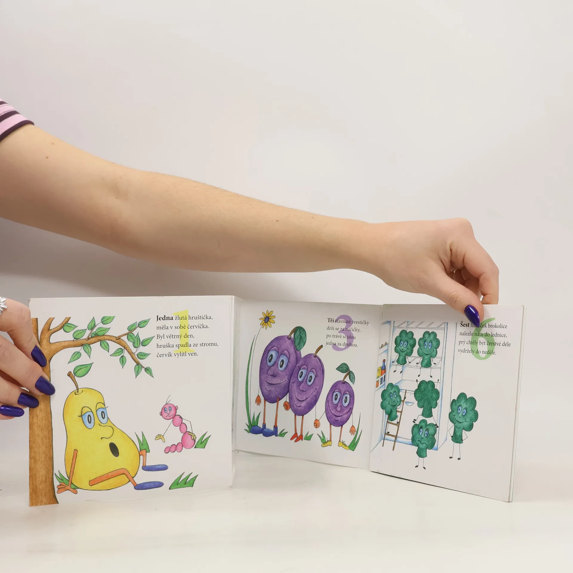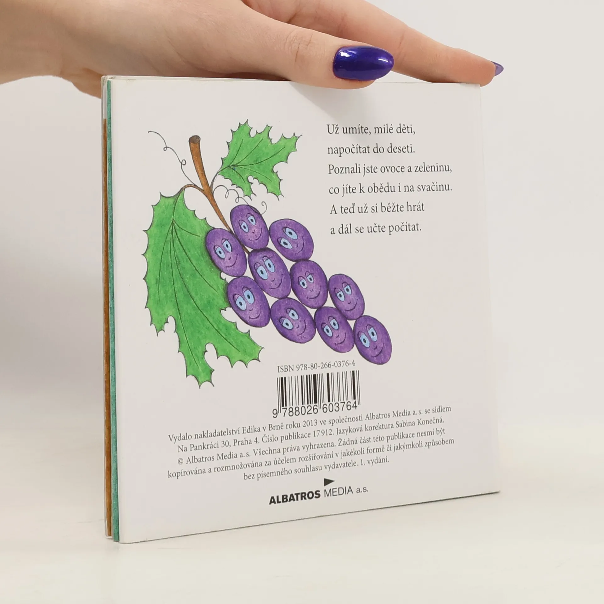 Leporelo pro nejmladší děti s jednoduchými básničkami a milými obrázky. Děti se učí počítat do deseti a současně se seznamují se základními druhy ovoce a zeleniny.