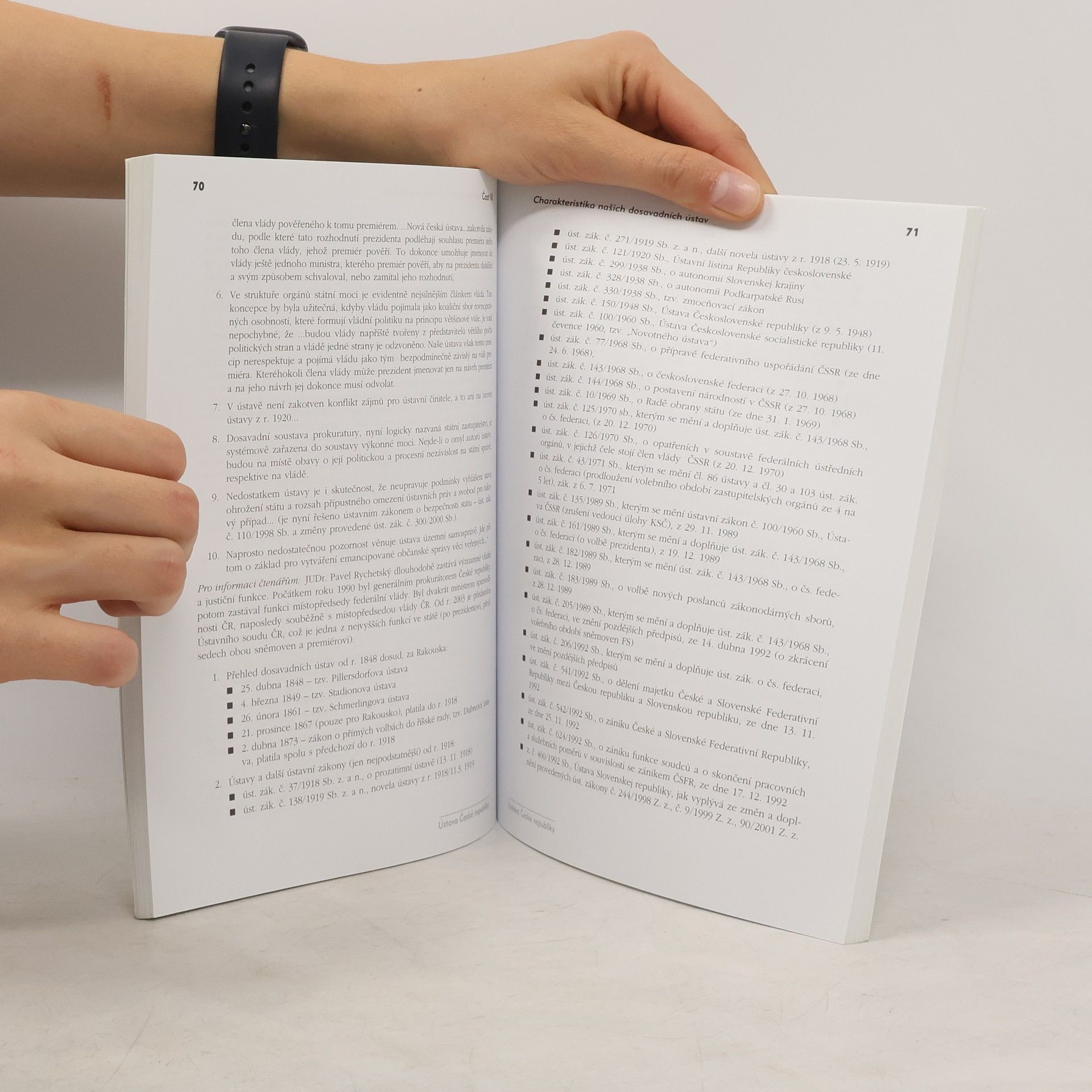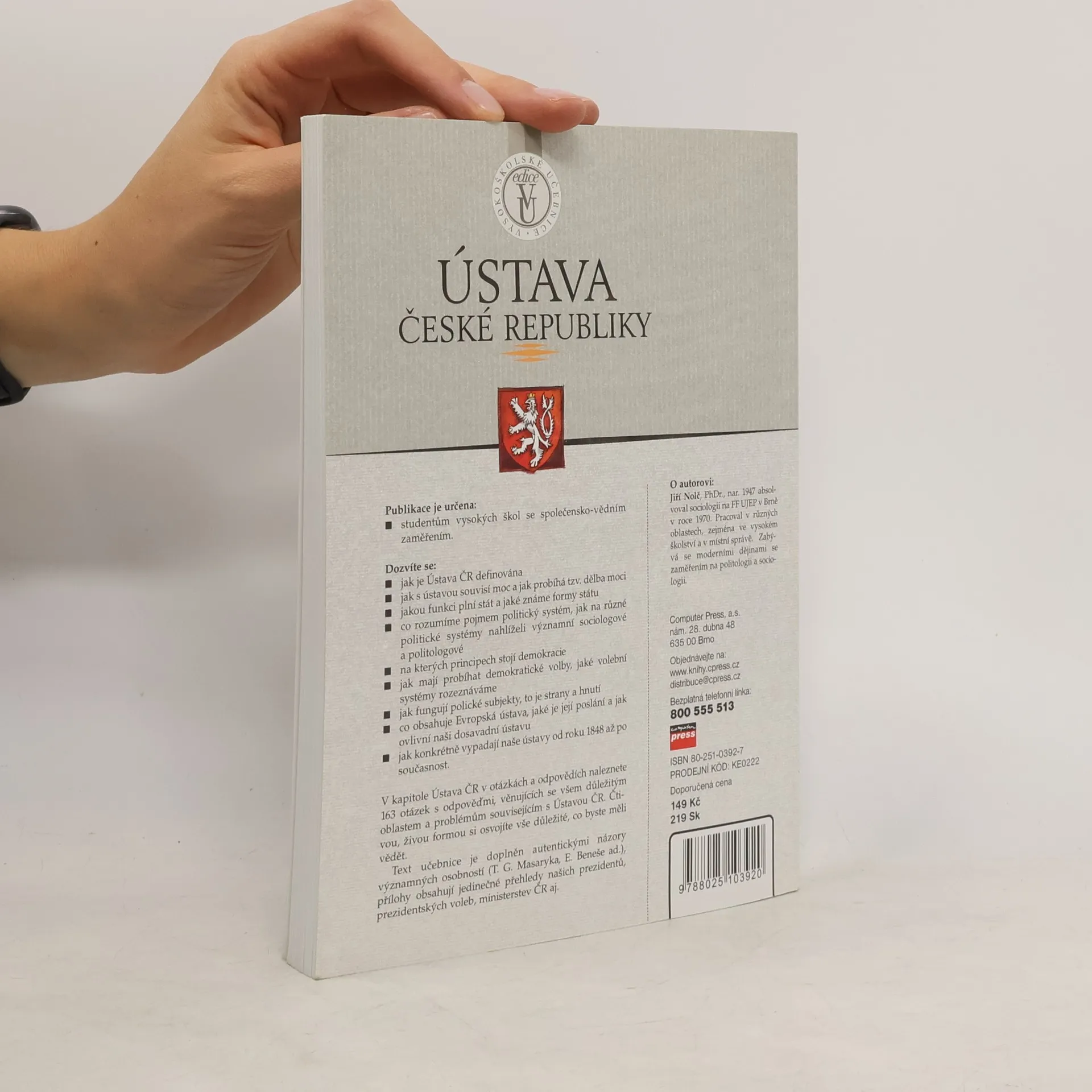Učebnice je určena pro studenty na fakultách se společensko-vědním zaměřením. Poskytne jim vyčerpávající informace o ústavě České republiky, o tom, jak fungují Parlament ČR, Poslanecká sněmovna, Senát ČR, Ústavní soud, co obsahuje Listina základních práv a svobod ad. Látka je členěna formou otázek a odpovědí, které umožní rychle pochopit a zapamatovat si důležité informace. Součástí publikace je kapitola o českých prezidentech s jejich stručnými životopisy.