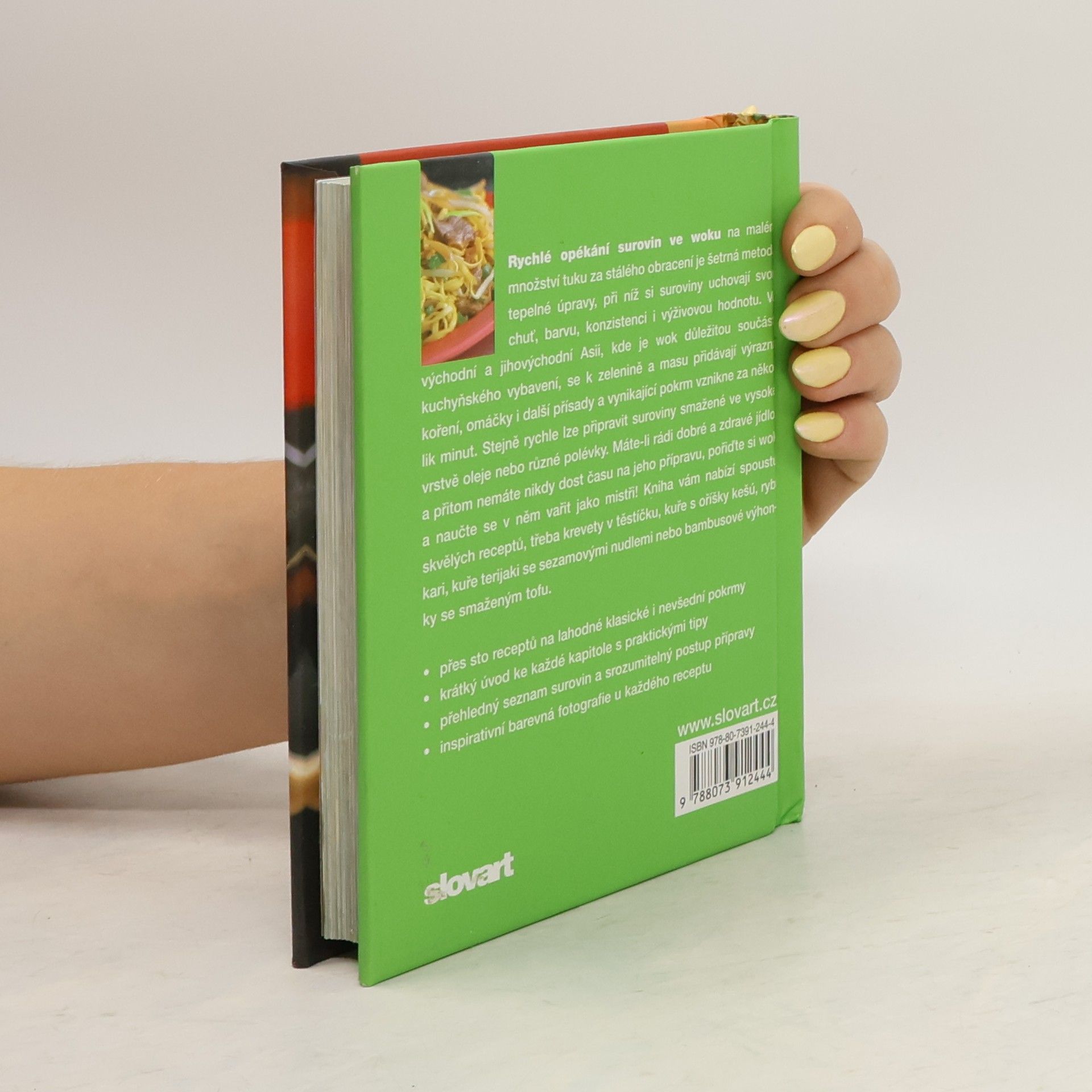 Rychlé opékání surovin ve woku na malém množství tuku za stálého obracení je šetrná metoda tepelné úpravy, při níž si suroviny uchovají svou chuť, barvu, konzistenci i výživovou hodnotu. Ve východní a jihovýchodní Asii, kde je wok důležitou součástí kuchyňského vybavení, se k zelenině a masu přidávají výrazná koření, omáčky i další přísady a vynikající pokrm vznikne za několik minut. Máte-li rádi dobré a zdravé jídlo, a přitom nemáte nikdy dost času na jeho přípravu, pořiďte si wok a naučte se v něm vařit jako mistři! Kniha vám nabízí spoustu skvělých receptů, třeba krevety v těstíčku, kuře s oříšky kešú, rybí kari, kuře terijaki se sezamovými nudlemi nebo bambusové výhonky se smaženým tofu.