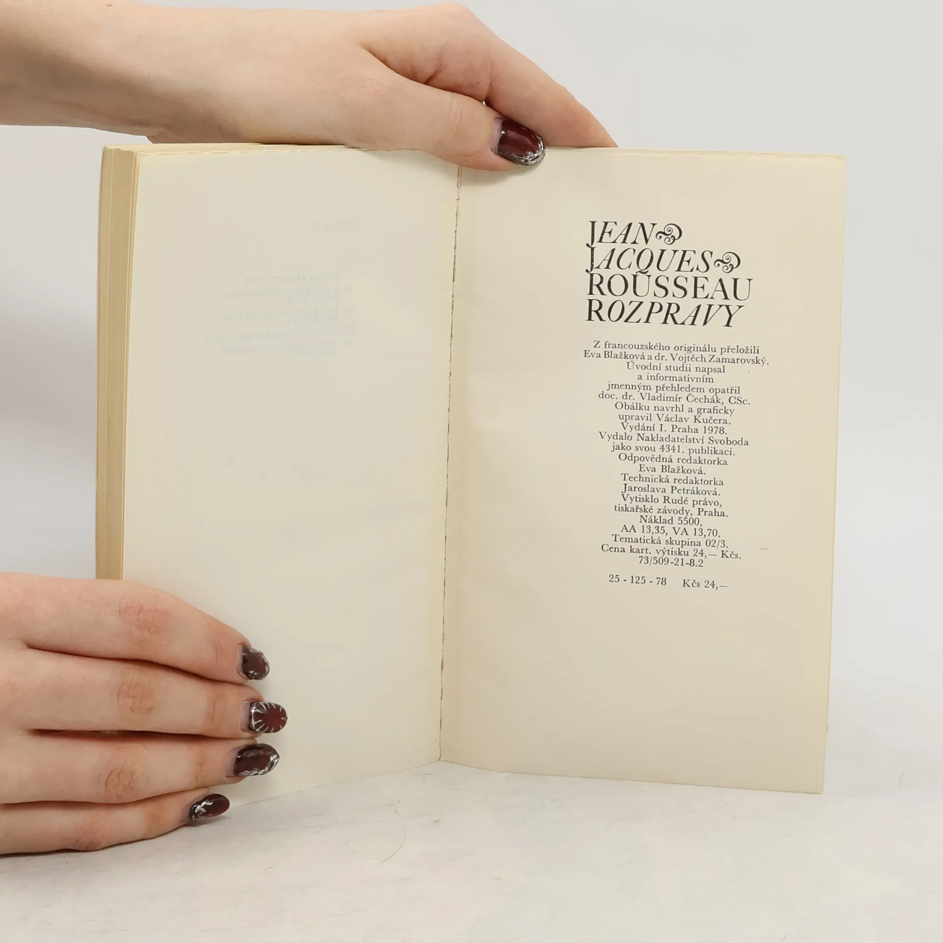 K dvoustému výročí autorova úmrtí vycházejí vedle úvodní studie V. Čecháka, vykládající a hodnotící autorovo dílo, tři základní autorovy práce, tj. Pojednání o původu a příčinách nerovnosti mezi lidmi, Rozprava o politické ekonomii a O společenské smlouvě neboli o základech státního práva.