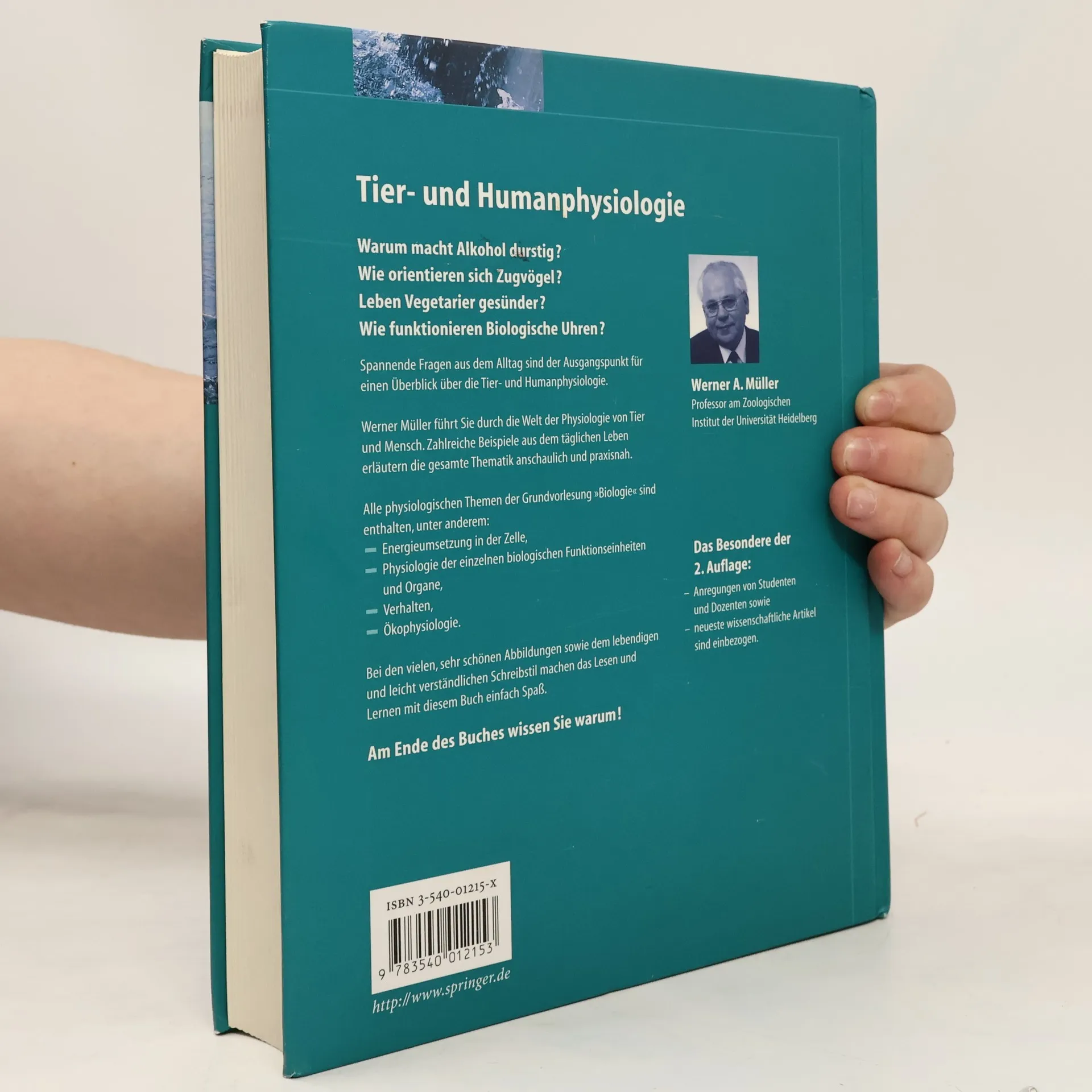 Warum macht Alkohol durstig? Wie orientieren sich Zugvögel? Leben Vegetarier gesünder? Solche spannenden Fragen aus dem Alltag bilden den Ausgangspunkt für einen umfassenden Überblick über die Tier- und Humanphysiologie. Werner Müller nimmt Sie mit auf eine Reise durch die Physiologie von Mensch und Tier, unterstützt durch zahlreiche lebensnahe Beispiele. Die Themen der Grundvorlesung Biologie sind vollständig abgedeckt, einschließlich Energieumsetzung in der Zelle, Physiologie von Organen, Verhalten und Ökophysiologie. Die 2. Auflage integriert Anregungen von Studenten und Dozenten sowie aktuelle wissenschaftliche Artikel. Die zahlreichen ansprechenden Abbildungen und der lebendige, leicht verständliche Schreibstil machen das Lernen und Lesen zu einem Vergnügen. Am Ende wissen Sie, warum! Die Themen umfassen Energie und Leben, molekulare Motoren, die Grundversorgung des Körpers, Immunologie, das vegetative Nervensystem, hormonale Steuerung, Biorhythmik, Bioelektrizität, Sinnesphysiologie und Verhalten. Auch die Anpassungen an extreme Lebensräume werden behandelt. Diese umfassende Darstellung fördert ein tiefes Verständnis der physiologischen Zusammenhänge und deren Bedeutung für das tägliche Leben.