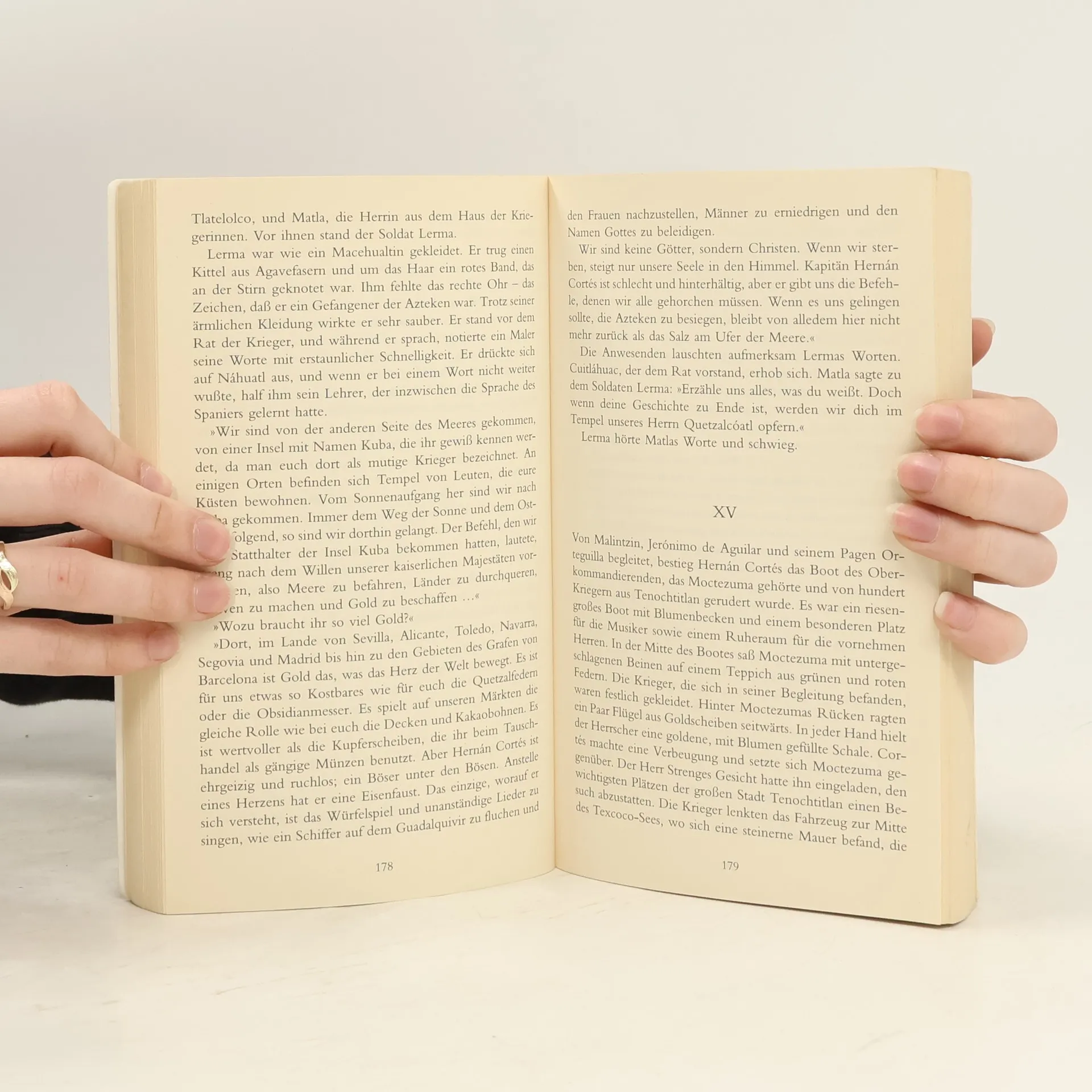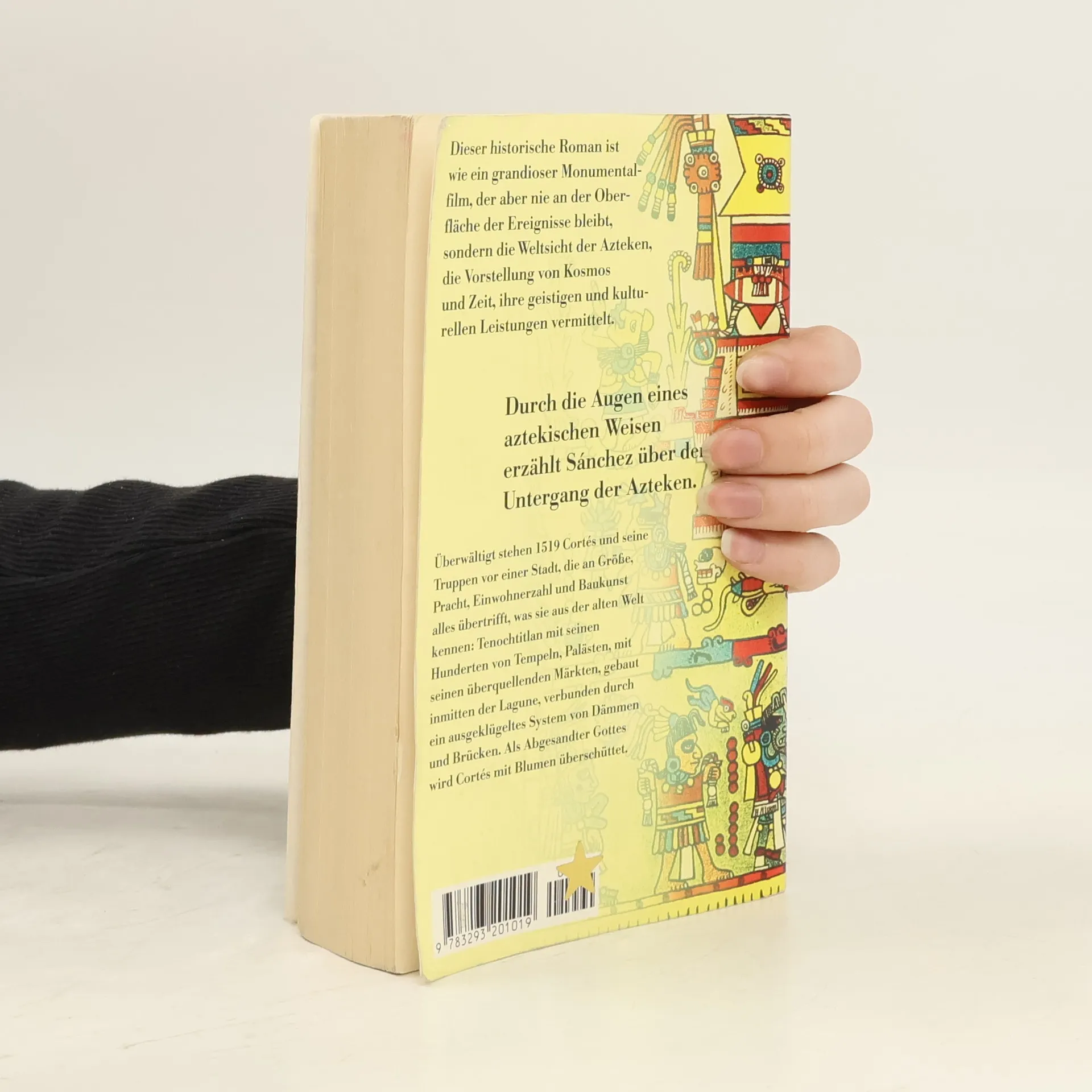Überwältigt stehen 1519 Cortés und seine Truppen vor einer Stadt, die an Größe, Pracht, Einwohnerzahl und Baukunst alles übertrifft, was sie aus der alten Welt kennen: Tenochtitlan. Als Abgesandter Gottes wird Cortés mit Blumen überschüttet. Danach hat die Gier nach Gold und Macht die reichste Stadt der Welt in Schutt und Asche gelegt. Durch die Augen eines aztekischen Weisen erzählt Sánchez über den Untergang der Azteken. Dieser historische Roman ist wie ein grandioser Monumentalfilm, der aber nie an der Oberfläche der Ereignisse bleibt, sondern die Weltsicht der Azteken, die Vorstellung von Kosmos und Zeit, ihre geistigen und kulturellen Leistungen vermittelt.