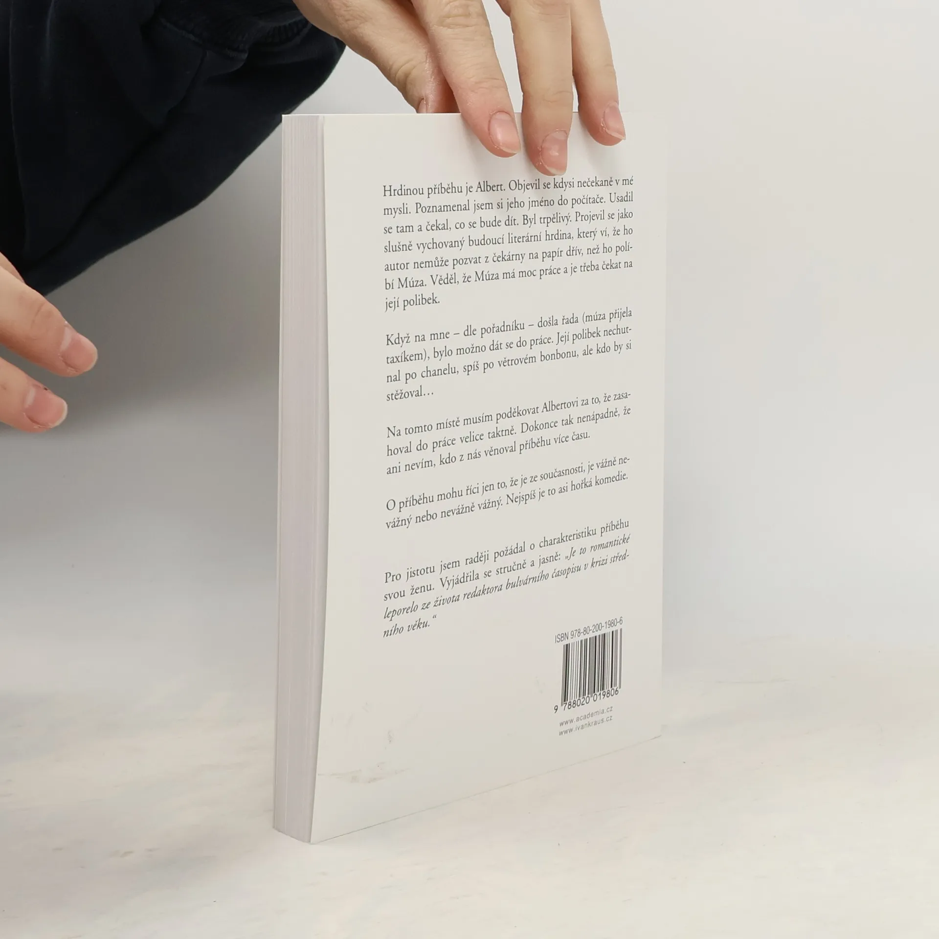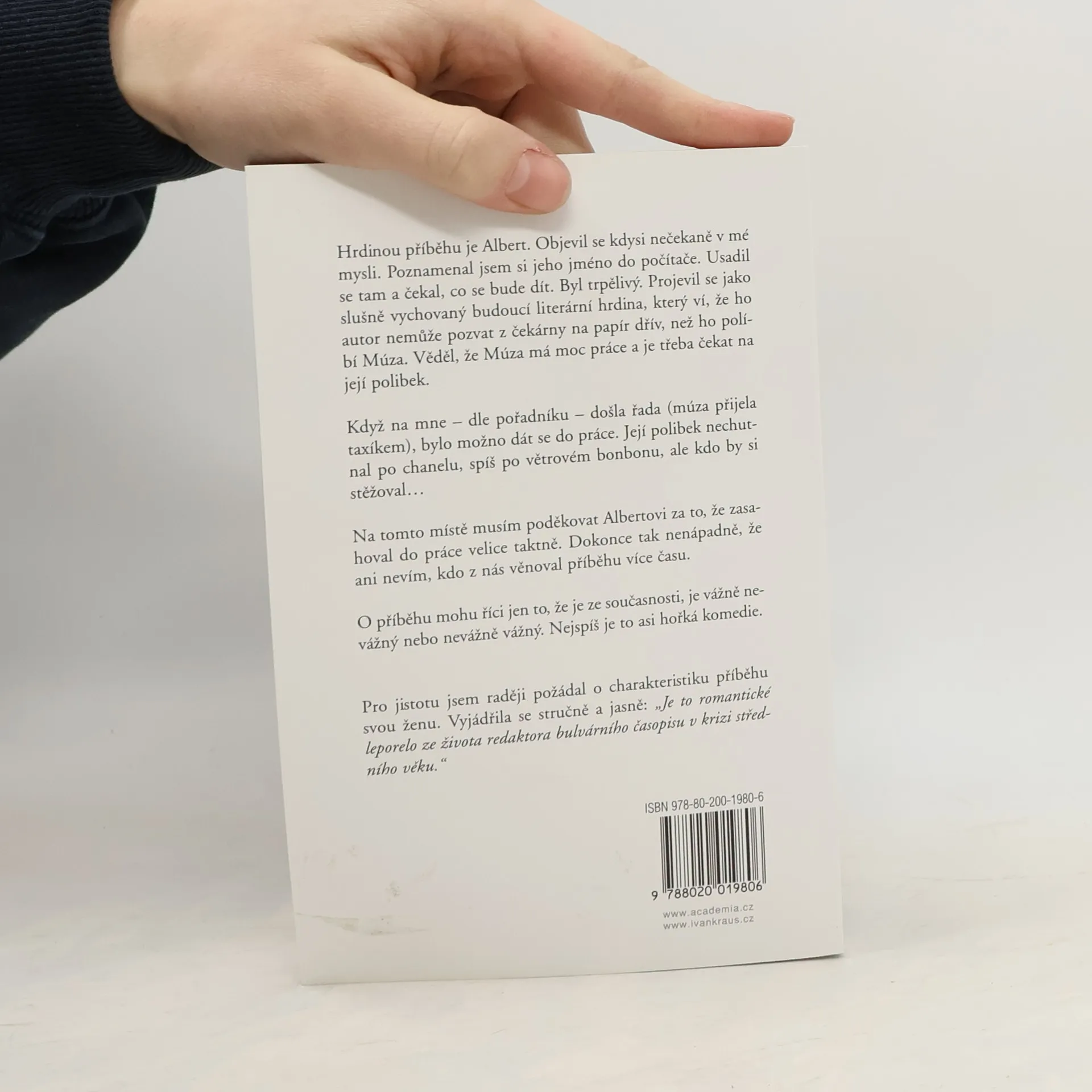 Hrdinou příběhu je Albert. Objevil se kdysi nečekaně v mé mysli. Poznamenal jsem si jeho jméno do počítače. Usadil se tam a čekal, co se bude dít. Byl trpělivý. Projevil se jako slušně vychovaný budoucí literární hrdina, který ví, že ho autor nemůže pozvat z čekárny na papír dřív, než ho políbí Múza. Věděl, že Múza má moc práce a je třeba čekat na její polibek. Když na mne - dle pořadníku - došla řada, /múza přijela taxíkem/, bylo možno se dát do práce. Její polibek nechutnal po Chanelu, spíš po větrovém bonbonu, ale kdo by si stěžoval… Na tomto místě musím poděkovat Albertovi, za to, že zasahoval do práce velice taktně. Dokonce tak nenápadně, že ani nevím, kdo z nás věnoval příběhu více času. O příběhu mohu říci jen to, že je ze současnosti, je vážně nevážný nebo nevážně vážný. Nejspíš je to asi hořká komedie. Pro jistotu jsem raději požádal o charakteristiku příběhu svou ženu. Vyjádřila se stručně a jasně: "Je to leporelo ze života redaktora bulvárního časopisu v krizi středního věku. Romantická komedie."