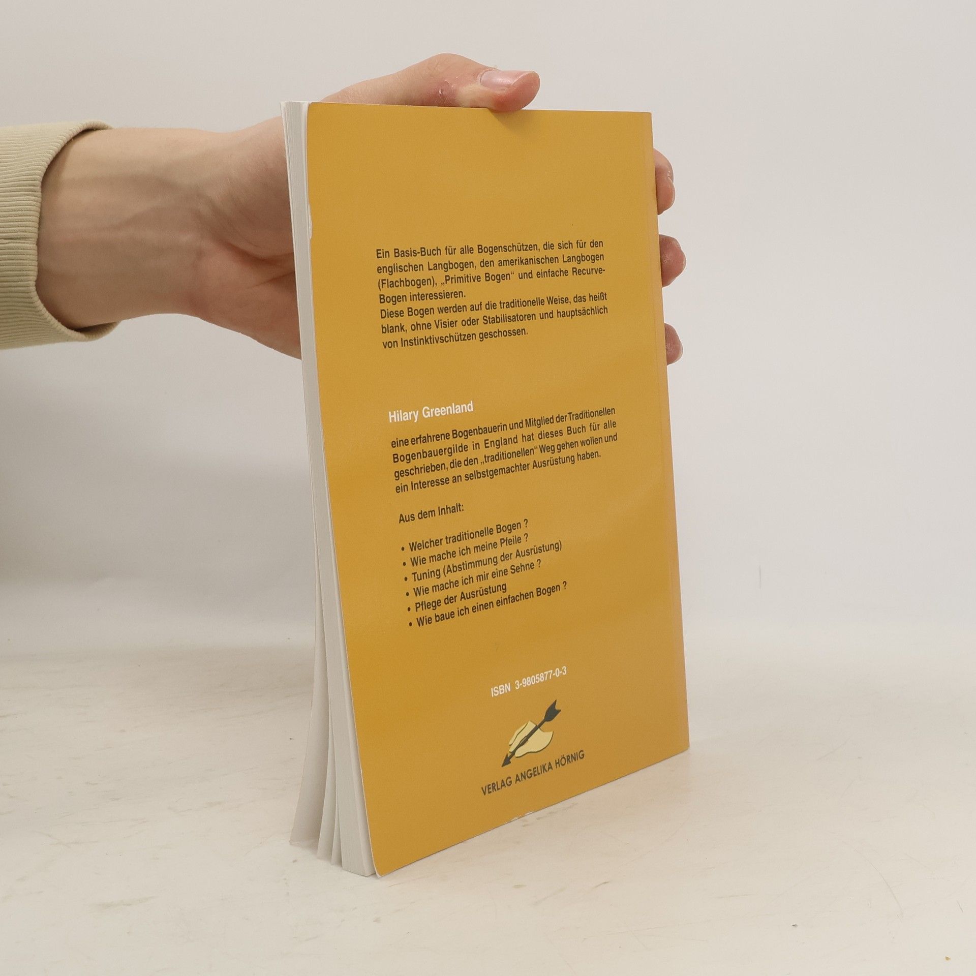 Ein Basis-Buch für alle Bogenschützen, die sich für den englischen Langbogen, amerikanische Flachbogen, "Primitive" Bogen und einfache Recurvebogen interessieren. Hilary Greenland, erfahrene Bogenbauerin und Mitglied der Traditionellen Bogenbauergilde in England, hat dieses Buch für alle geschrieben, die den "traditionellen Weg" gehen wollen und ein Interesse an selbstgemachter Ausrüstung haben. - Welcher traditionelle Bogen? - Welche Pfeile? - Tuning (Abstimmung der Ausrüstung) - Wie mache ich eine Sehne? - Pflege der Ausrüstung - Wie mache ich einen einfachen Bogen?