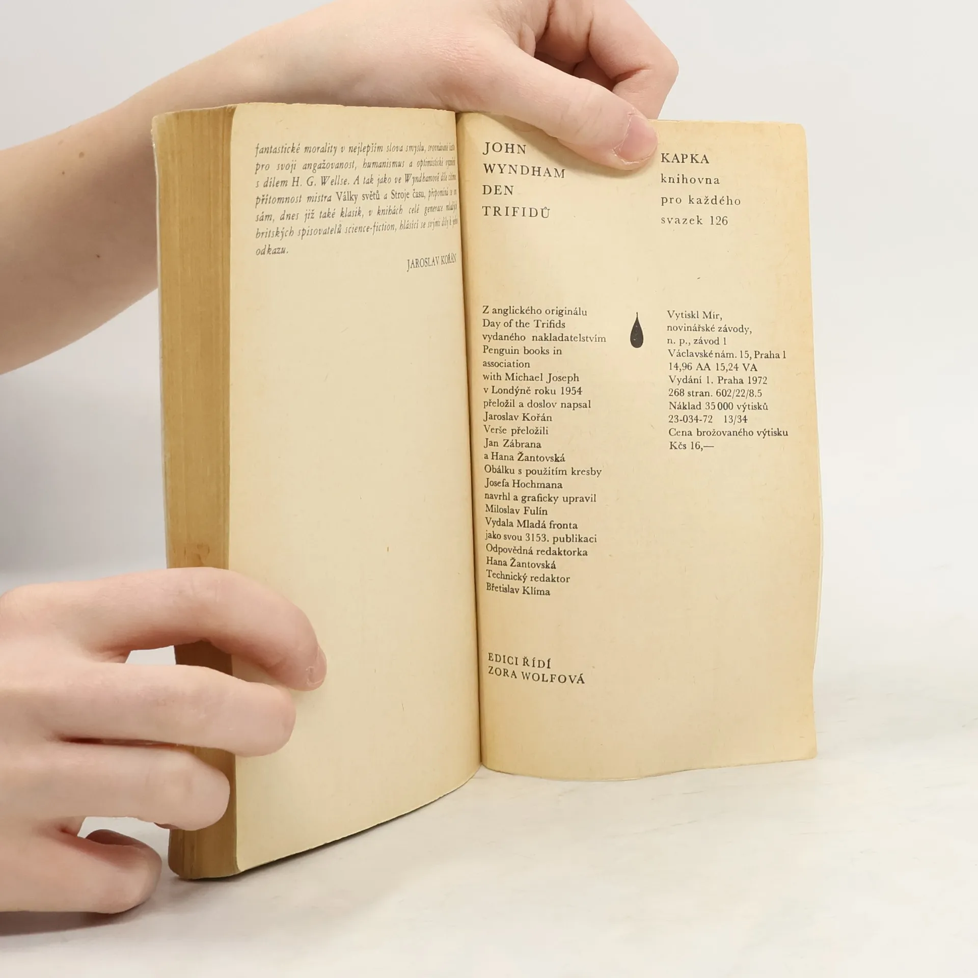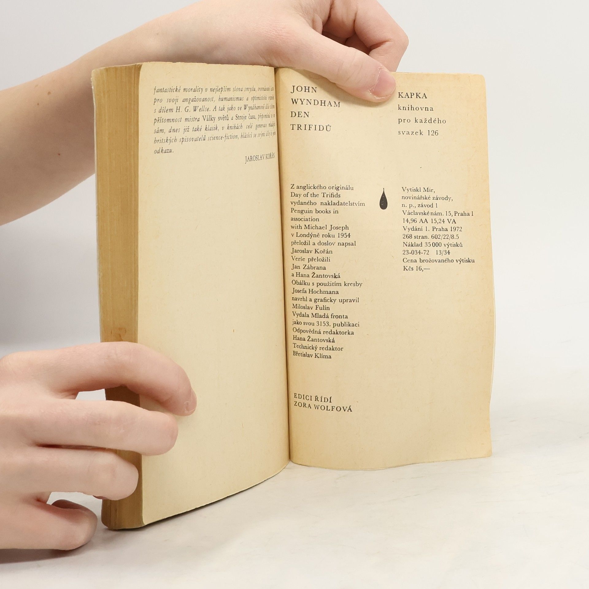 Román o tom, jak neznámý úkaz způsobí u většiny pozemšťanů slepotu a jak toho využijí průmyslové rostliny „trifidi“, které náhle vyvinou zcela nečekané vlastnosti a zaútočí na lidi, má v sobě dostatek prvků neobvyklosti, aby čtenáře přitahoval. Zároveň mu však nechybí onen welsovský obecný pohled na život a jeho reálné jádro, které z fantastického příběhu činí podobenství o skutečném ohrožení přírody člověkem a člověka přírodou. 23-034-72