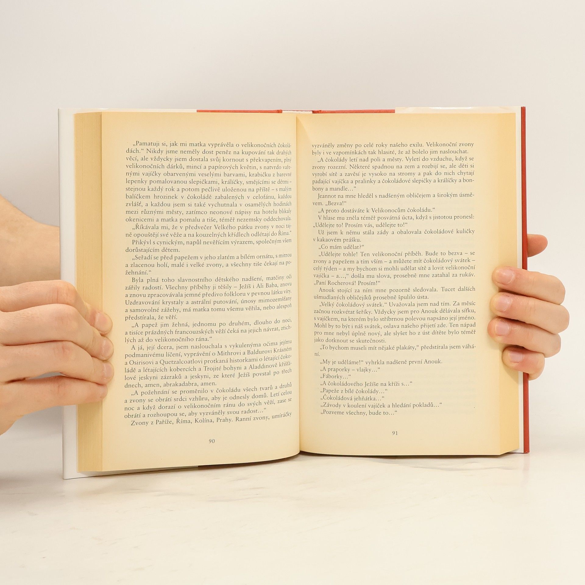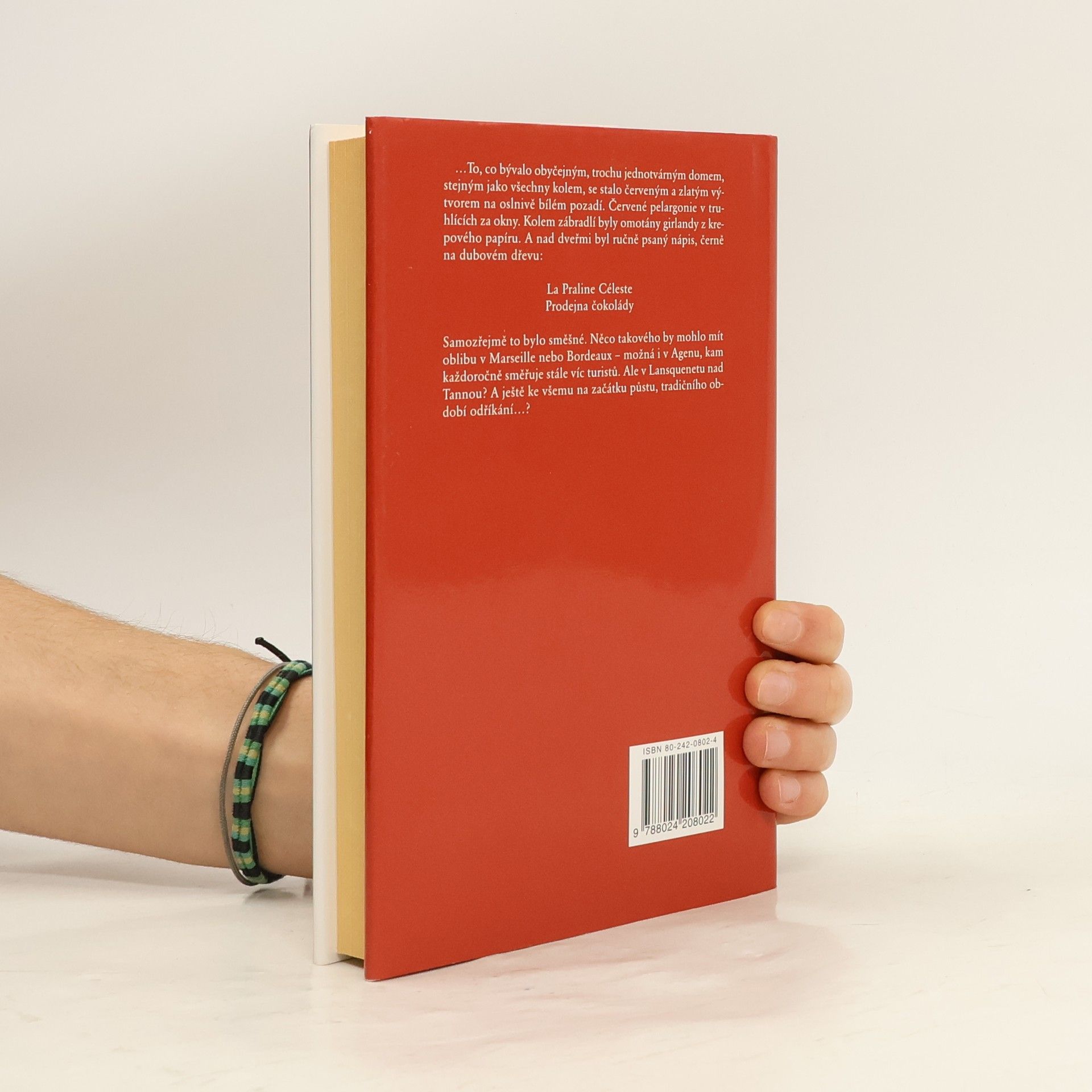 Když se do francouzské vesnice Lansquenet nad Tannou bůhvíodkud přistěhuje exoticky vyhlížející cizinka, Vianne Rocherová, a otevře si tu prodejnu čokolády přímo proti kostelu, otec Reynaud v ní od počátku vidí vážné nebezpečí pro své stádečko, především nyní, na počátku období půstu, kdy by si lidé měli tradičně odpírat světská potěšení. Kněz proto nově příchozí, v níž odhaluje pokušitelku k hříchu, vyhlašuje otevřený boj. Viannin obchod se najednou stává předmětem tajemné šeptandy, skvělou příležitostí pro donašeče, farizejsky rozhořčené ovzduším hříchu a toužícími se osvědčit jako poslušné ovečky. Na druhé straně krámek je místo, jež neodolatelně přitahuje mlsné jazýčky. Kdo by také mohl odolat tak sladkému pokušení? Za ty dva zdrávasy, které otec Reynaud za porušení půstu nařizuje, to přece stojí! Vianne se však svých odpůrců nezalekne a rozhodne se, že na Velikonoce uspořádá Čokoládový festival. Její plán rozdělí obec na dva tábory. Následuje střet, jenž je církví vyostřen v "čokoládovou bitvu". Začíná to vypadat, že velebnost církve může být ohrožena pohanskou vášní pro čokoládové opojení. Můžete si být jisti, že při čtení tohoto hravého a možná i trochu uličnického příběhu budete mít bez ustání chuť na čokoládu.