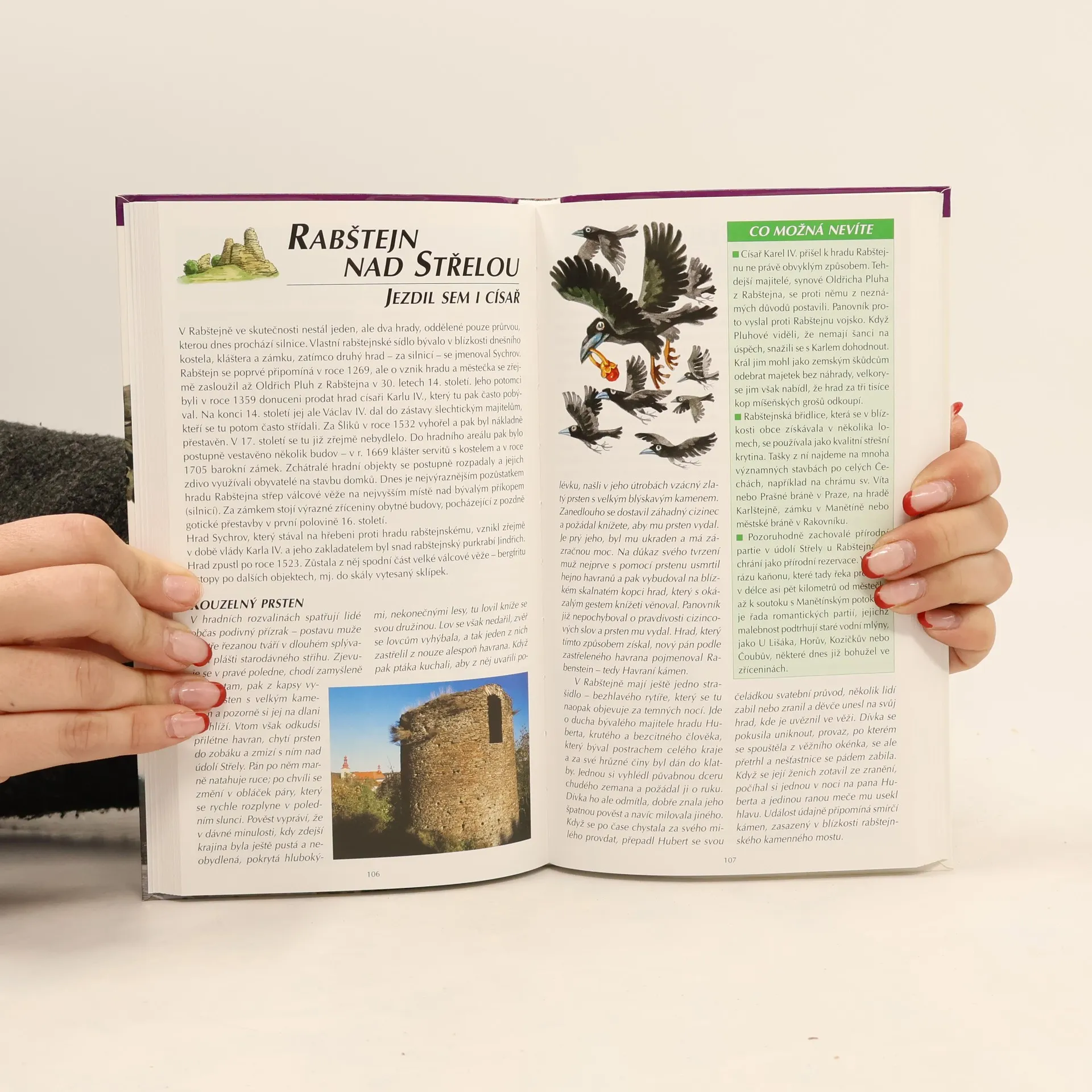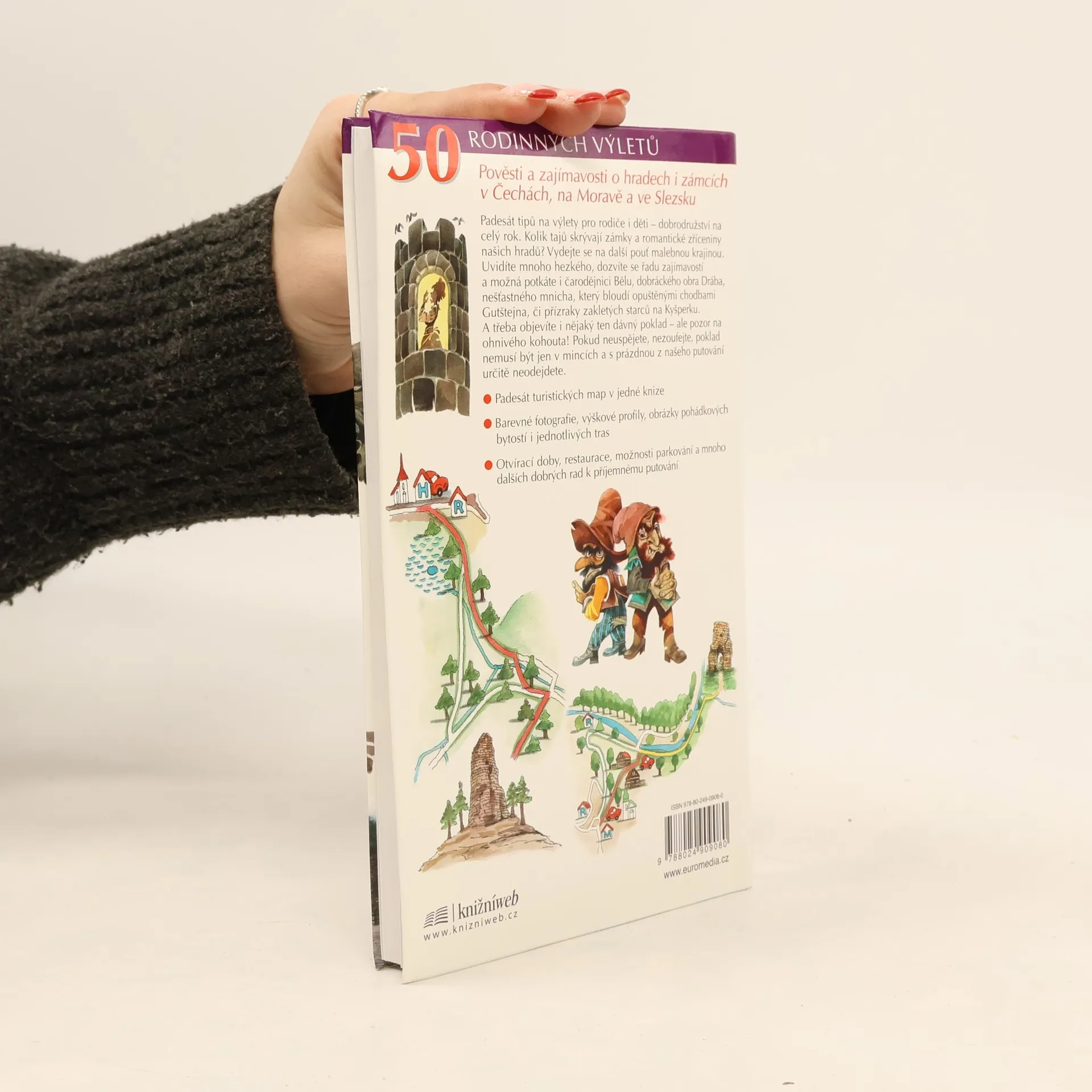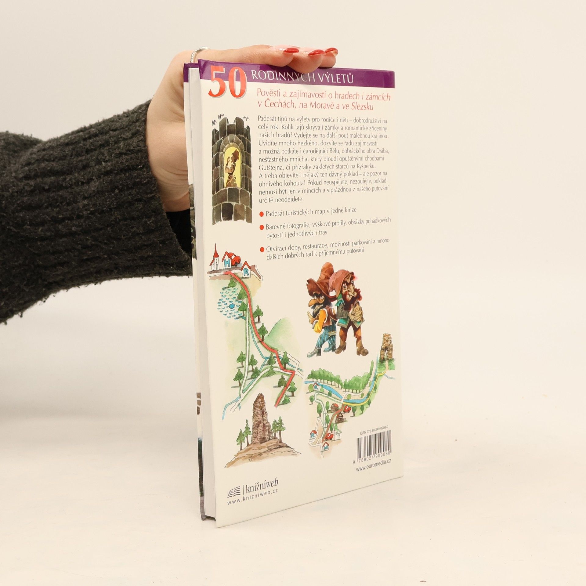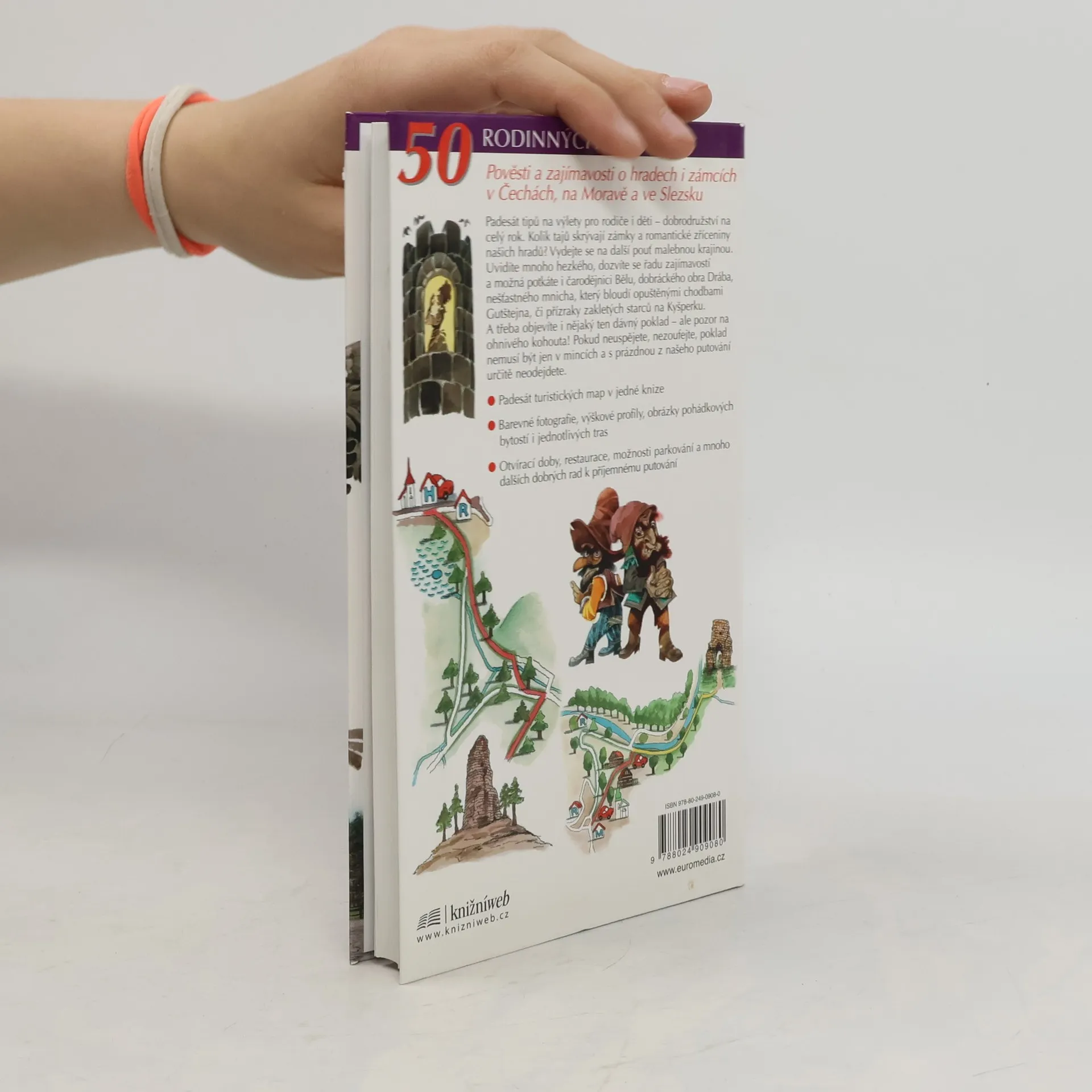 Padesát tipů na výlety pro rodiče i děti - dobrodružství na celý rok. Kolik tajů skrývají zámky a romantické zříceniny našich hradů? Vydejte se na další pouť malebnou krajinou. Uvidíte mnoho hezkého, dozvíte se řadu zajímavostí a možná potkáte i čarodějnici Bělu, dobráckého obra Drába, nešťastného mnicha, který bloudí opuštěnými chodbami Gutštejna, či přízraky zakletých starců na Kyšperku. A třeba objevíte i nějaký ten dávný poklad - ale pozor na ohnivého kohouta! Pokud neuspějete, nezoufejte, poklad nemusí být jen v mincích a s prázdnou z našeho putování určitě neodejdete. Padesát turistických map v jedné knize. Barevné fotografie, výškové profily, obrázky pohádkových bytostí i jednotlivých tras, otvírací doby, restaurace, možnosti parkování a mnoho dalších dobrých rad k příjemnému putování