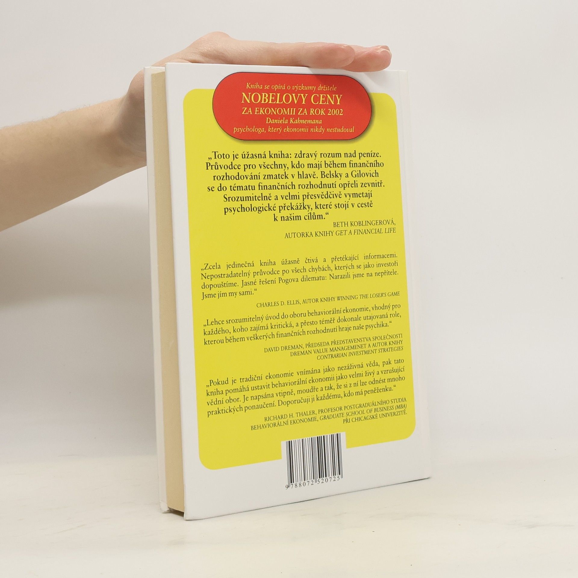 A jak tyto chyby napravit Toto je úžasná kniha: zdravý rozum nad peníze. Průvodce pro všechny, kdo mají během finančního rozhodování zmatek v hlavě. Belsky a Gilovich se do tématu finančních rozhodnutí opřeli zevnitř. Srozumitelně a velmi přesvědčivě vymetají psychologické překážky, které stojí v cestě k našim cílům.