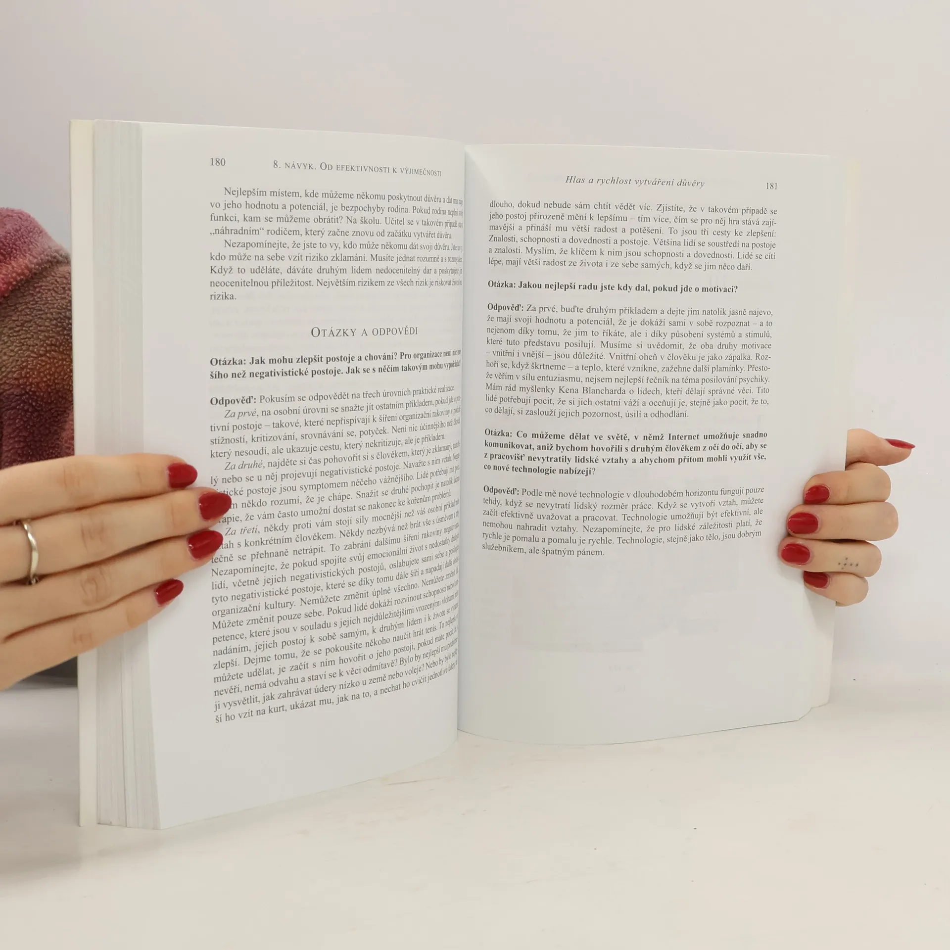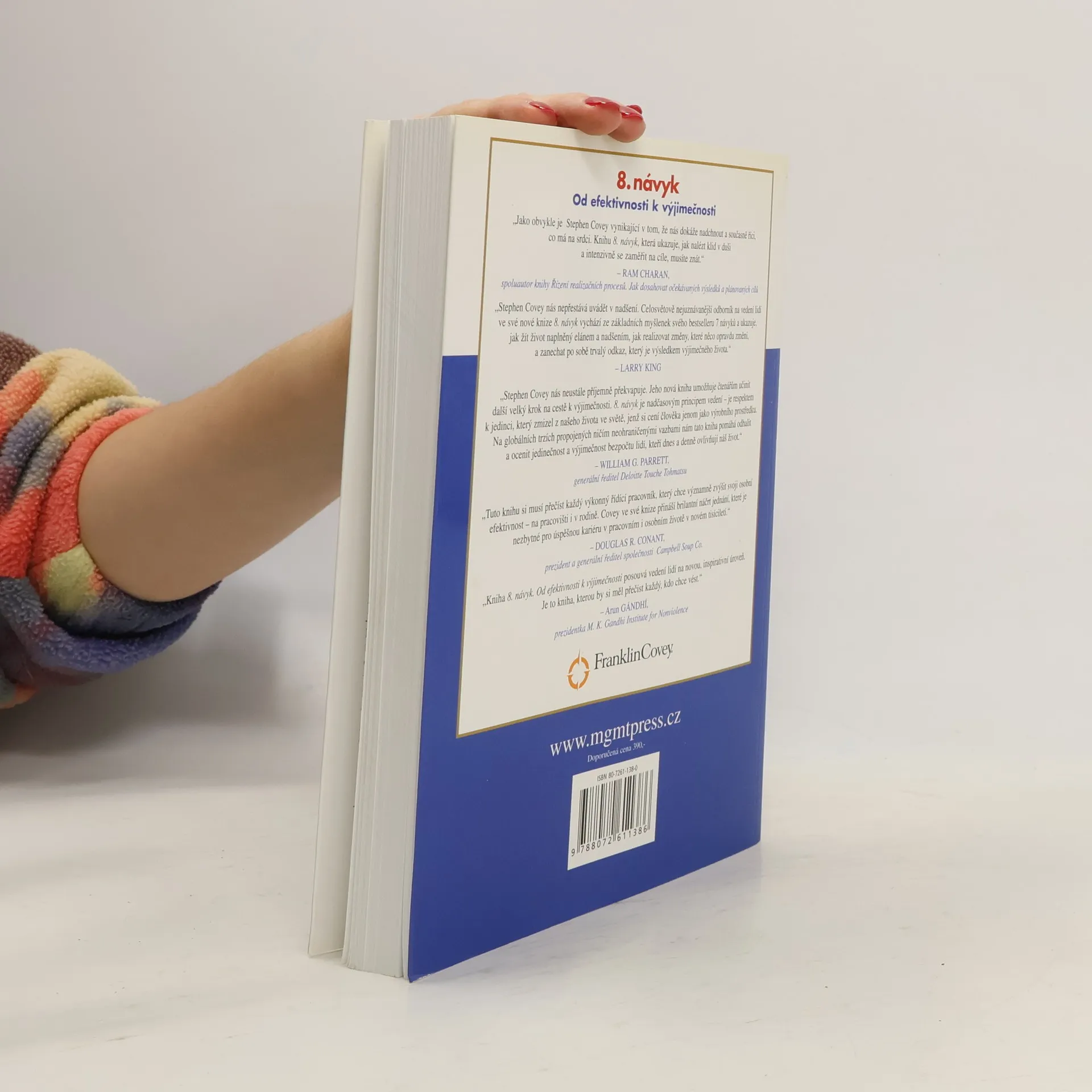 Kniha proslulého autora a rádce, jehož "7 návyků vůdčích osobností" je považováno za jednu z nejvlivnějších knih 20. století, se zaměřuje na osvojování si potřebného nového návyku, jenž v nové době informací a znalostí umožní člověku nalézt cestu k prosazení osobní výjimečnosti a k sebeuspokojení v pracovním i v osobním životě. Musíme se naučit řídit se svým vnitřním hlasem (najít sebe sama, být si vědomi své jedinečnosti a rozvíjet své vrozené nadání) a pomáhat druhým, aby totéž dokázali i oni. Covey tedy zároveň ukazuje, jak principy upevňující 8. návyk a umožňující přechod od "efektivnosti k výjimečnosti" uplatnit také v životě organizací. Vyšlo ve spolupráci se společností FranklinCovey Czech.