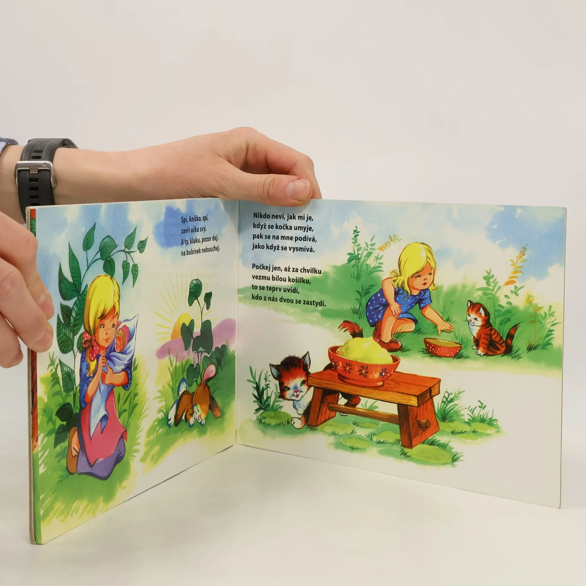 Rozkládací leporelo s půvabnými barevnými realistickými ilustracemi Zsuzsy Radvány uvádí výjevy ze života dětí na venkově, které doprovázejí známé lidové říkanky a verše.