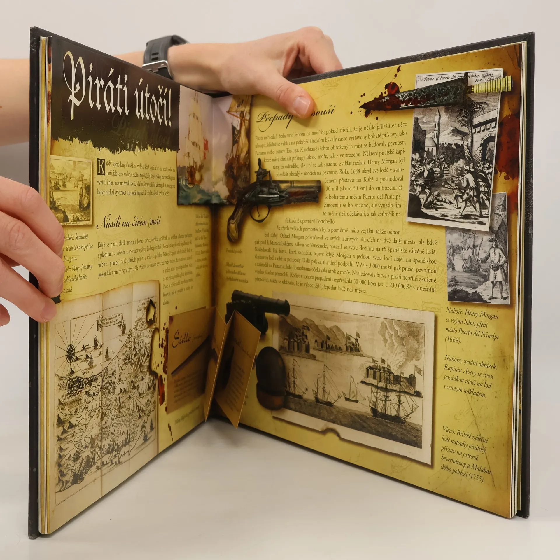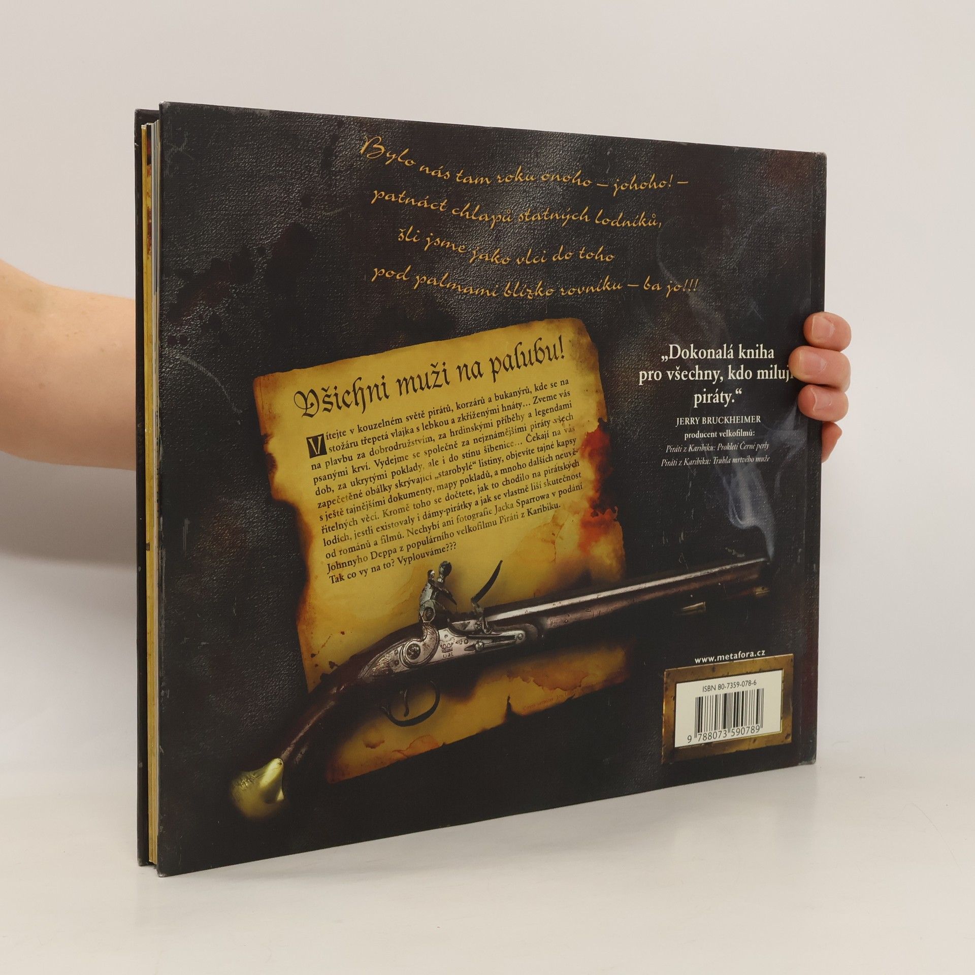 Jak je to dlouho, co jste si naposledy hráli? Anebo už si zase hrajete s dětmi či dokonce s vnoučaty? Ať je to ale tak či onak, nabízíme vám dokonalou inspiraci. O naší nejnovější knize pirátské historie se nedá říct, že by byla obrázková, přestože spoustu obrázků a fotografií v ní samozřejmě naleznete. Kromě toho v ní ale objevíte i zapečetěné obálky skrývající starobylé listiny, zatykače, pirátské zákony a rozsudky, které si můžete vyndat a rozložit. Čekají na vás tajné kapsy s ještě tajnějšími písemnostmi, mapy pokladů, vlepené galerie nejslavnějších korzárů, arzenál zbraní a mnoho dalších neuvěřitelných věcí jako je třeba slovníček pirátského slangu. A když si zrovna nebudete hrát, můžete si na krásně vyvedených stránkách přečíst něco o tom, jak to chodilo na pirátských lodích, jestli existovaly i dámy-pirátky a jak se vlastně liší skutečnost od románů a filmů. Nechybí ani fotografie Jacka Sparowa v podání Johnnyho Deppa z populárního velkofilmu Piráti z Karibiku. Tak co vy na to? Vyplouváme? Japonská vazba (jednostranně potištěné dvoulisty svázané do hřbetu knihy volnými okraji)