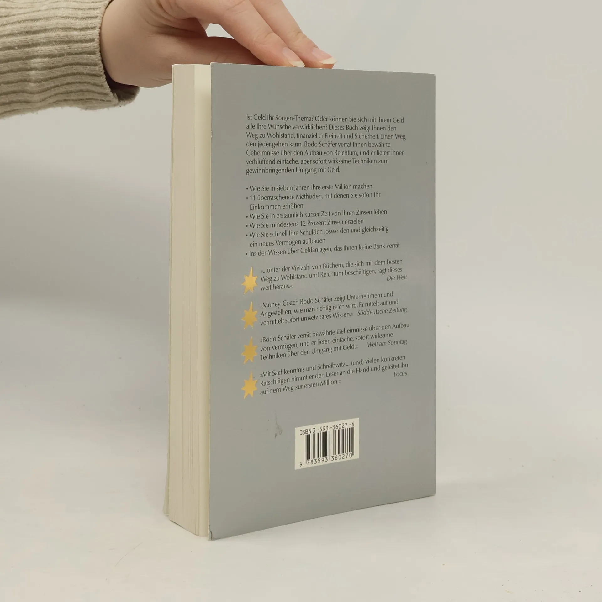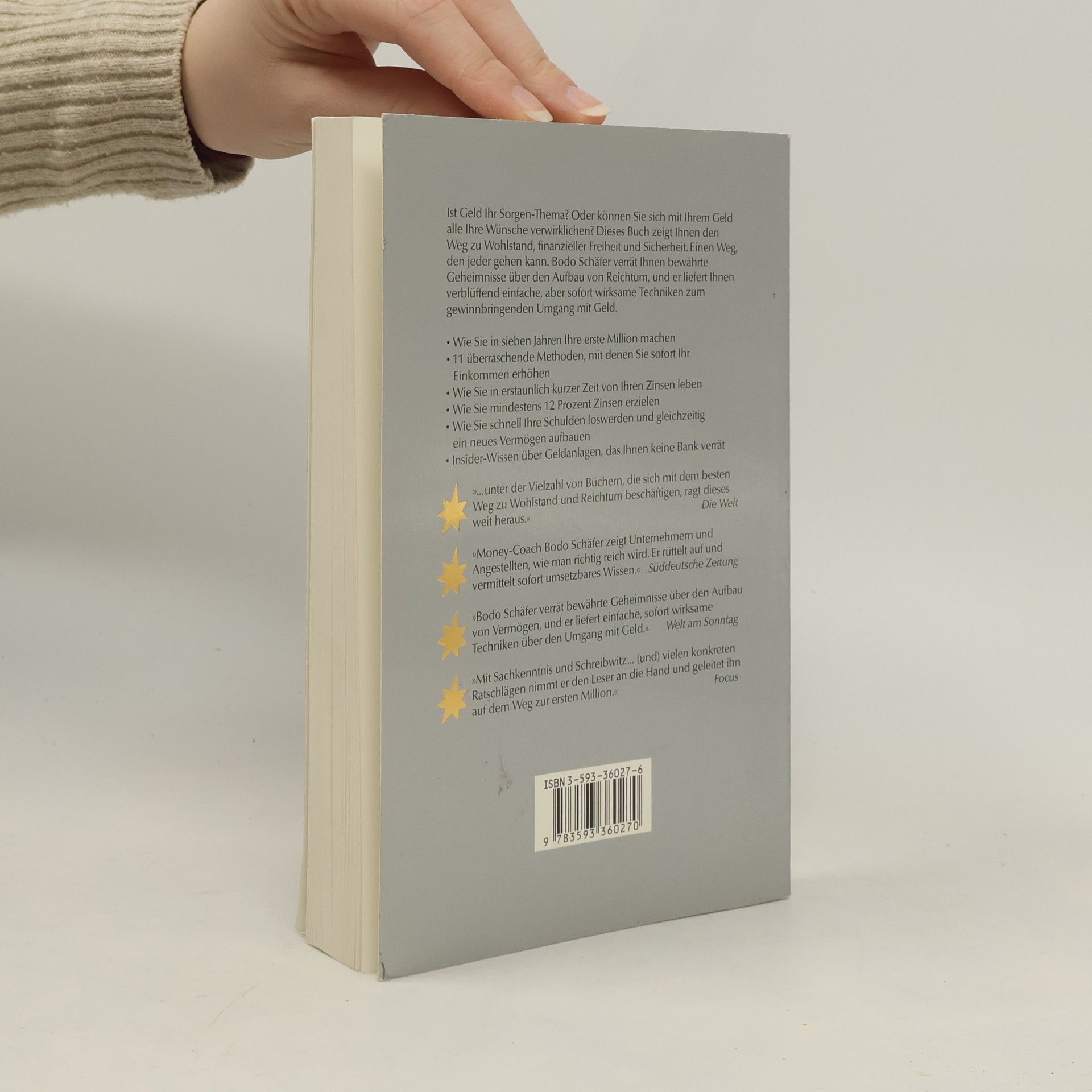 Ist Geld Ihr Sorgen-Thema? Oder können Sie sich mit Ihrem Geld alle Ihre Wünsche verwirklichen? Dieses Buch zeigt Ihnen den Weg zu Wohlstand, finanzieller Freiheit und Sicherheit. Einen Weg, den jeder gehen kann. Bodo Schäfer verrät Ihnen bewährte Geheimnisse über den Aufbau von Reichtum, und er liefert Ihnen verblüffend einfache, aber sofort wirksame Techniken zum gewinnbringenden Umgang mit Geld. - Wie Sie in sieben Jahren Ihre erste Million machen - 11 überraschende Methoden, mit denen Sie sofort Ihr Einkommen erhöhen - Wie Sie in erstaunlich kurzer Zeit von Ihren Zinsen leben - Wie Sie mindestens 12 Prozent Zinsen erzielen - Wie Sie schnell Ihre Schulden loswerden und gleichzeitig ein neues Vermögen aufbauen - Insider-Wissen über Geldanlagen, das Ihnen keine Bank verrät „ ... unter der Vielzahl von Büchern, die sich mit dem besten Weg zu Wohlstand und Reichtum beschäftigen, ragt dieses weit heraus.“ Die Welt „Money-Coach Bodo Schäfer zeigt Unternehmern und Angestellten, wie man richtig reich wird. Er rüttelt auf und vermittelt sofort umsetzbares Wissen.“ Süddeutsche Zeitung „Bodo Schäfer verrät bewährte Geheimnisse über den Aufbau von Vermögen, und er liefert einfache, sofort wirksame Techniken über den Umgang mit Geld.“ Welt am Sonntag „Mit Sachkenntnis und Schreibwitz ... (und) vielen konkreten Ratschlägen nimmt er den Leser an die Hand und geleitet ihn auf dem Weg zur ersten Million.“ Focus