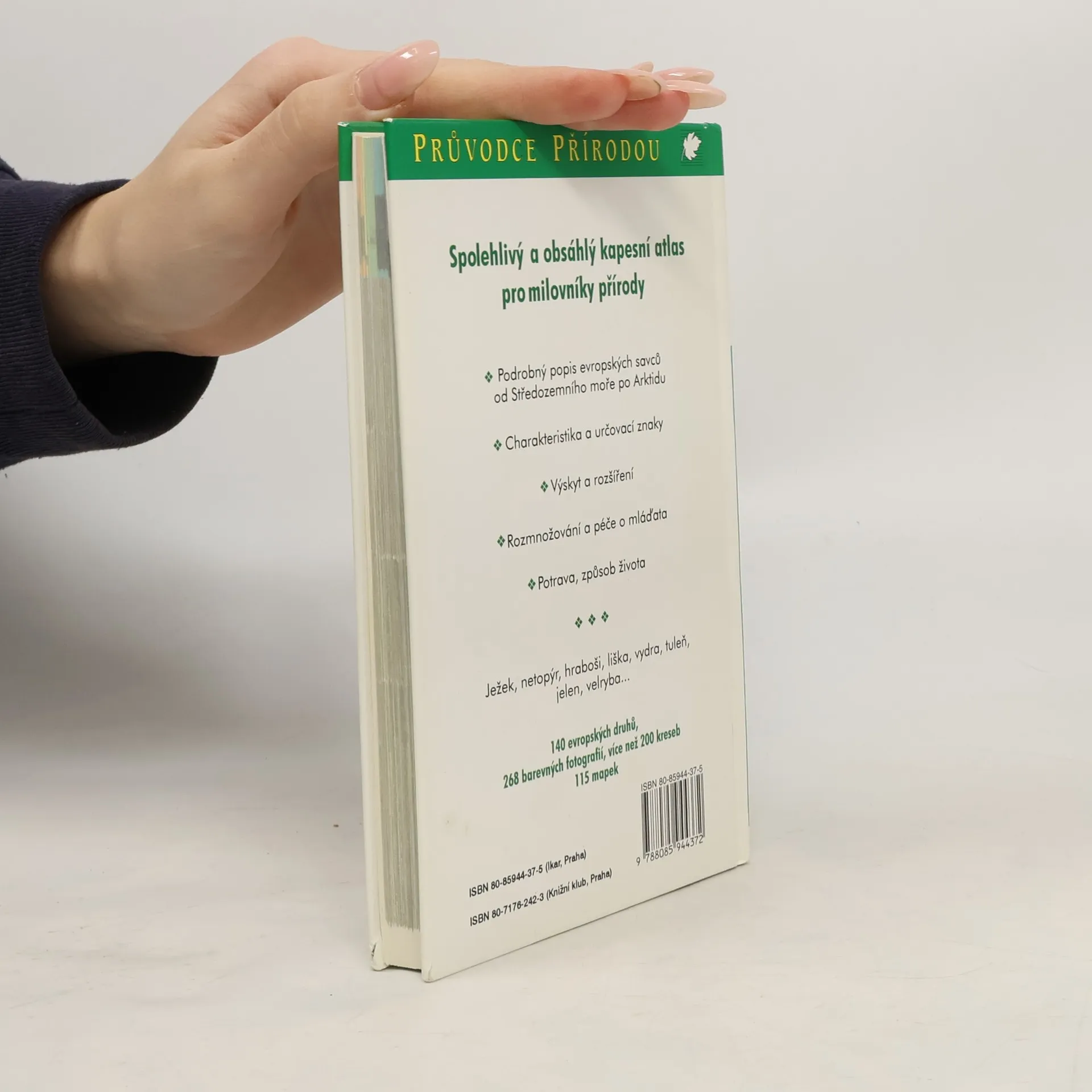 Obrazový atlas evropských druhů savců. Kapesní atlas s krásnými fotografiemi představuje nejtypičtější a nejzajímavější druhy evropských savců. Texty u fotografií charakterizují stručně živočichy, poskytují informace o způsobu jejich života, rozšíření, rozmnožování, o jejich chování a ekologické roli v přírodě. Kniha je členěna systematicky, devět řádů savců je označeno na okrajích stránek symboly se siluetami jejich zástupců. Připojeny jsou i charakteristiky jednotlivých řádů.