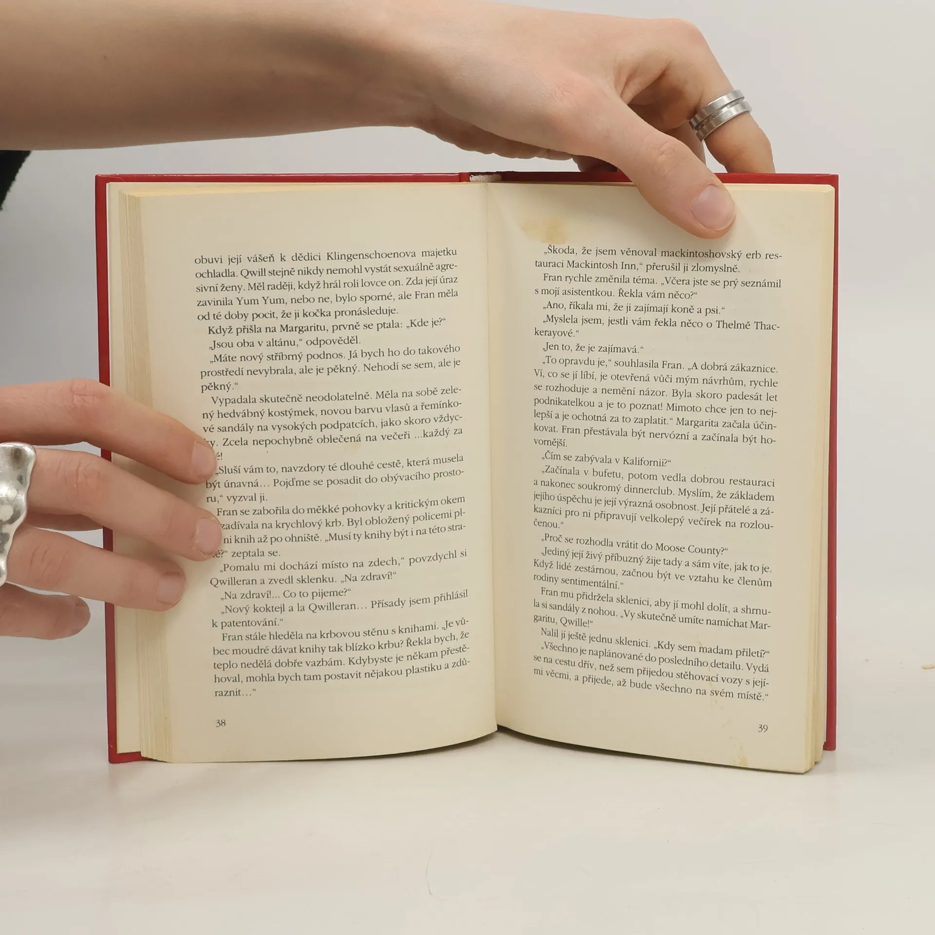 Všichni obyvatelé městecka Pickaxu zvedavě čekají na příjezd známé herečky Thelmy Thackerayové, která se vrací do svého rodište. Při té příležitosti má být slavnostně zahájen provoz nového kina. Stane se toho však mnohem víc. Rozruch vyvolá zmizení Thelminých oblíbených papoušků, vzápětí je zastřelen muž a někdo okrade novináře Qwillerana. Naštestí jeho kocour Koko, který některé lidi nemůze ani cítit, zachytí stopu. Proč si ale tolik oblíbil knihy Roberta Louise Stevensona?