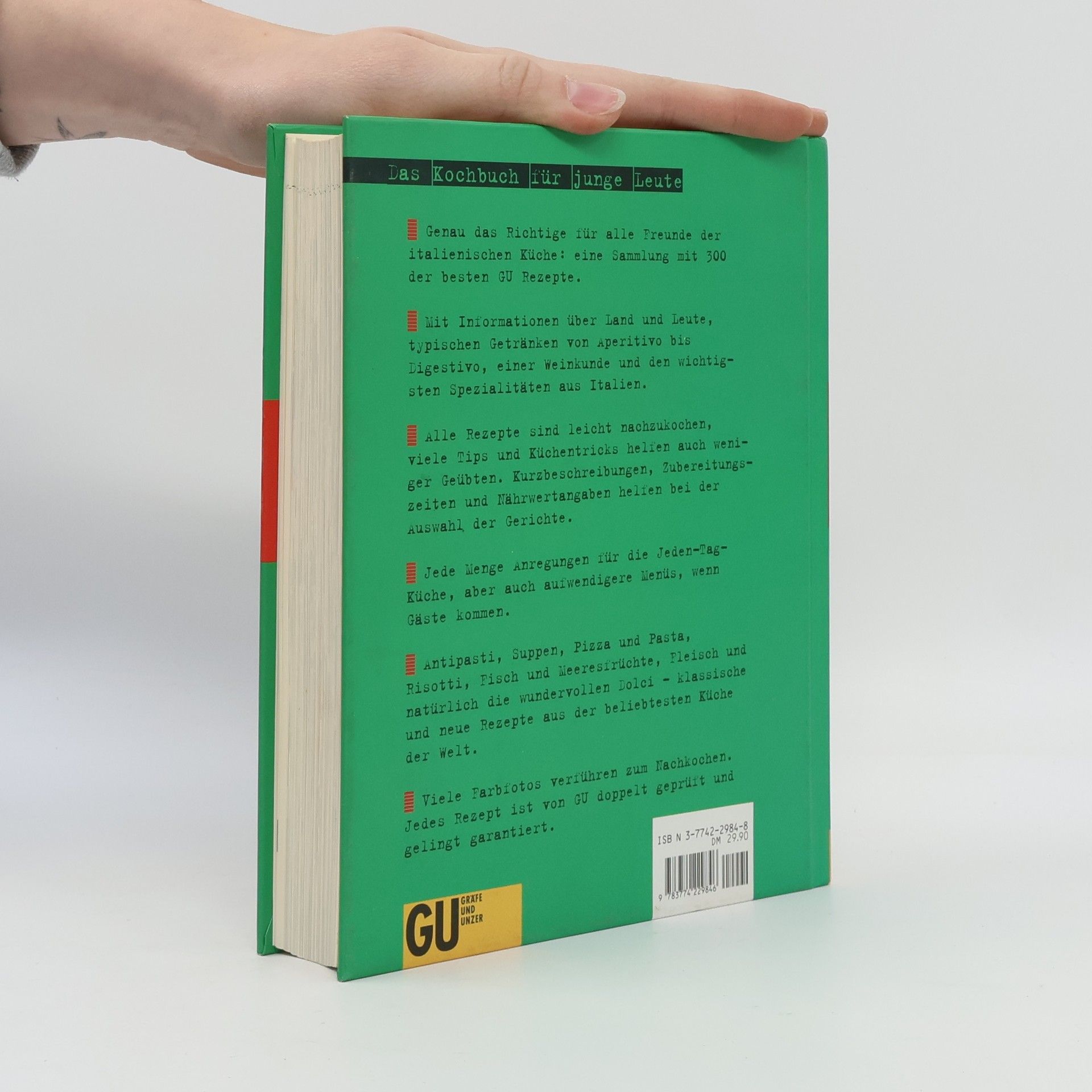 Für dieses Kochbuch wurden 300 der besten Rezepte der italienischen Regionalküchen ausgewählt und leicht verständlich umgesetzt. Alle Rezepte sind leicht nachzukochen, schwierige Handgriffe werden mit Fotos Schritt für Schritt erklärt. Dazu gibt es interessante Informationen zu Land, Leuten und italienischen Festen, eine Getränkekunde, eine ausführliche Warenkunde, zum Beispiel zu Öl, Essig oder Käse sowie Menüvorschläge von schnell bis festlich.